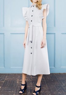 Такие элементы, как воланы, наряду с пастельно-конфетной цветовой гаммой, создают эффект юности, присущий коллекции. Он поддерживается дерзкими деталями, позаимствованными из девяностых, - кроп-топами, обнажающими полоску живота, и трапециевидными мини-юбками с вертикальным рядом пуговиц, как бы продолжающих застежку рубашки. Подобный девичий образ созвучен самоощущению современной женщины, которая в свои тридцать запросто может позволить себе путешествовать, тусоваться и носить рубашки в «сердечко». Этот принт второй сезон подряд появляется на моделях марки, будто отдавая должное диджитал-тенденции на «лайки» в социальных сетях. Помимо символов любви, в коллекции присутствует полоска, клетка и леопард, но все узоры отличаются предельной деликатностью: издалека можно и вовсе не догадаться о наличии рисунка или не распознать в мелкой графике сердца и пятна хищника.