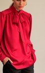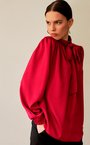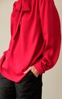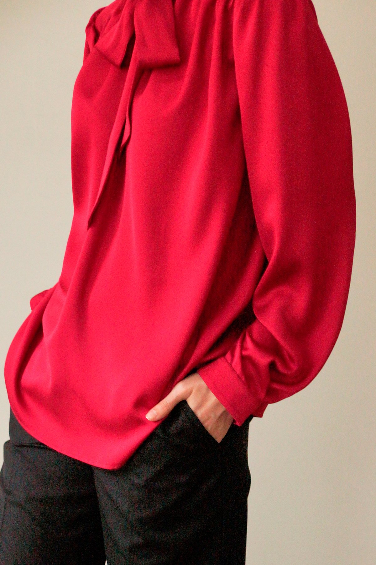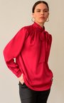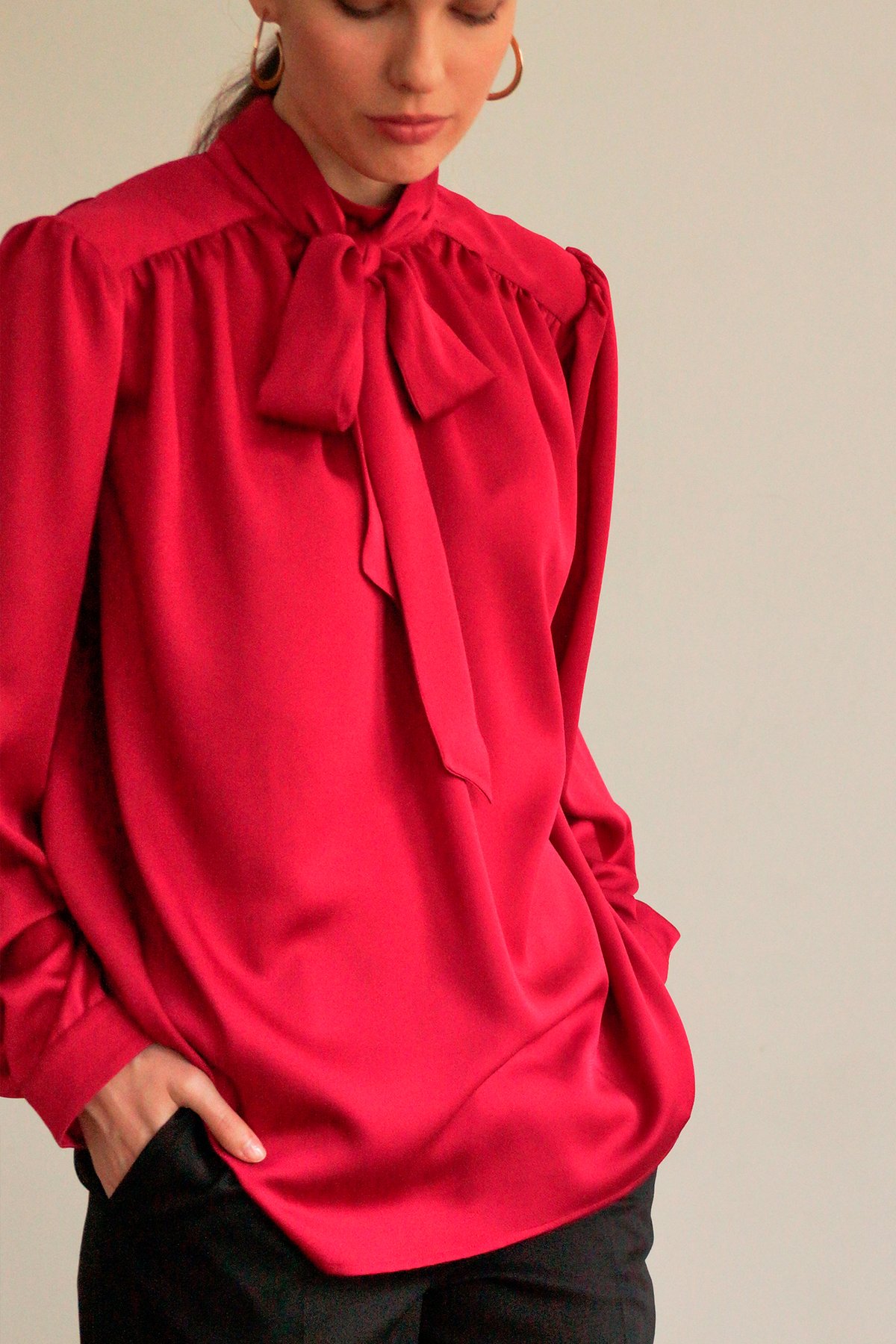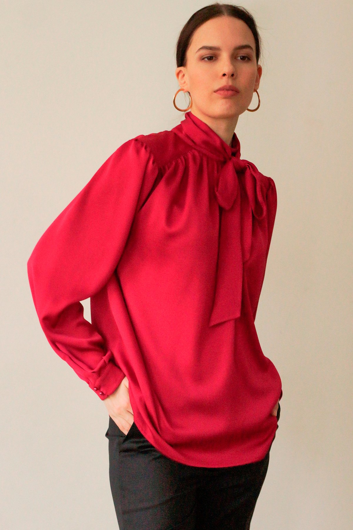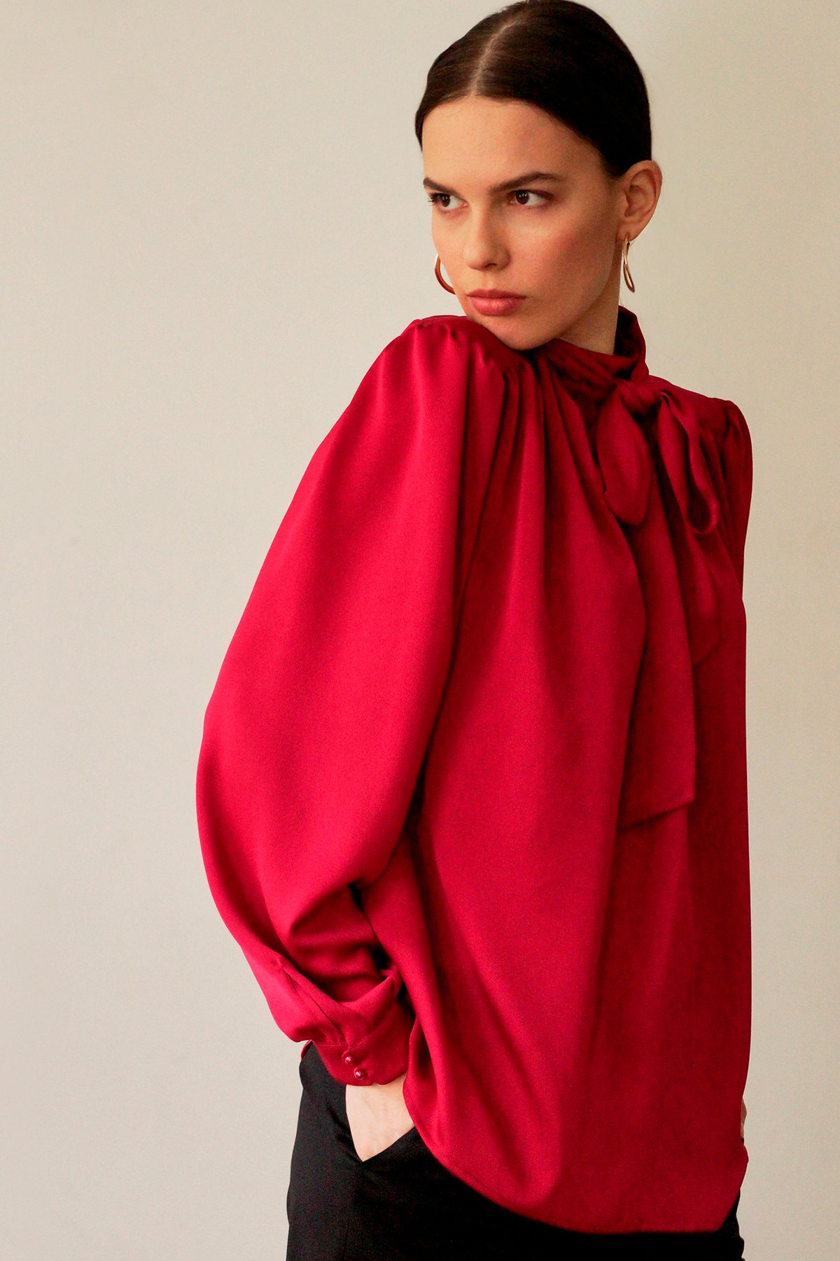 Блуза с бантом из вискозной ткани брусничного оттенка. Ворот стойка с застёжкой на пуговицу на спине. Складки на плечах, свободный рукав.