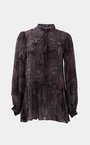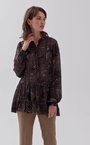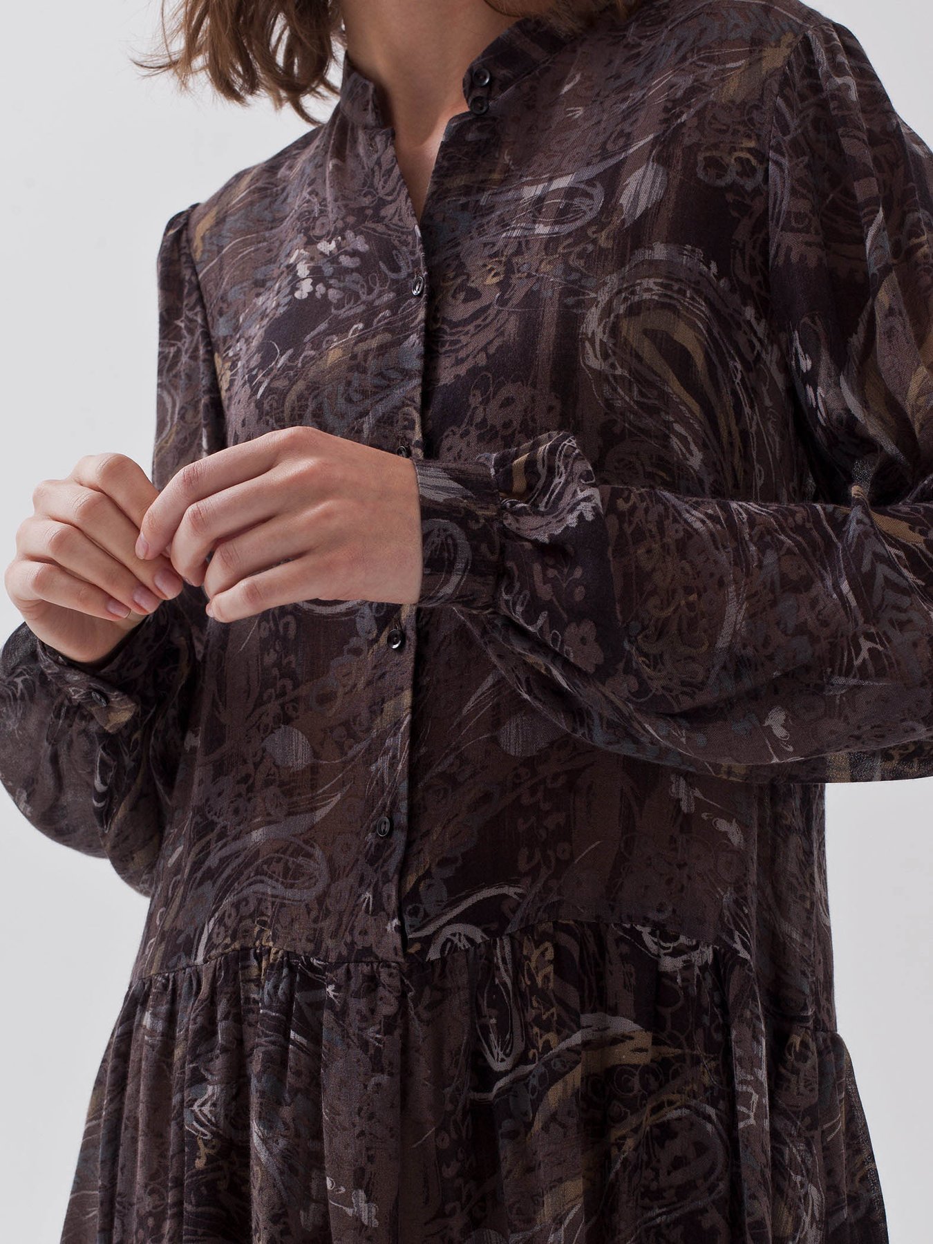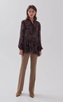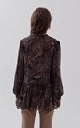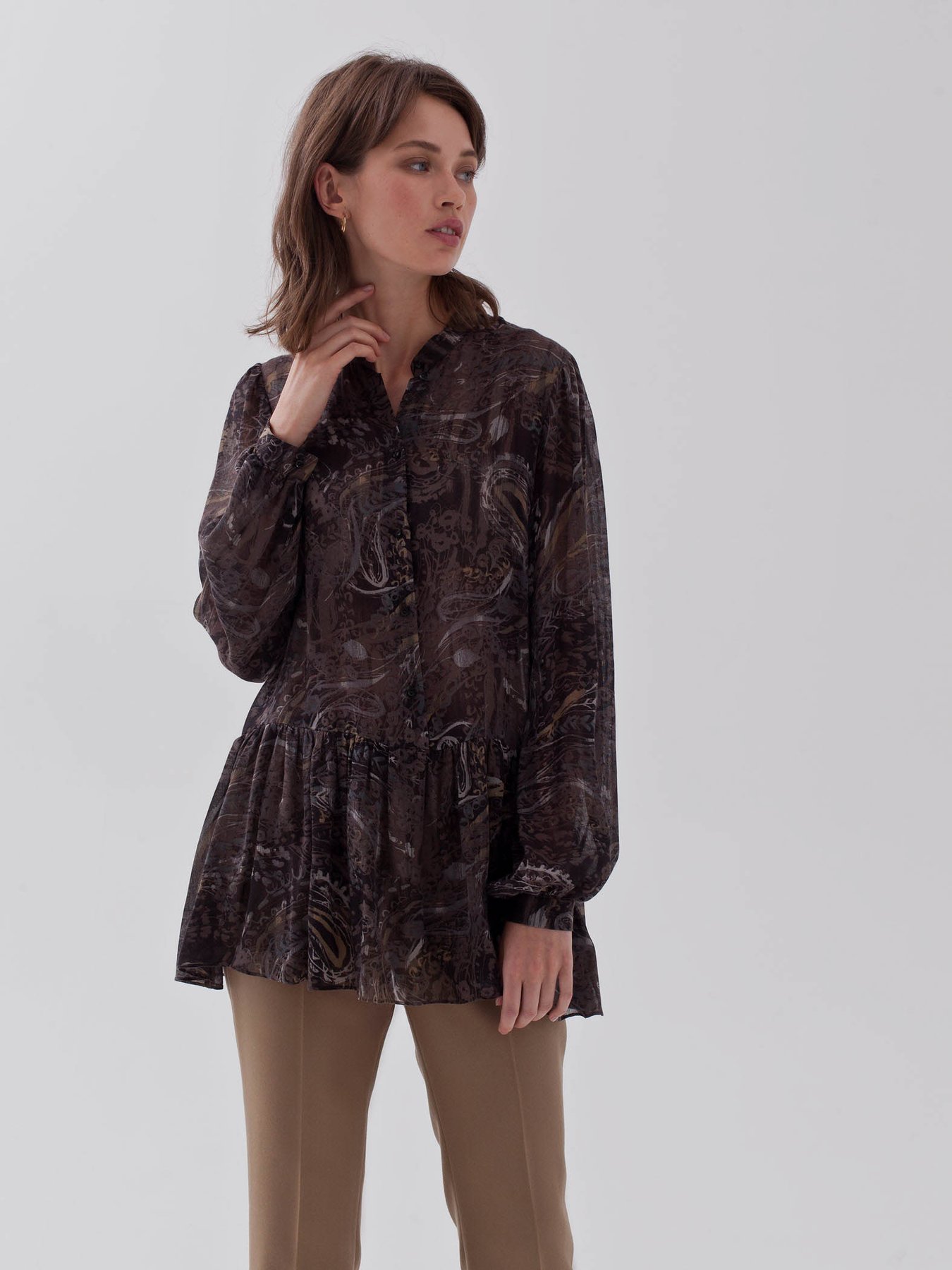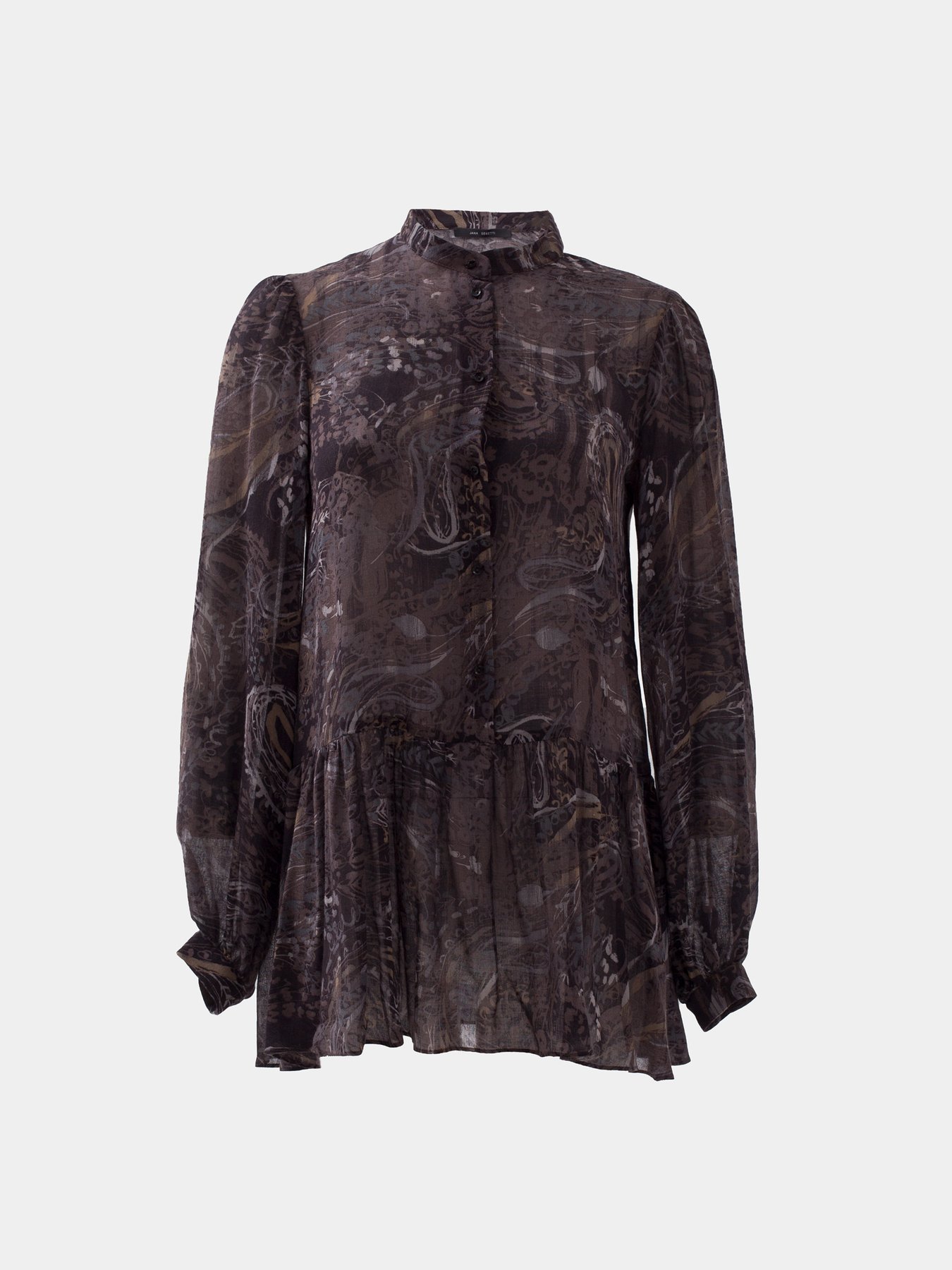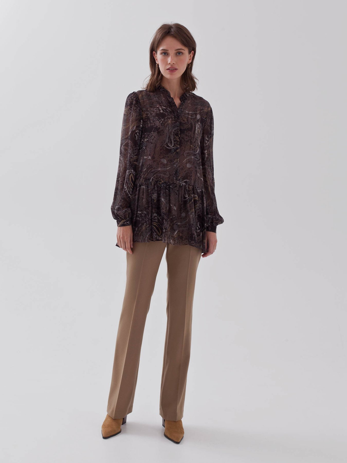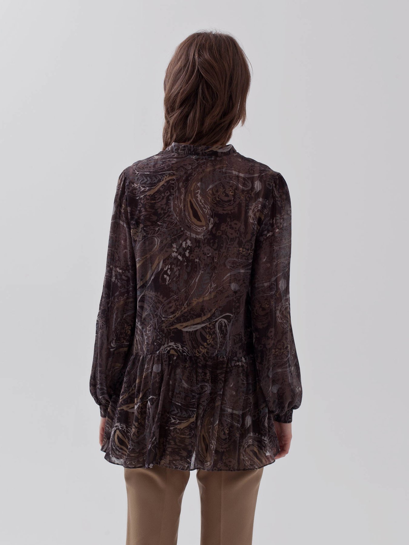 Блуза из тонкой полупрозрачной шерстяной ткани с принотм "пейсли"(индийский огурец) коричневого оттенка. Модель с воротом стойкой и воланом.