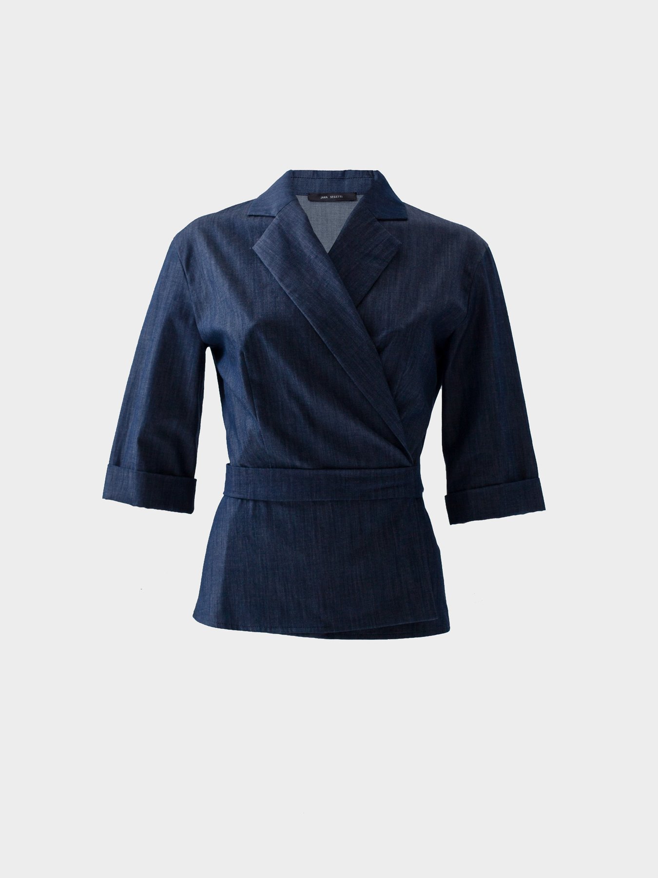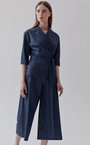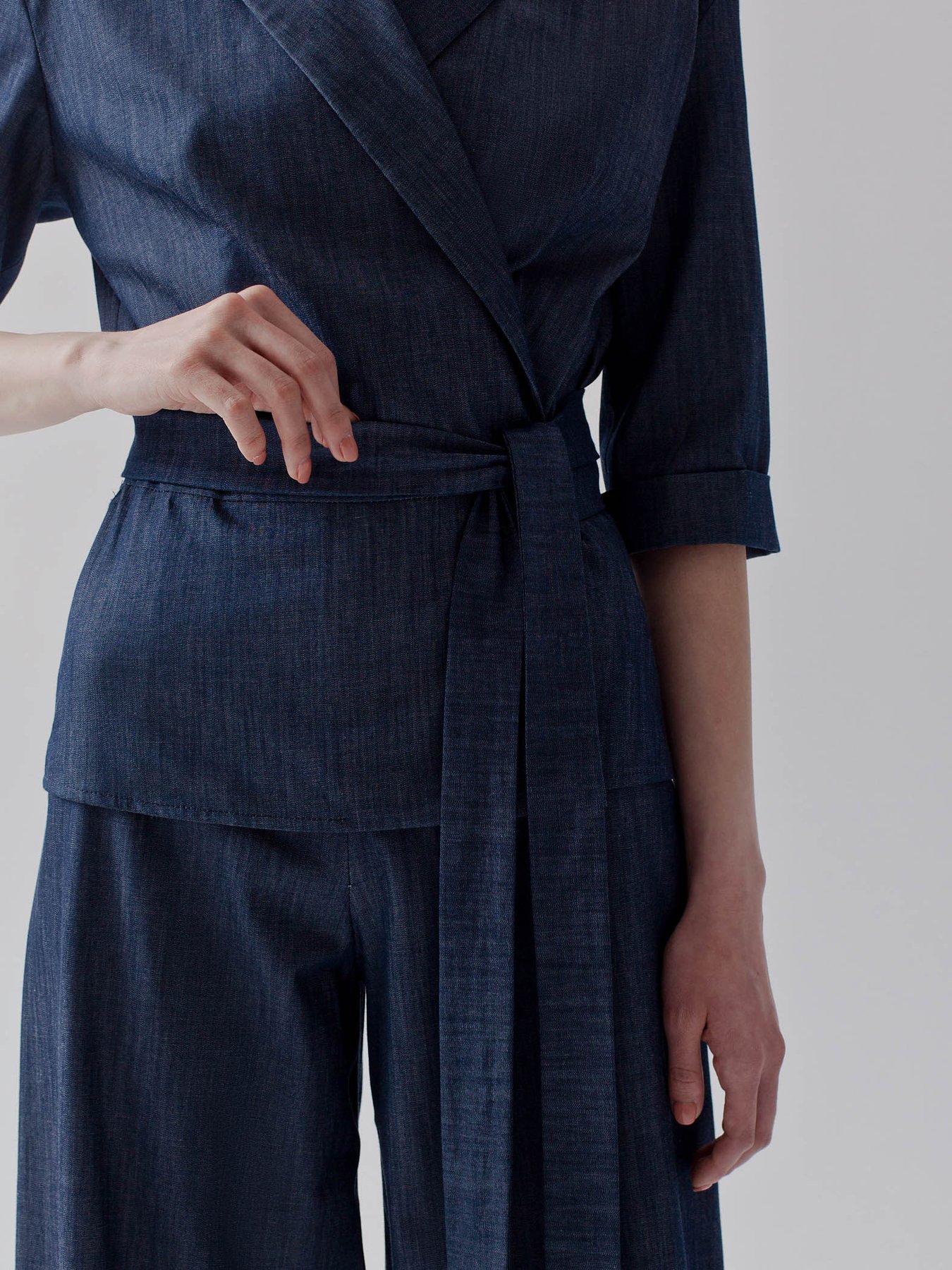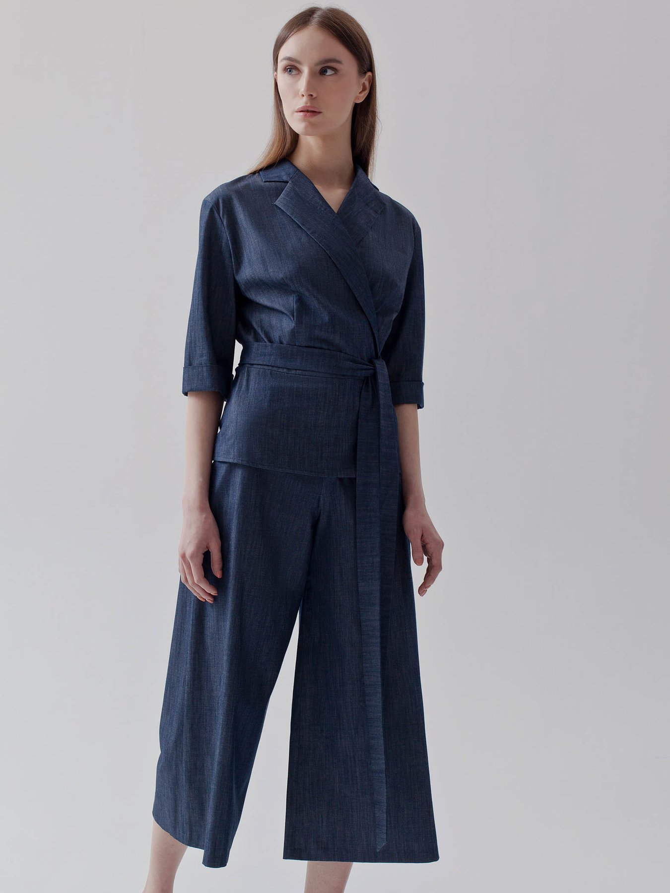 Блуза из итальянской вискозной ткани оттенка деним с поясом. Модель с укороченным рукавом.