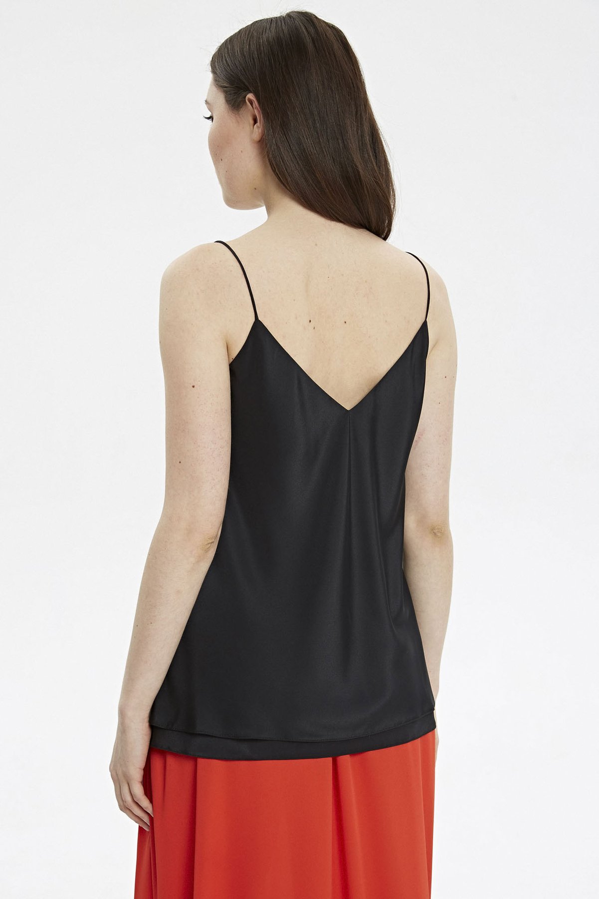 Топ с V-образным вырезом спереди и сзади. Изделие выполнено из черной шелковистой ткани с блеском.
