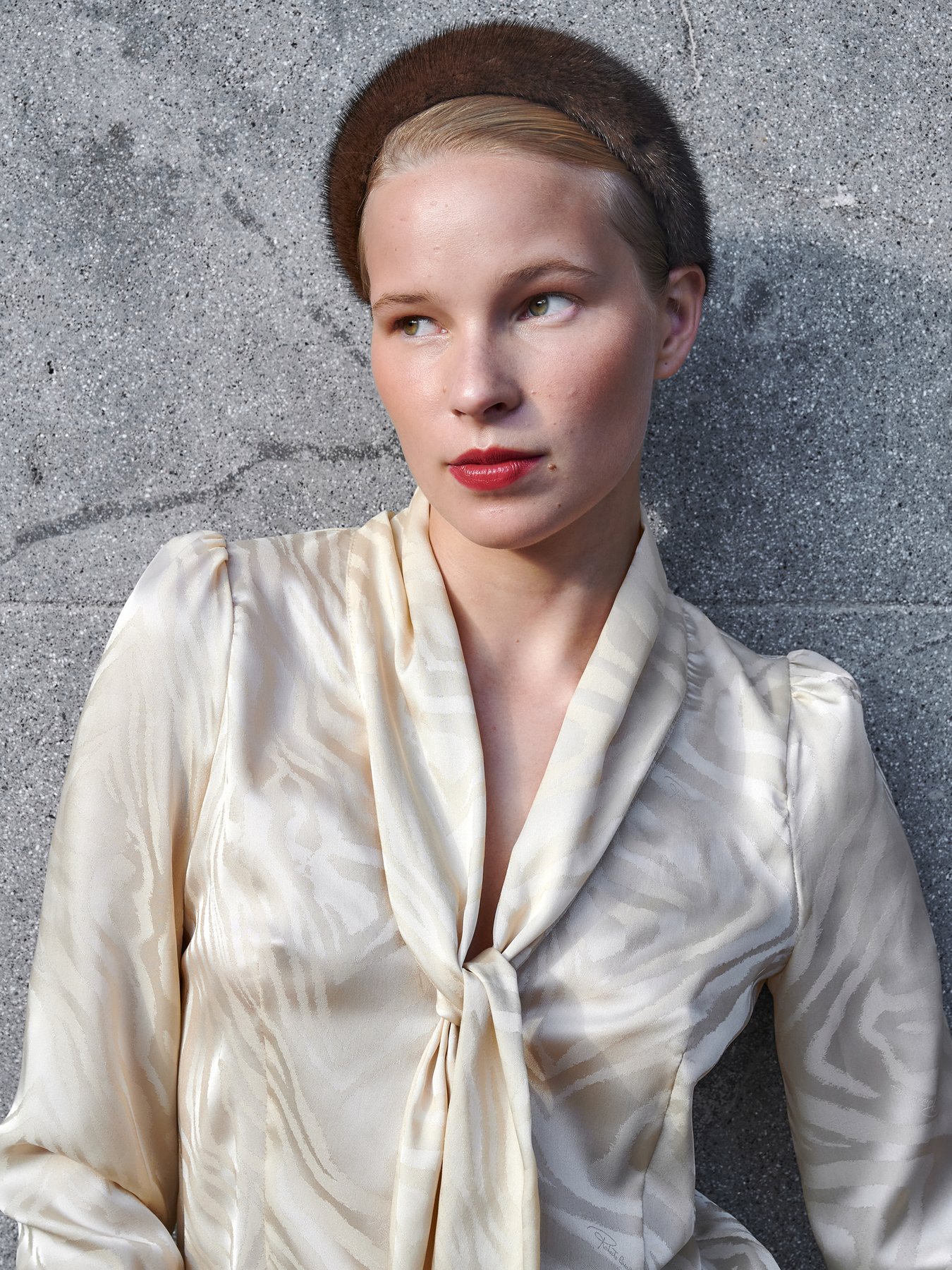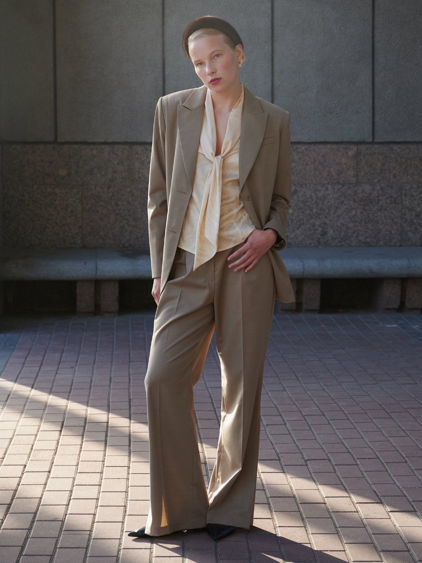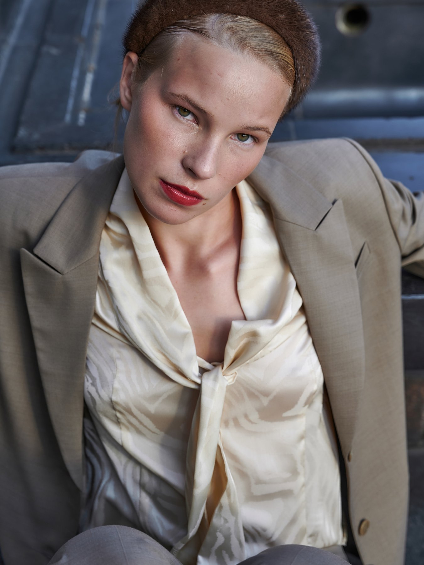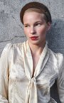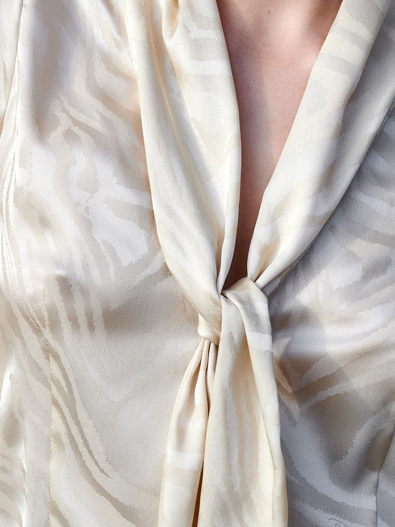 Блуза из шелка с добавлением эластана. Рукав 5/6, свободный ворот «галстук», пуговицы. Шелковая жаккардовая ткань.