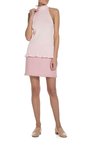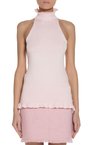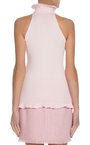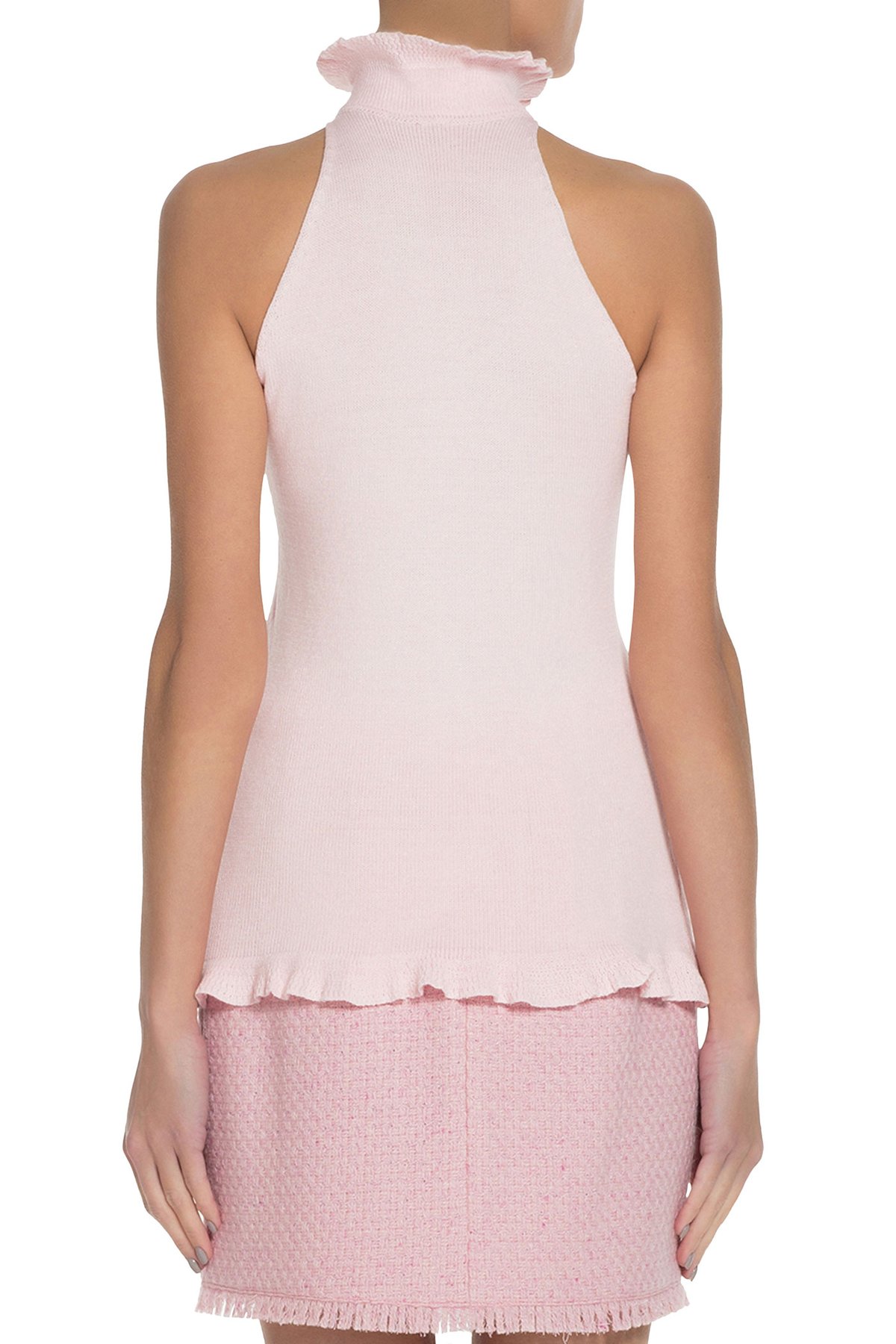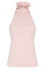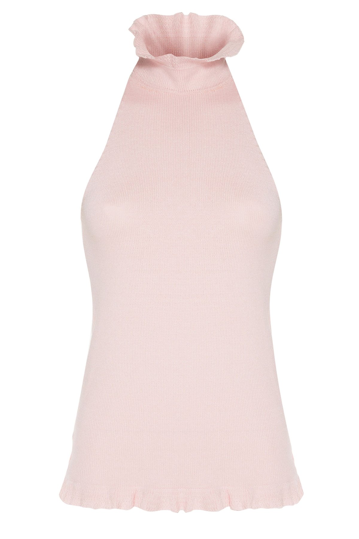 Джемпер из вискозного трикотажа нежно-розового оттенка. Модель прилегающего силуэта с воротом стойка декорированным рюшей. Изделие без рукавов, дополненное рюшей по низу.