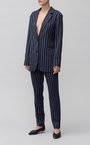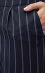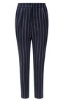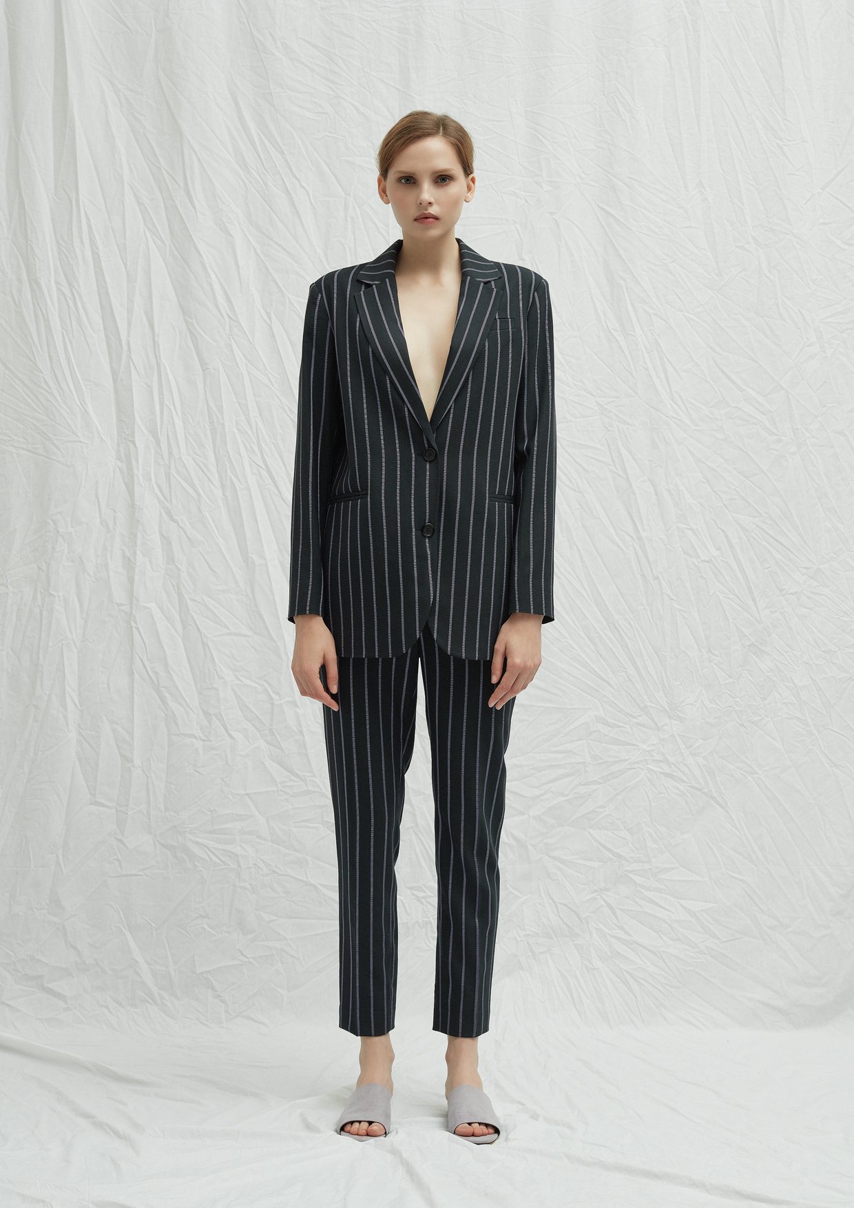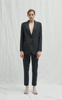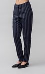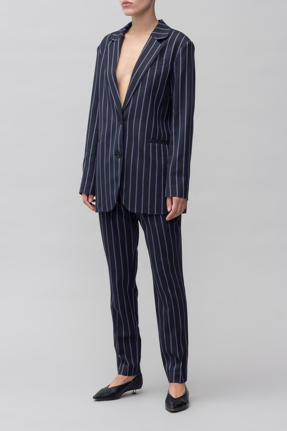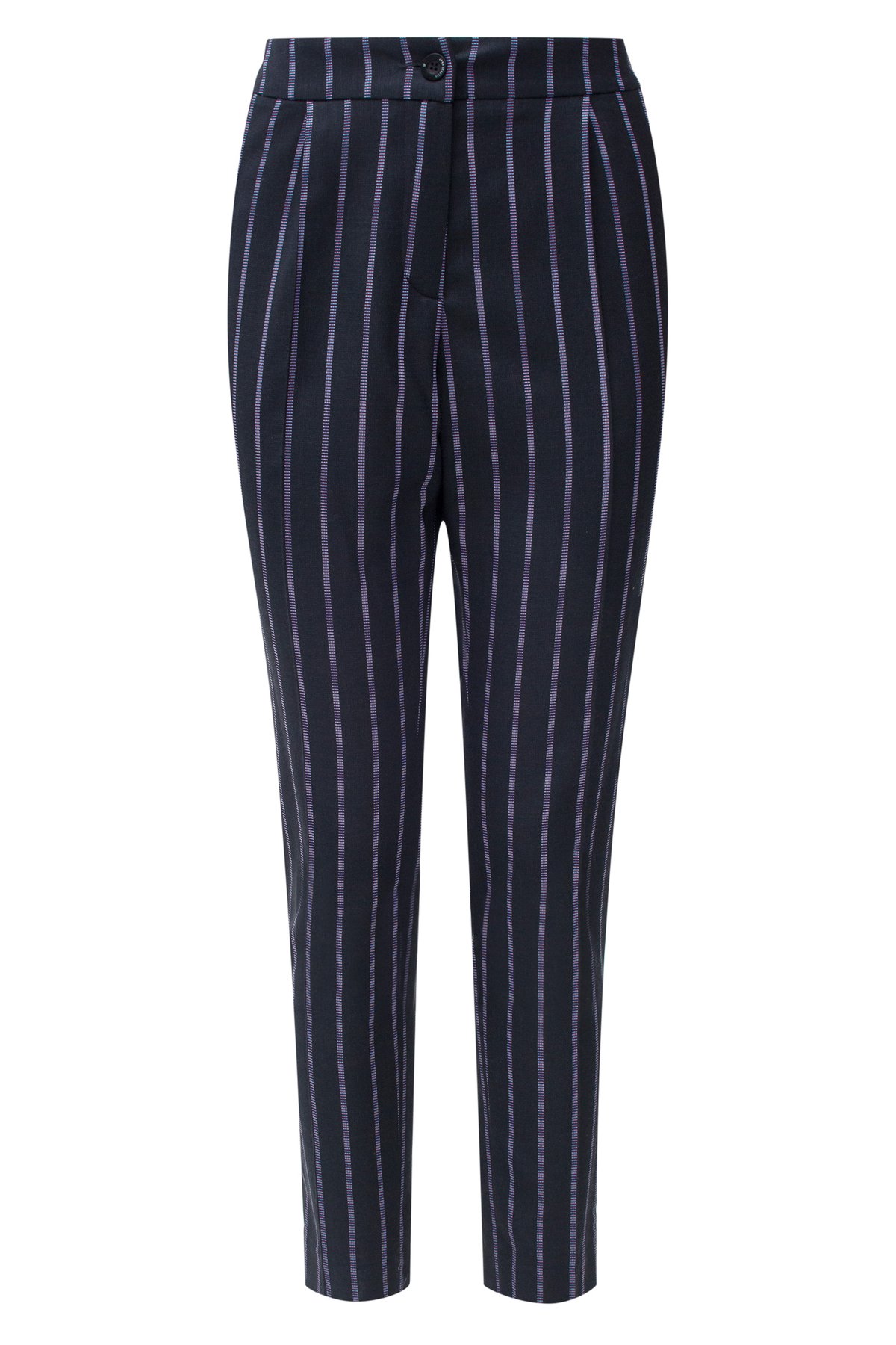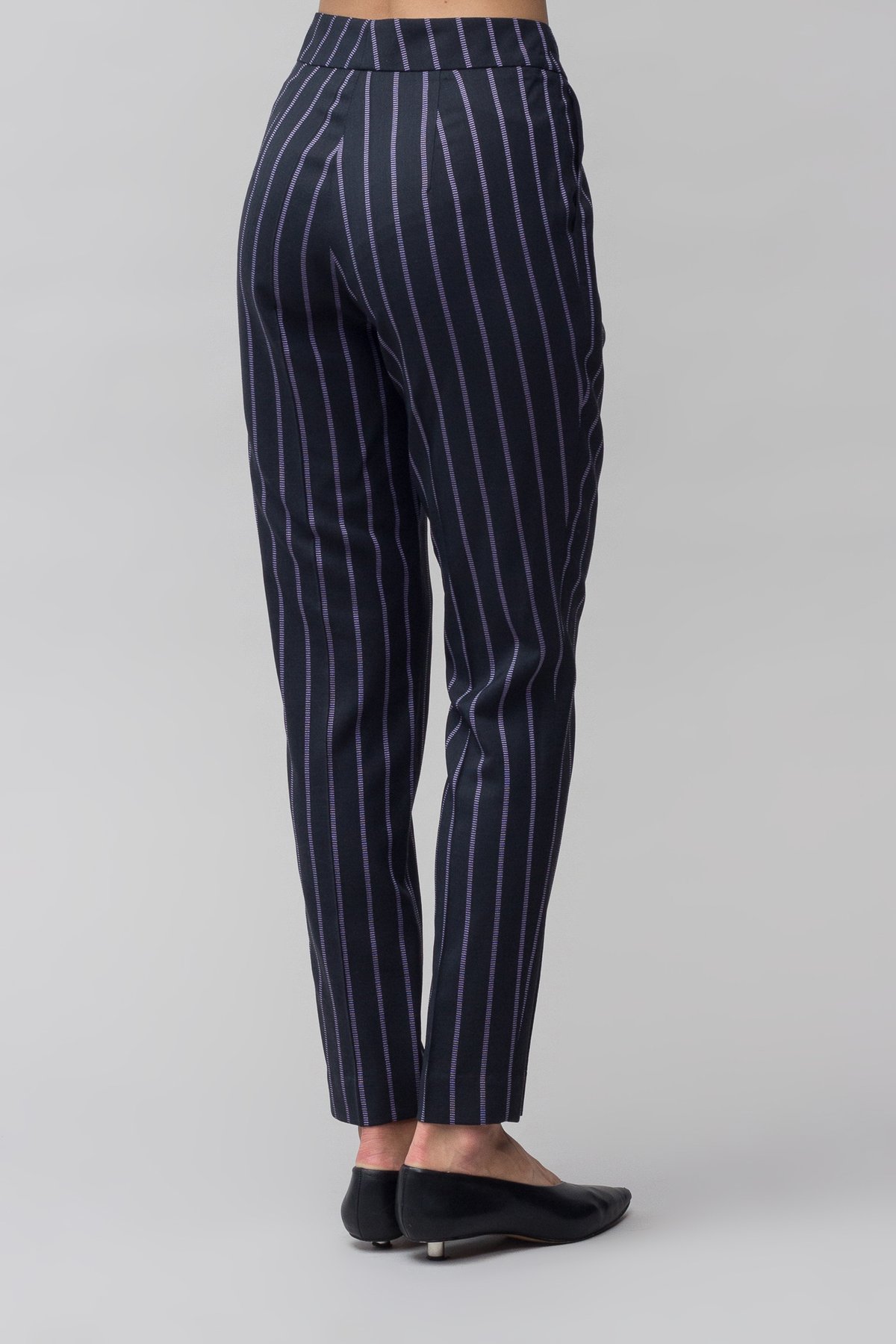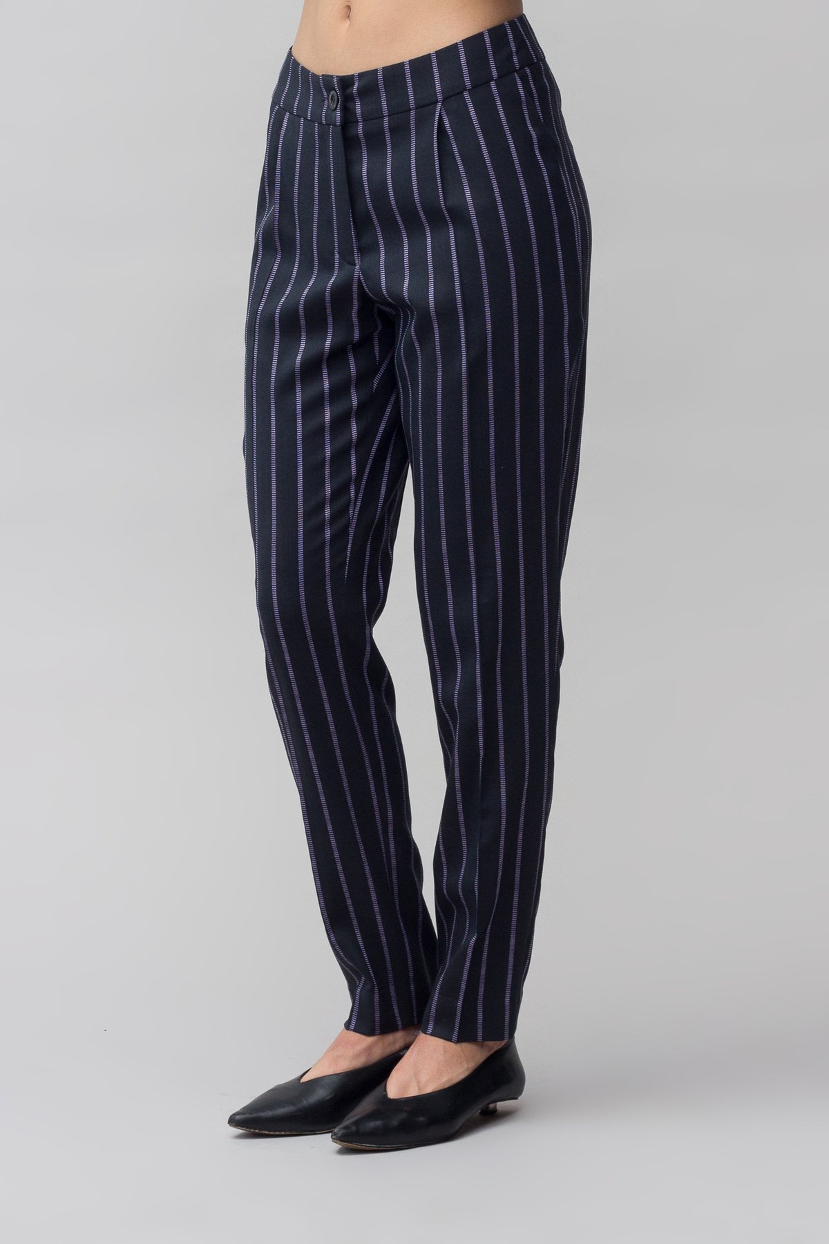 Брюки с высокой посадкой на талии из тонкой костюмной шерсти с добавлением эластана черного цвета с яркими контрастными полосками сиреневого оттенка. Модель заужена к низу и дополнена боковыми карманами. Брюки H234, ставшие классикой за счет универсальной посадки, являются безусловным хитом и выпускаются уже в течение 8 лет в разных тканях.