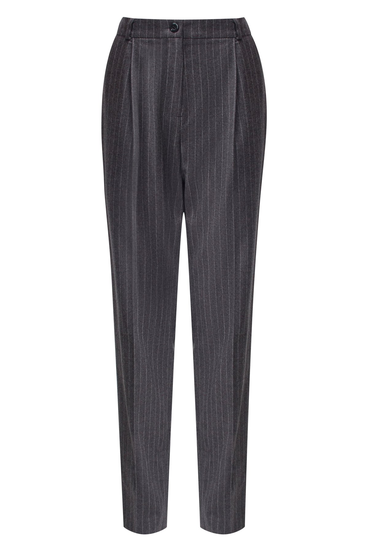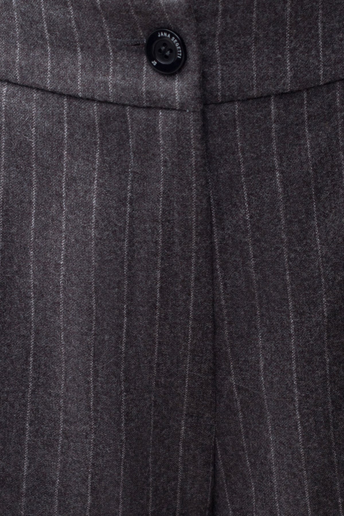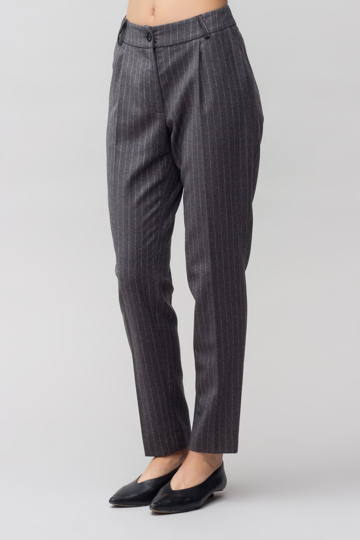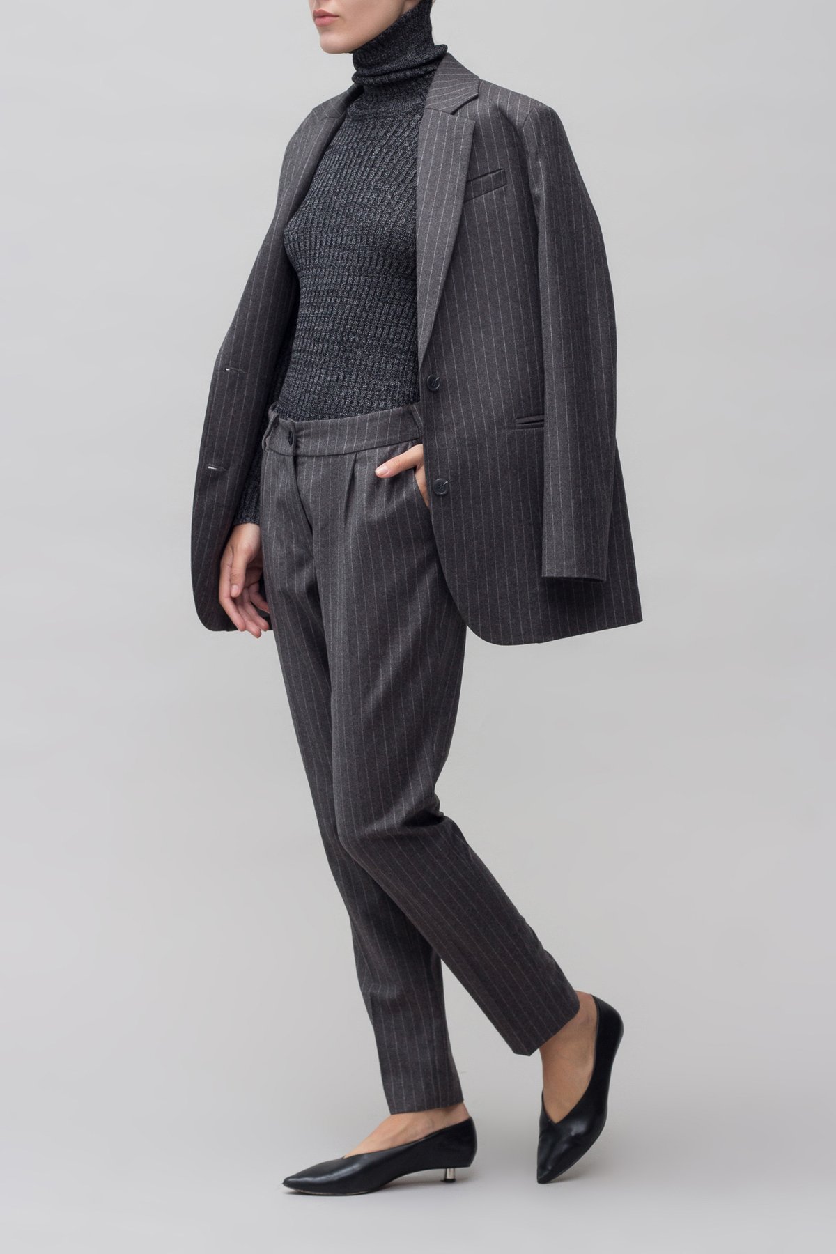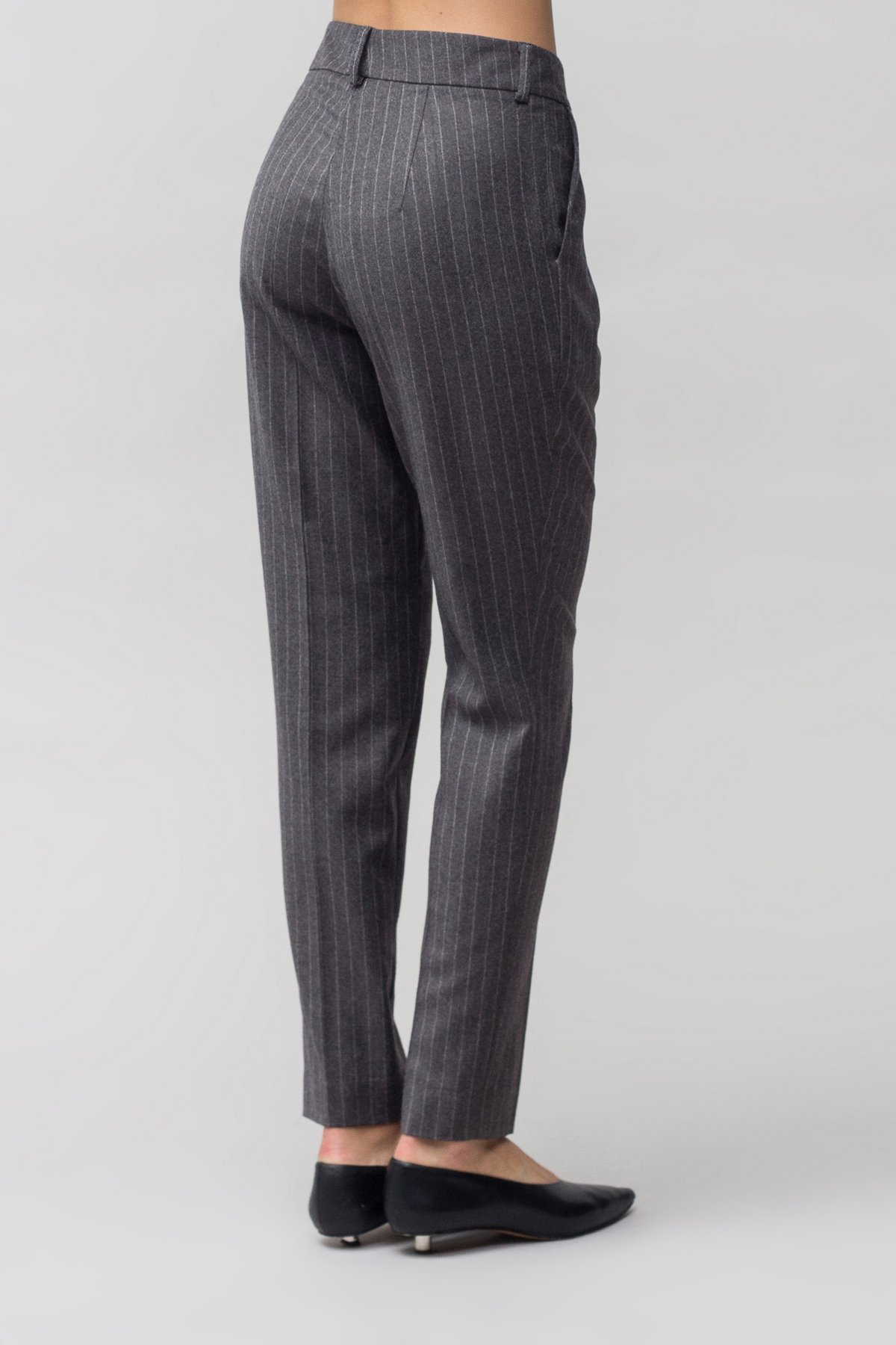 Костюмные брюки из шерсти темно-серого оттенка в серую полоску с боковыми карманами. Модель, зауженная к низу. Брюки H234, ставшие истинным хитом за счет универсальной посадки, выпускаются уже в течение 8 лет в разных тканях.