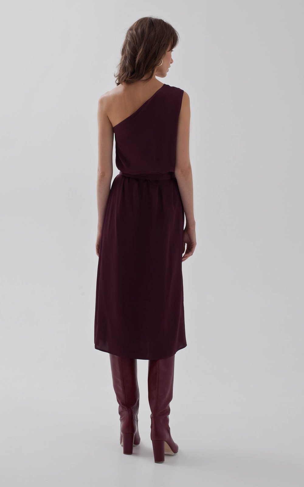 Платье миди длинны без рукавов с боковым разрезом. Модель с резинкой на талии, выполнена из вискозной ткани темно-бордового оттенка с шелковистым блеском.