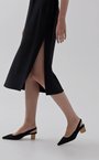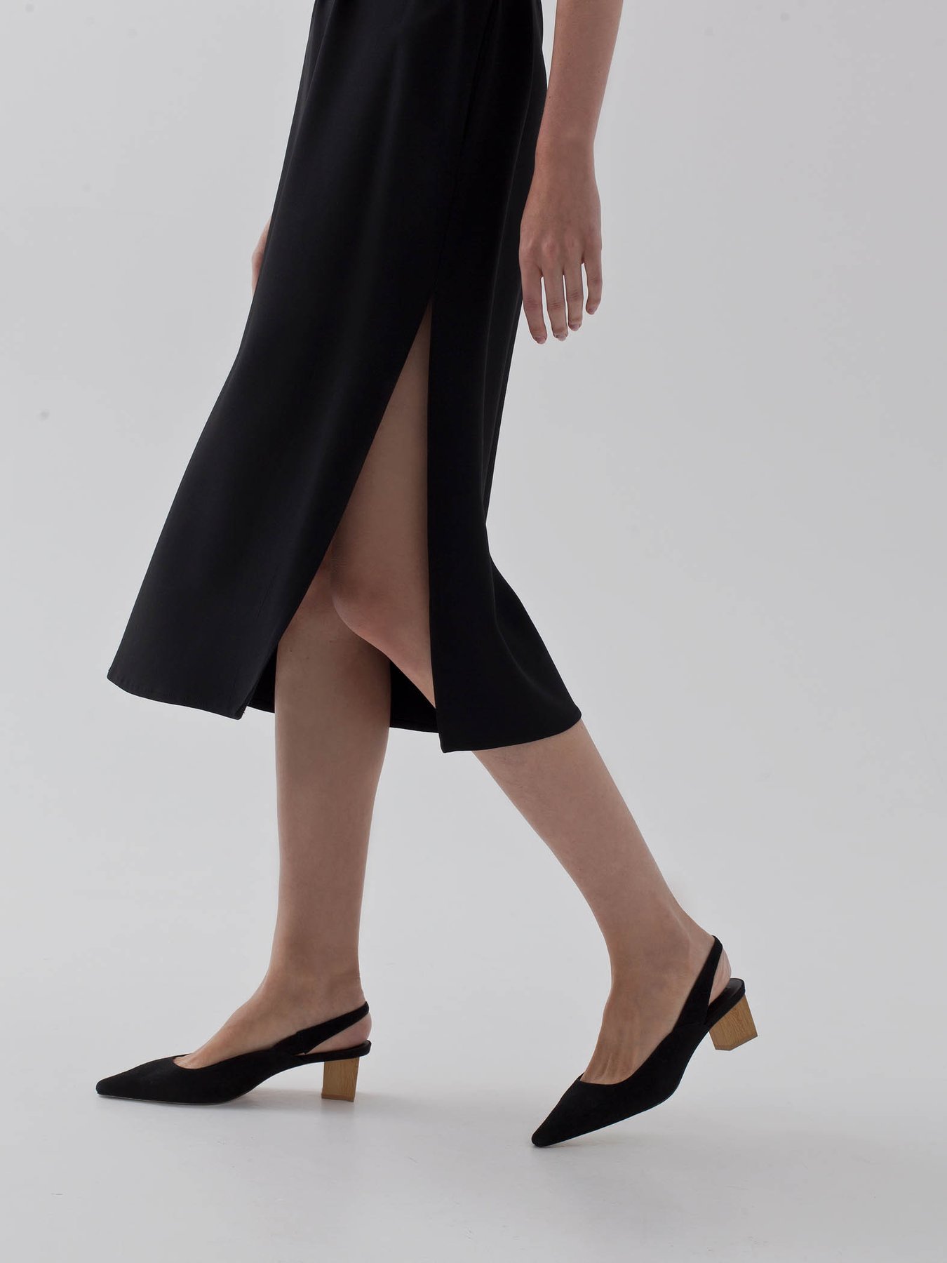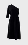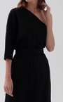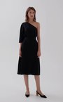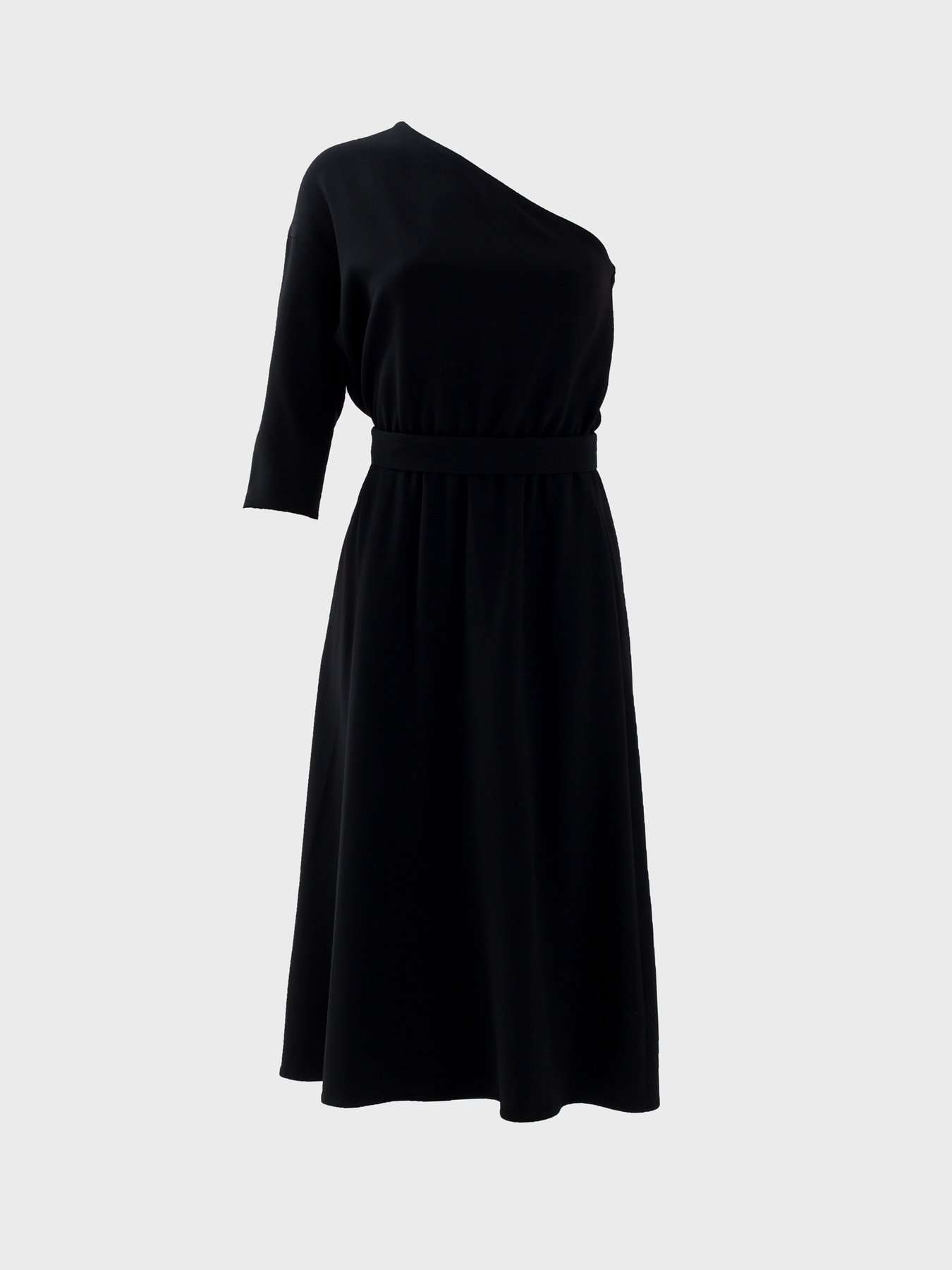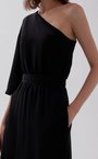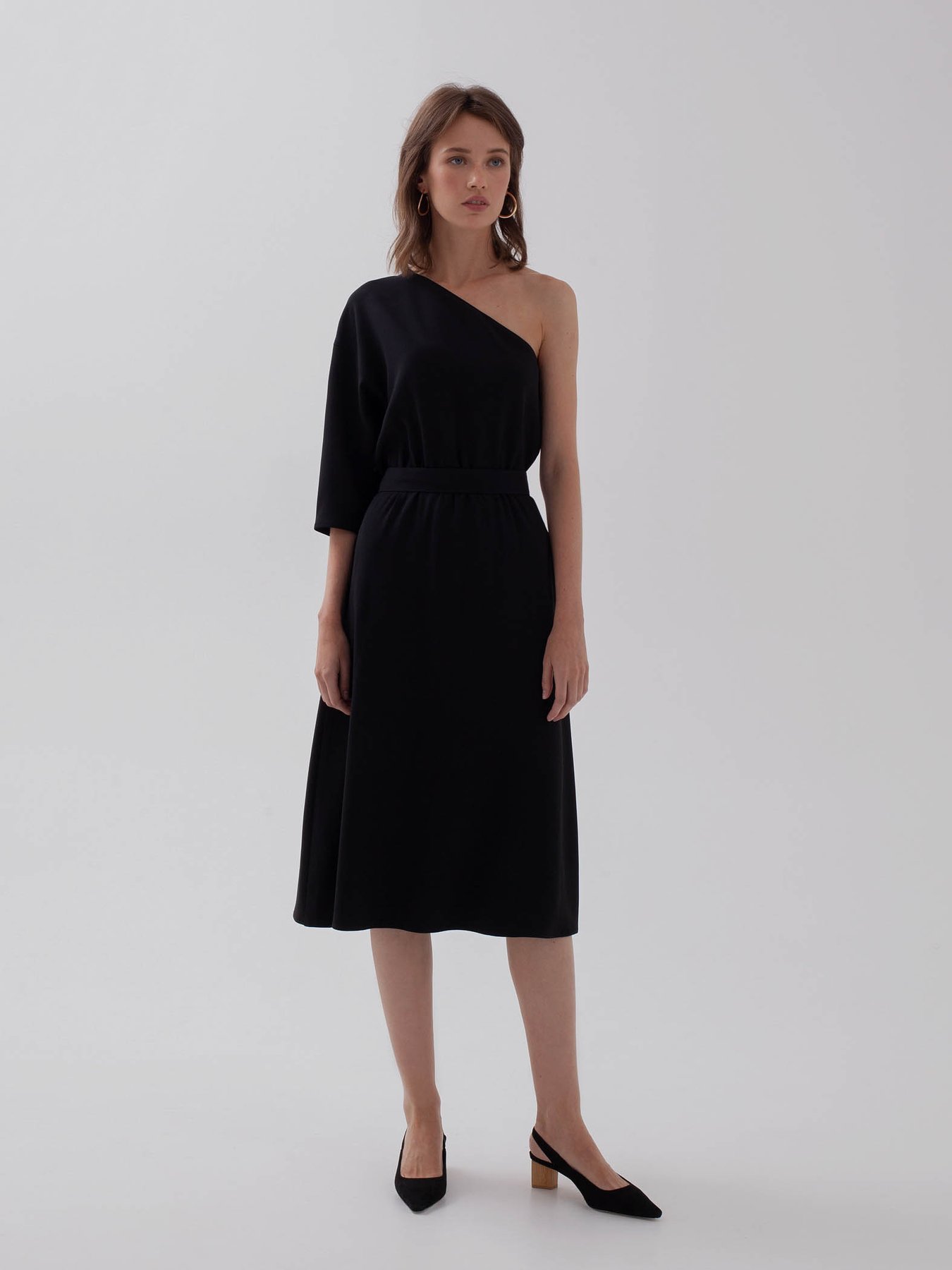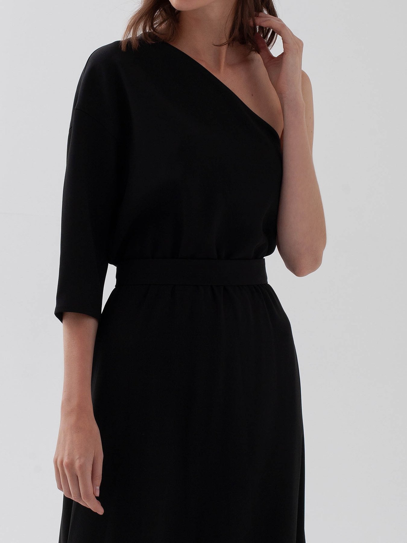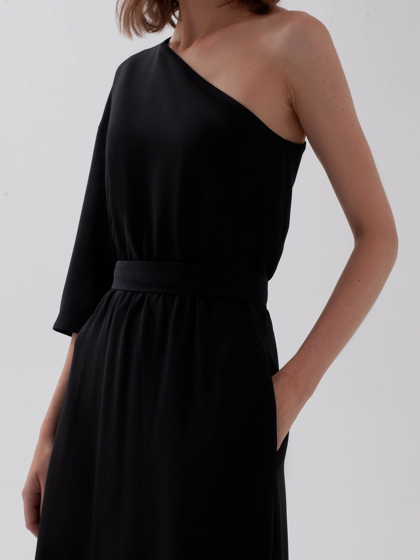 Платье миди длинны ассиметричного кроя с боковым разрезом из вискозной ткани черного оттенка . Модель с одним рукавом дополненная поясом из основного материала.