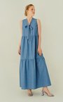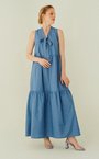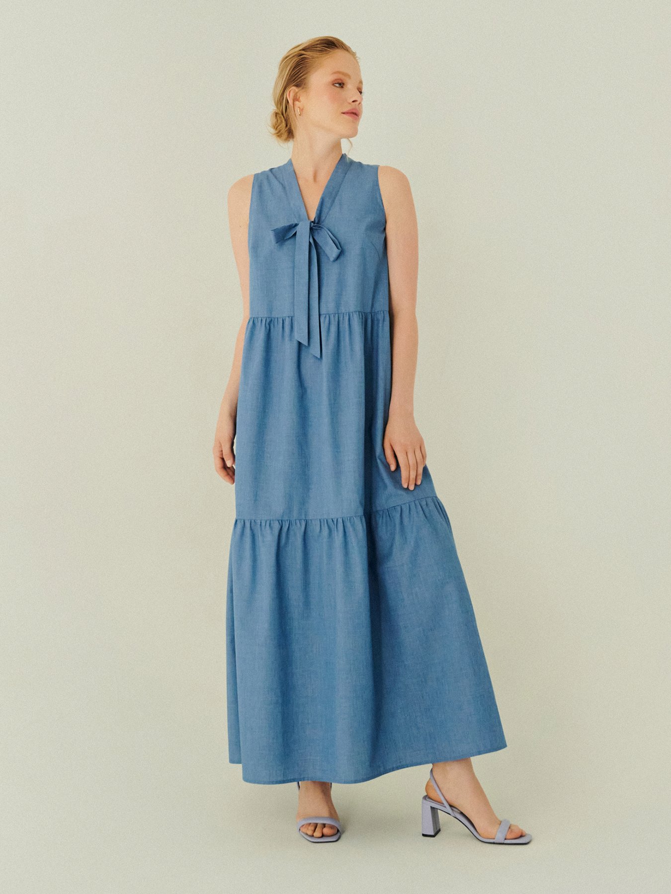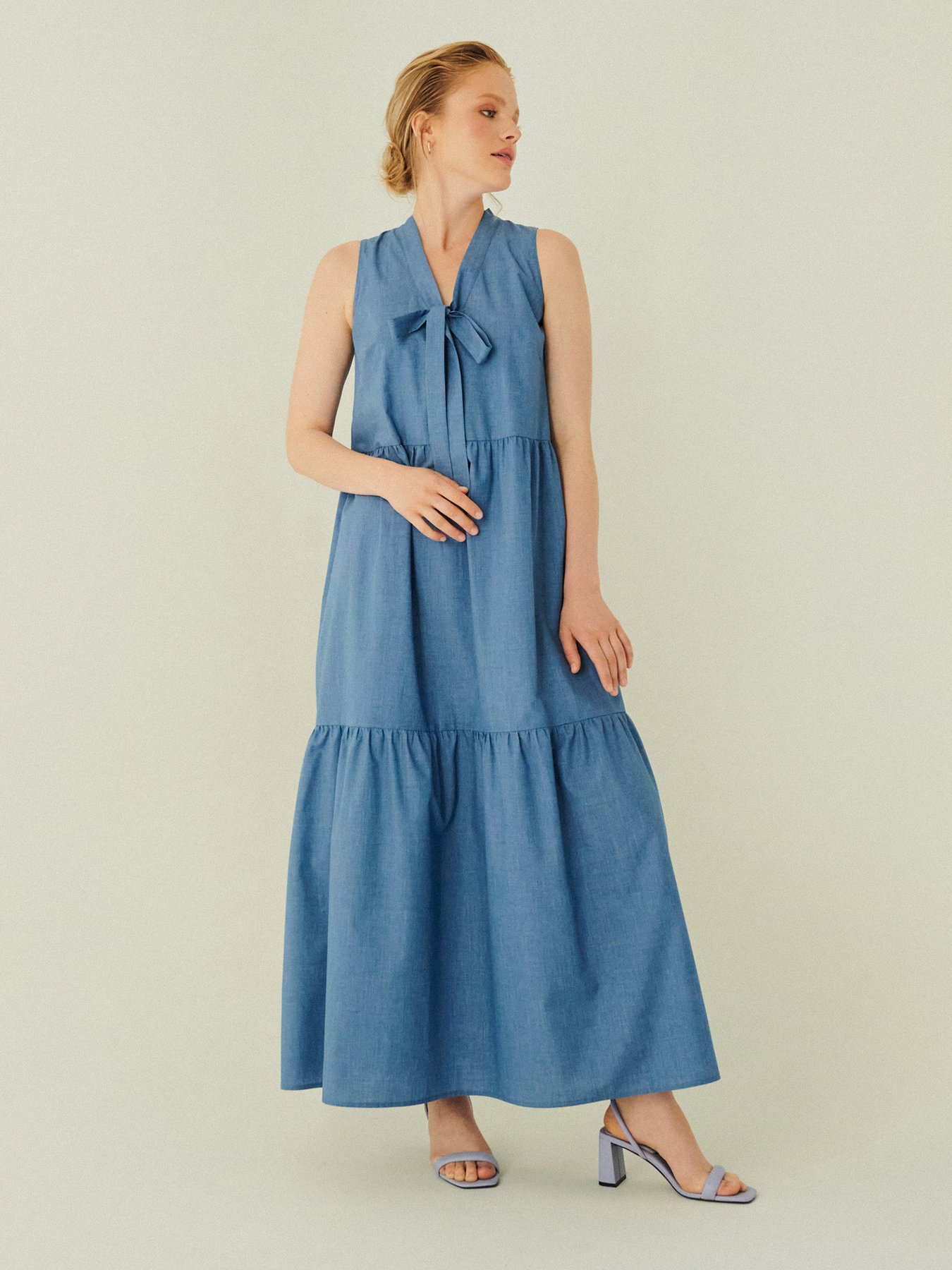 Платье макси из тонкой хлопковой ткани светло-голубого оттенка деним. Платье без рукавов, декоративный бант, модель с воланами.