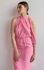 Платье миди длины из шелковой ткани нежного кораллового оттенка. Модель с откатами плечами и завязками на вороте. Платье с подкладок