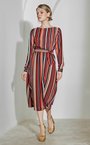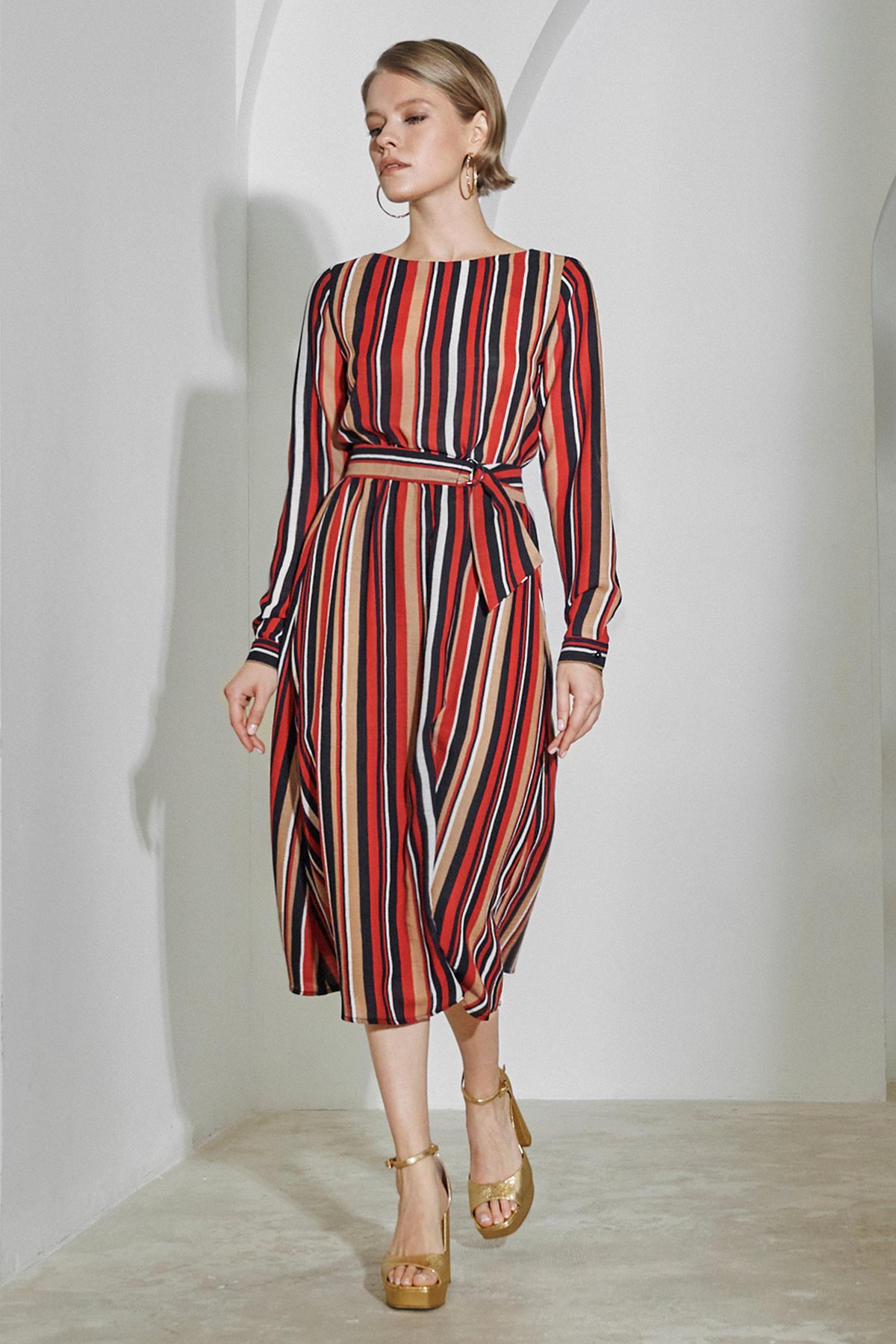Шерстяное платье миди длинны, длина ниже колена, пояс из основной ткани, вискозный подклад на юбке, шерстяная ткань в полоску