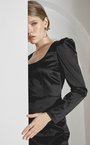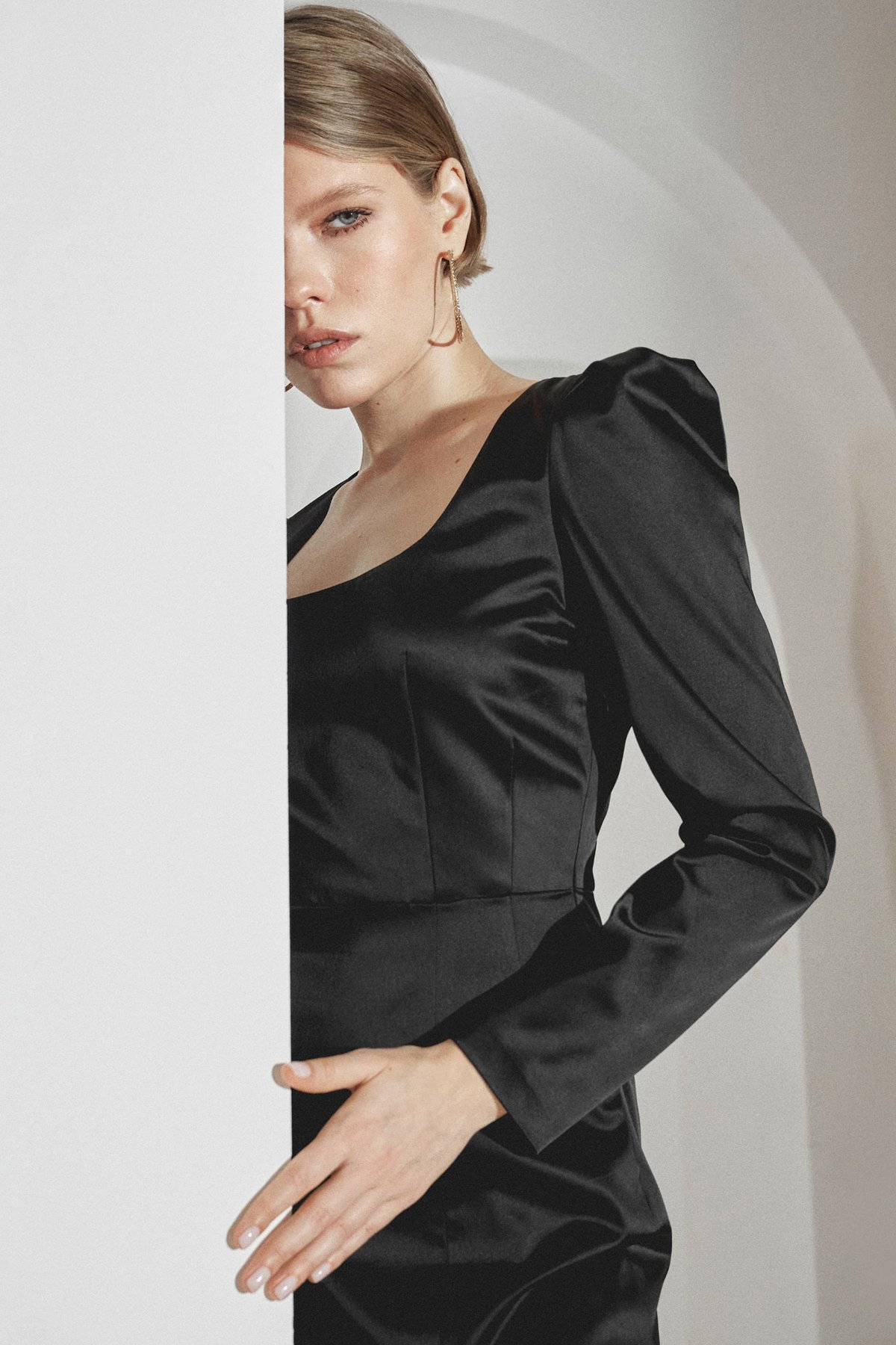 Черное платье миди длинны из эластичной атласной вискозной ткани. Длинный рукав, объёмное плечо, вырез каре, боковой разрез на юбки.