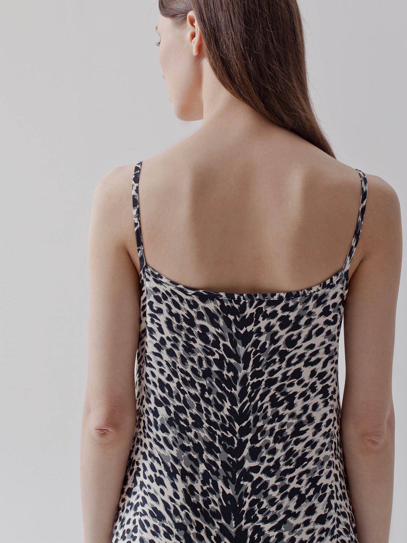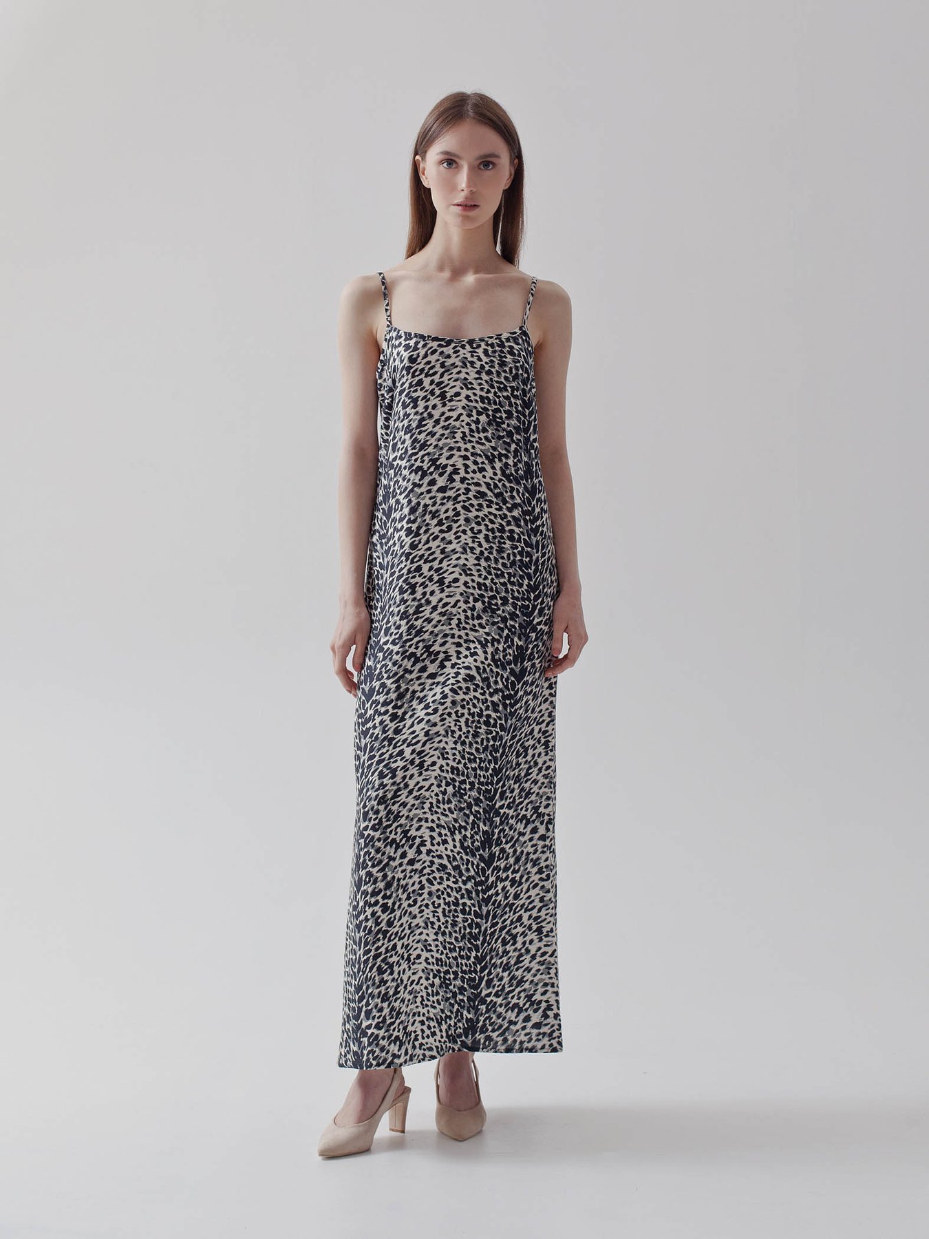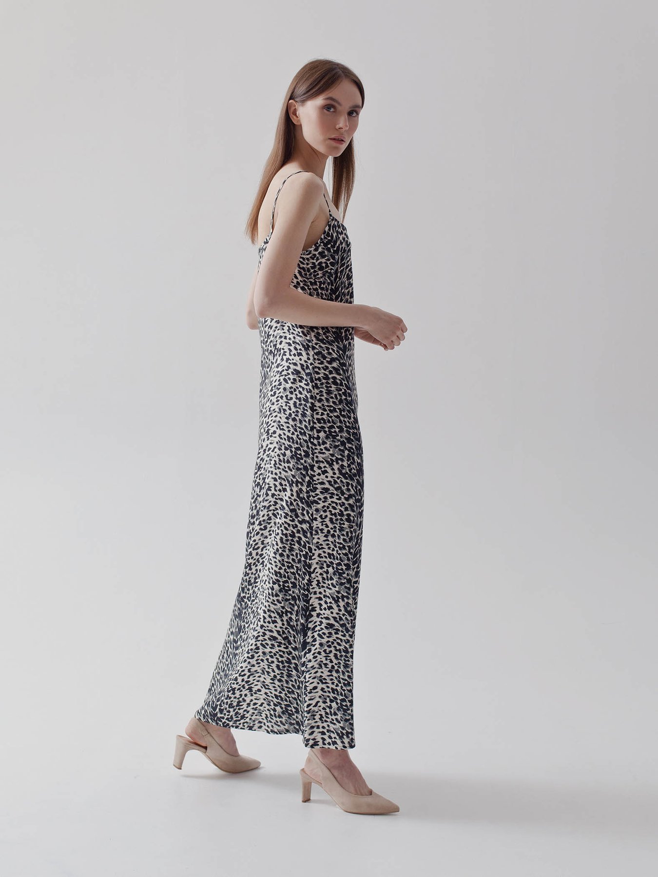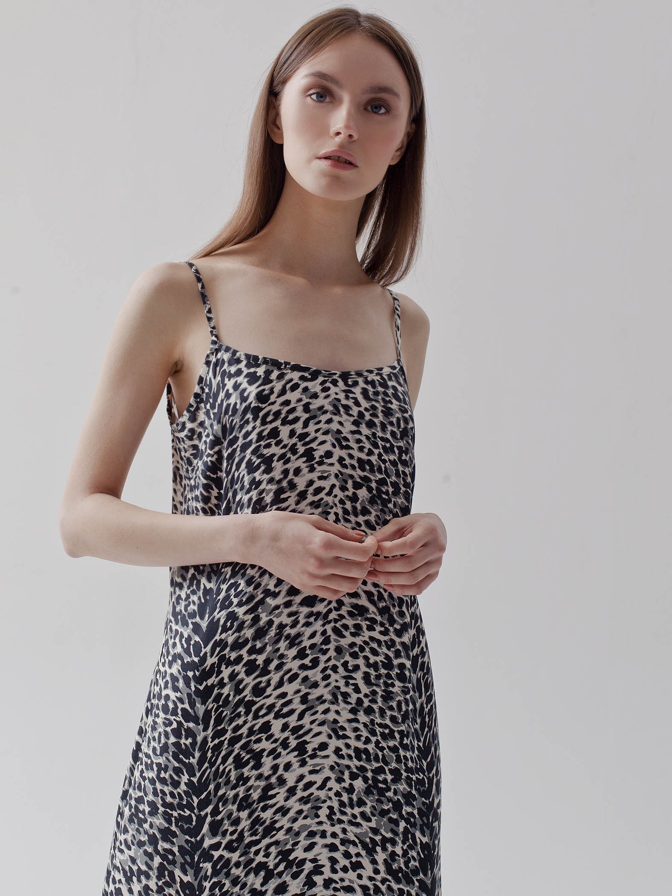 Платье-комбинация миди длины из вискозной ткани со звериным принтом. Модель с боковым разрезом.