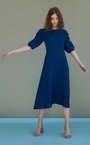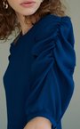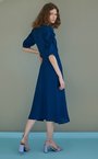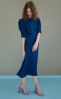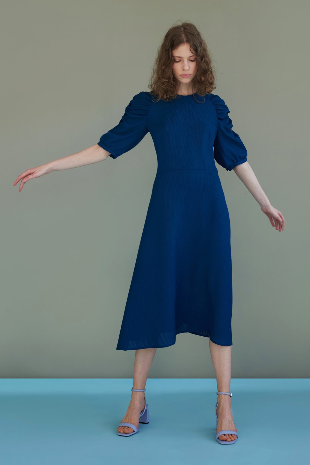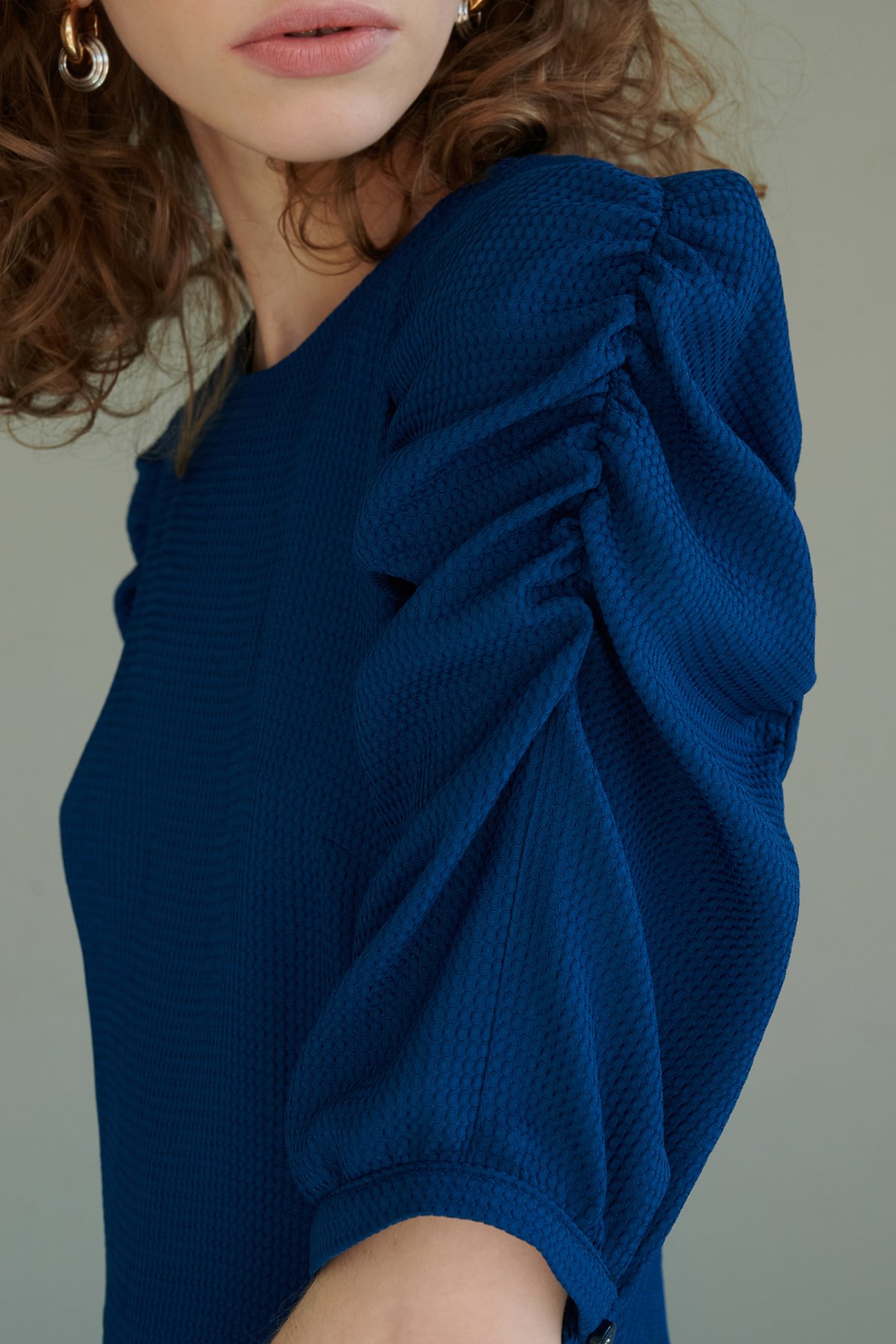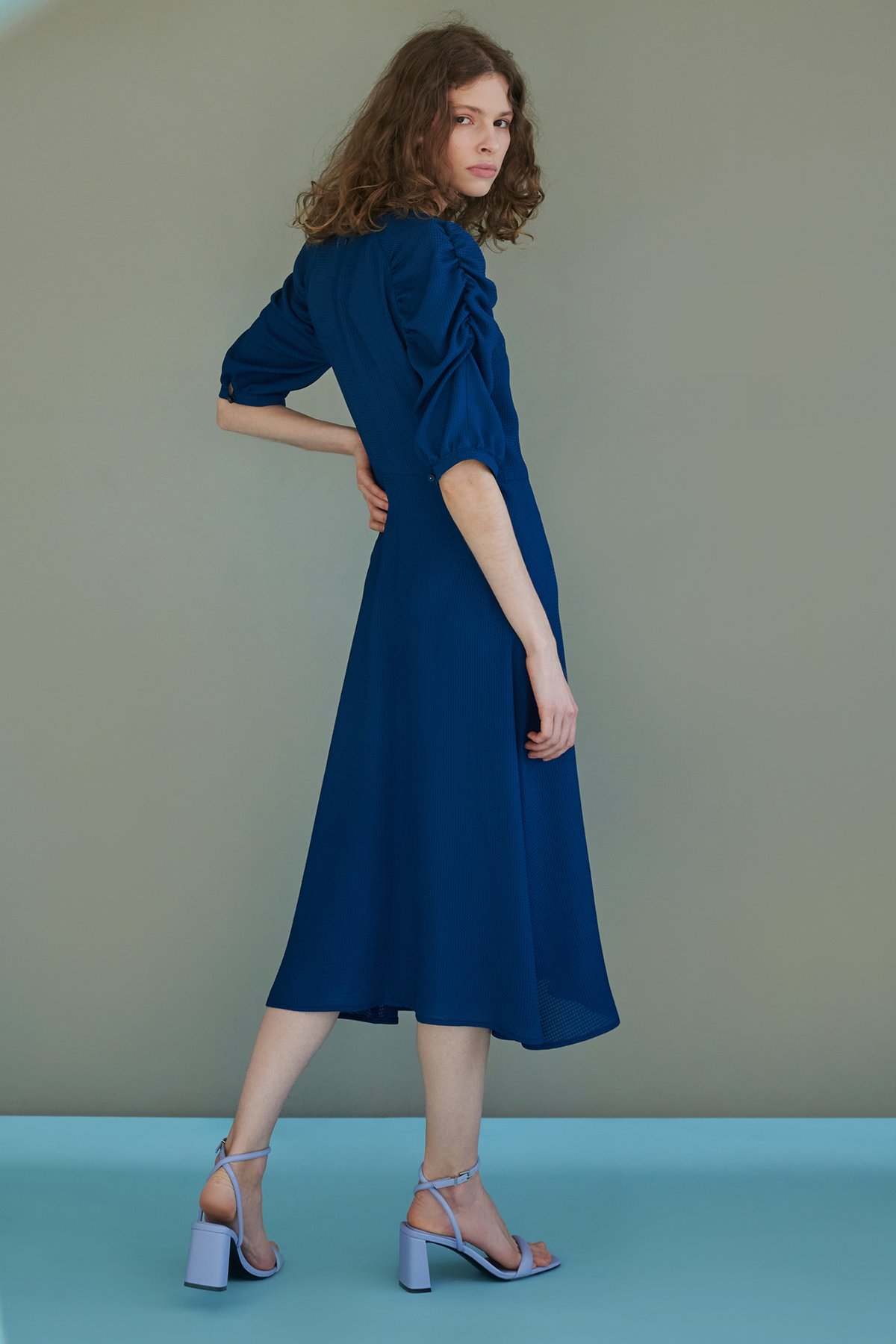 Миди платье из фактурной вискозы синего оттенка. Укороченный рукав реглан с декоративными складками