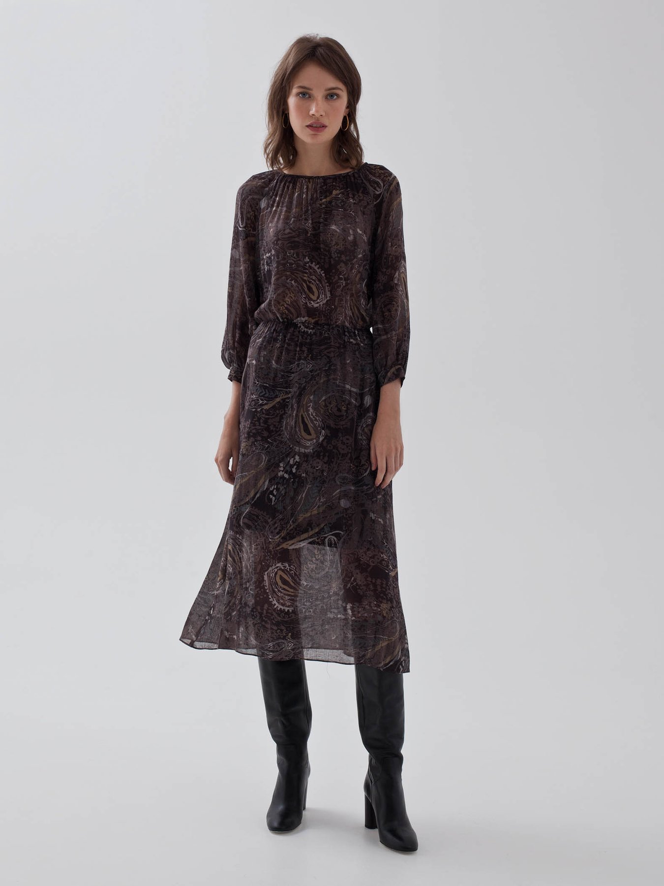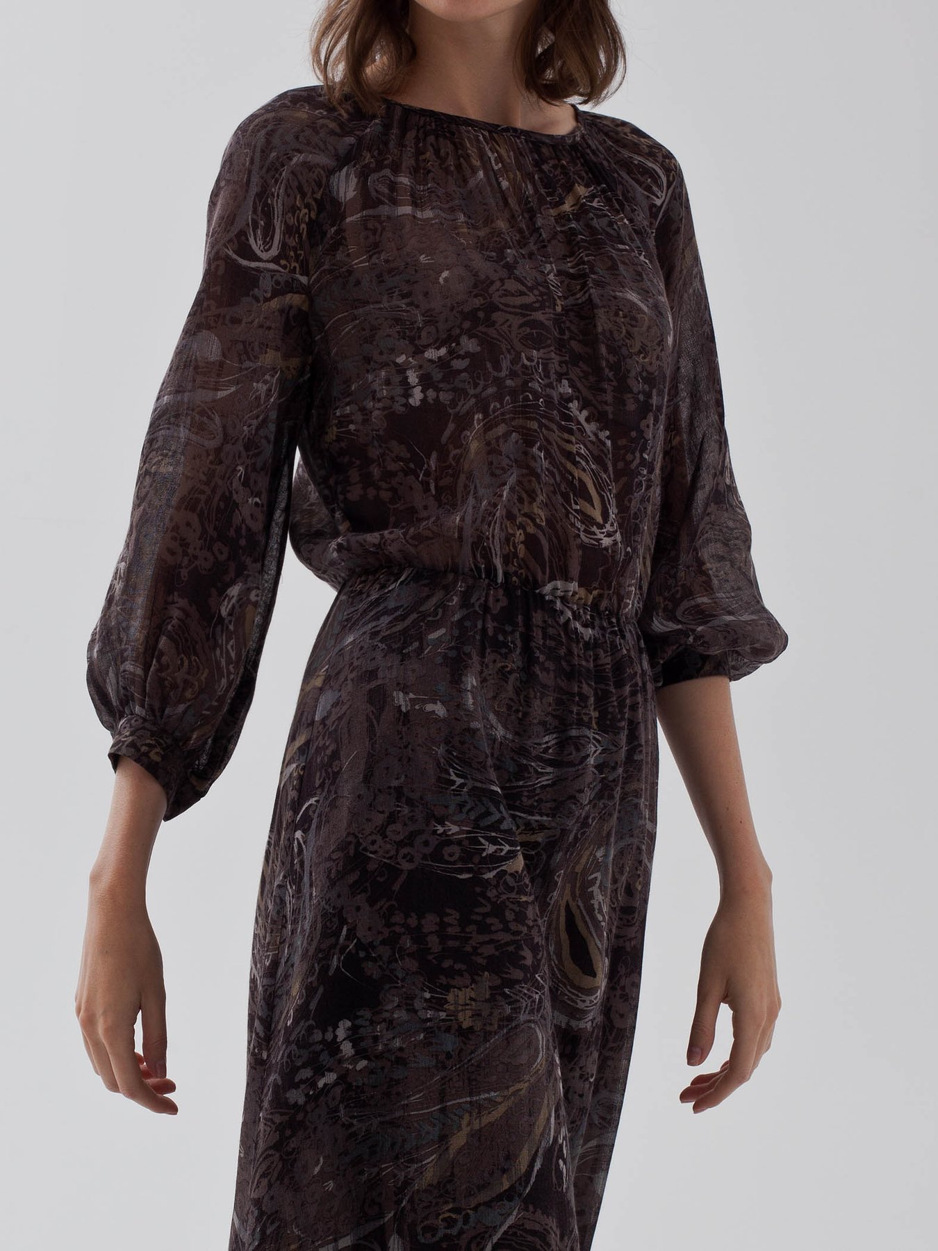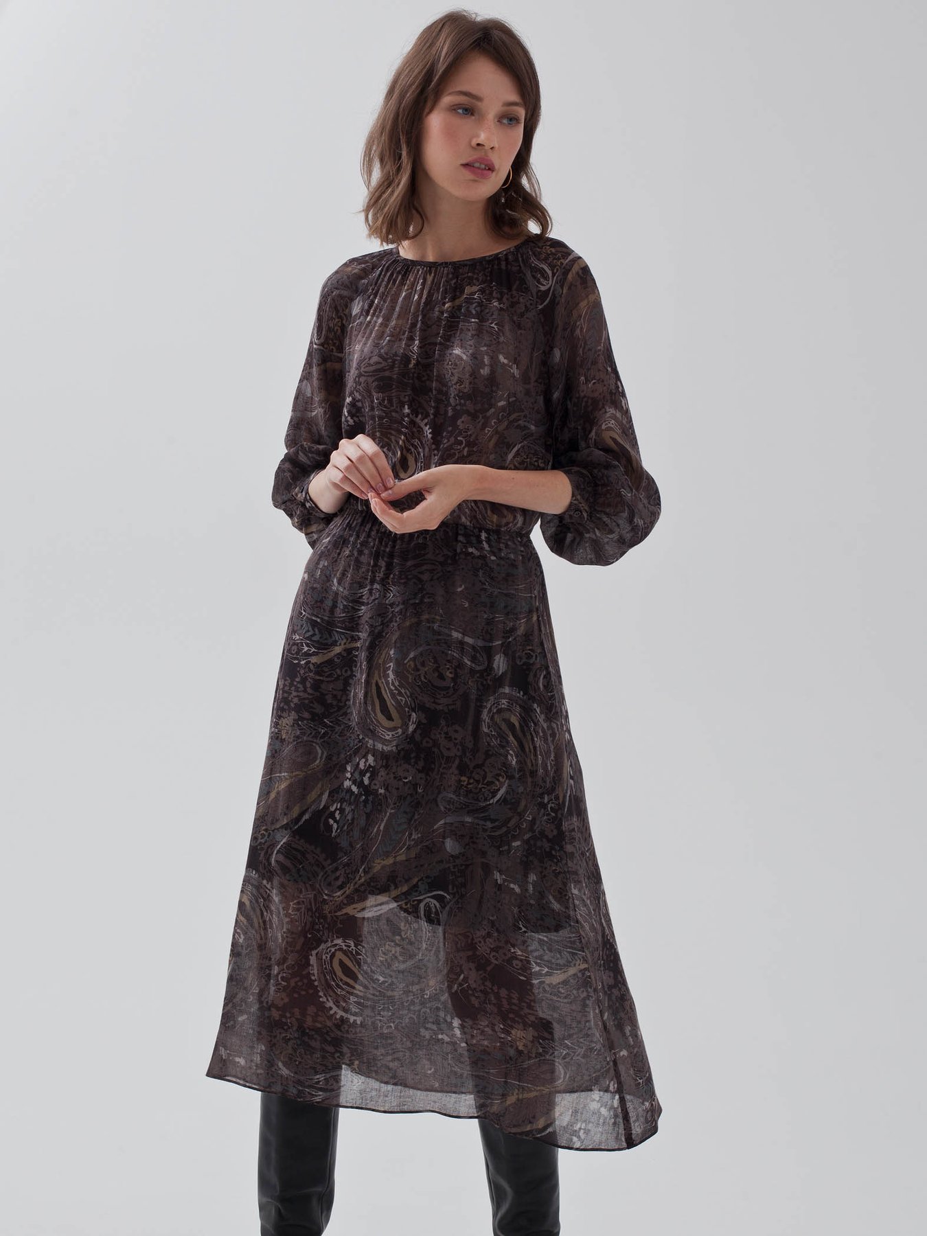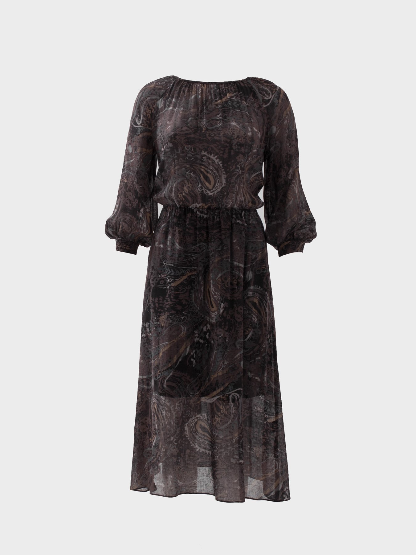 Миди-платье из тонкой шерстяной вуали с принтом "пейсли". Модель с резинкой на талии и сборками вокруг ворота, для большего комфорта добавлен вискозный подклад на юбке.