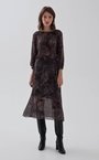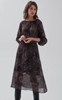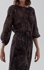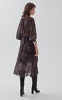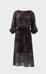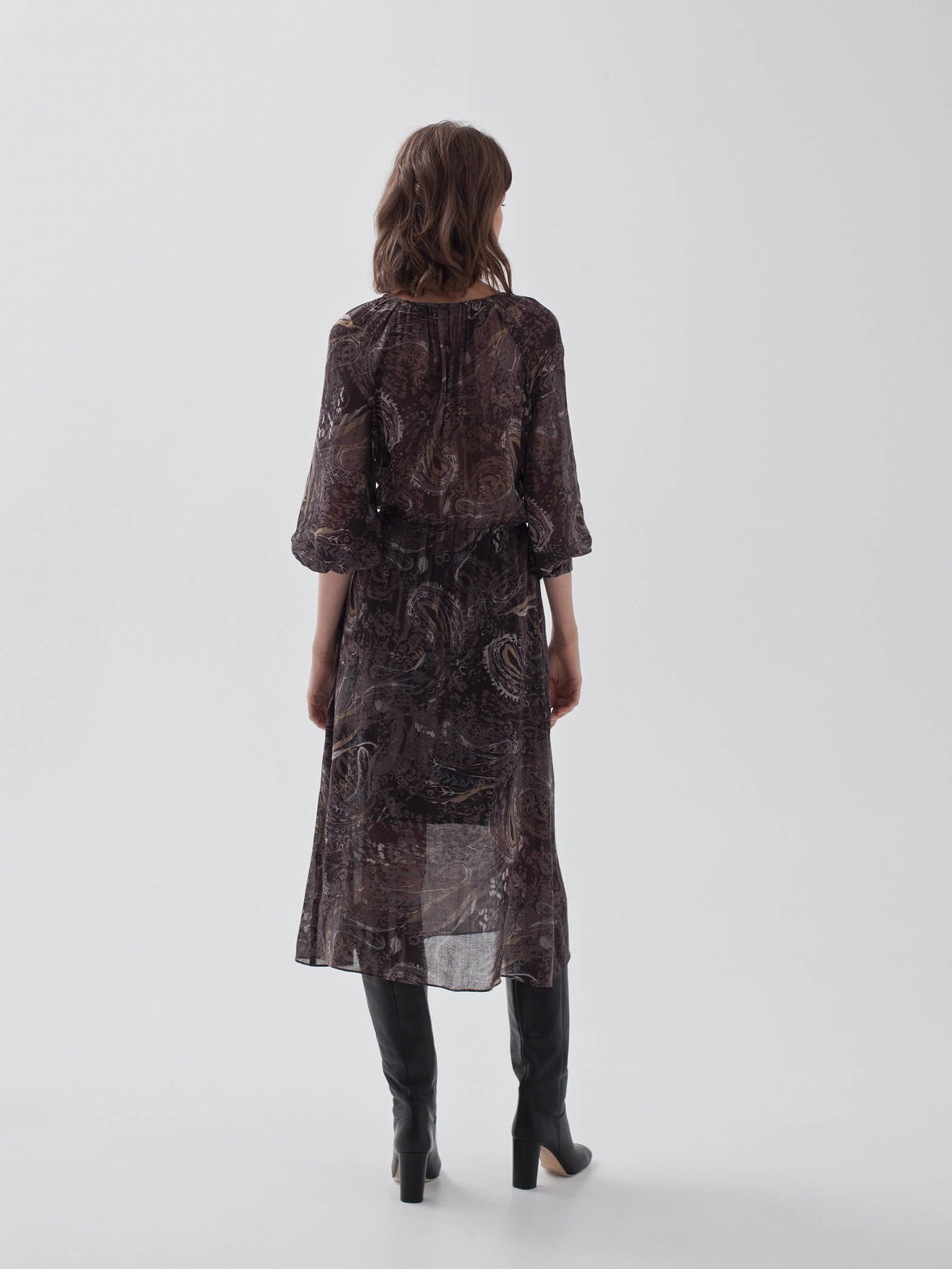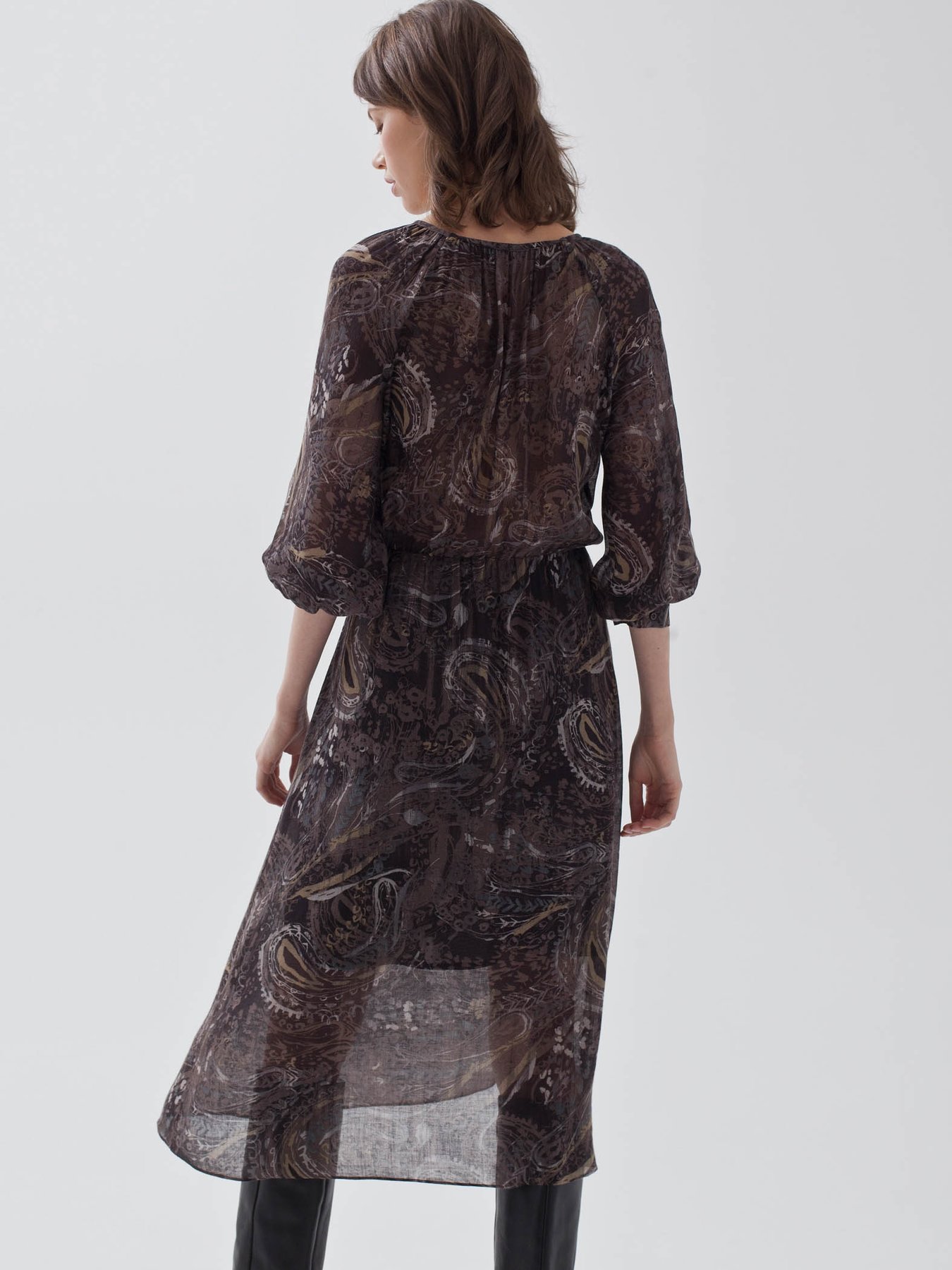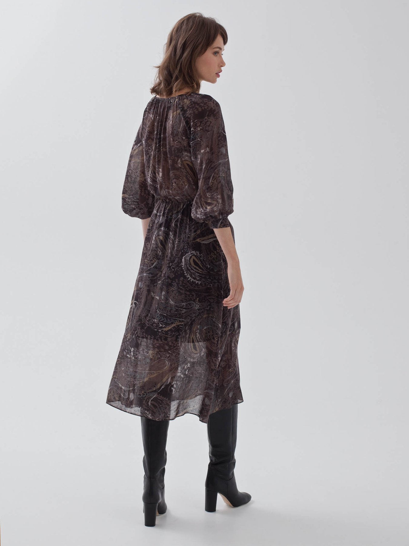 Миди-платье из тонкой шерстяной вуали с принтом "пейсли". Модель с резинкой на талии и сборками вокруг ворота, для большего комфорта добавлен вискозный подклад на юбке.