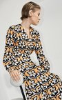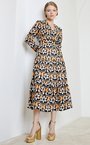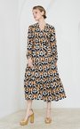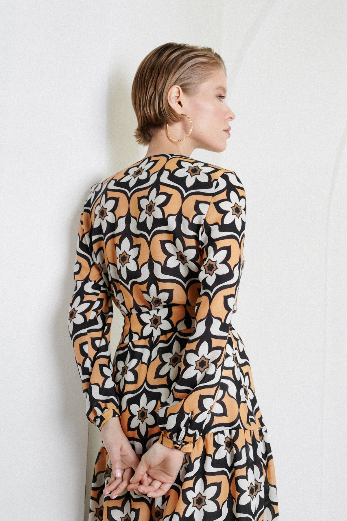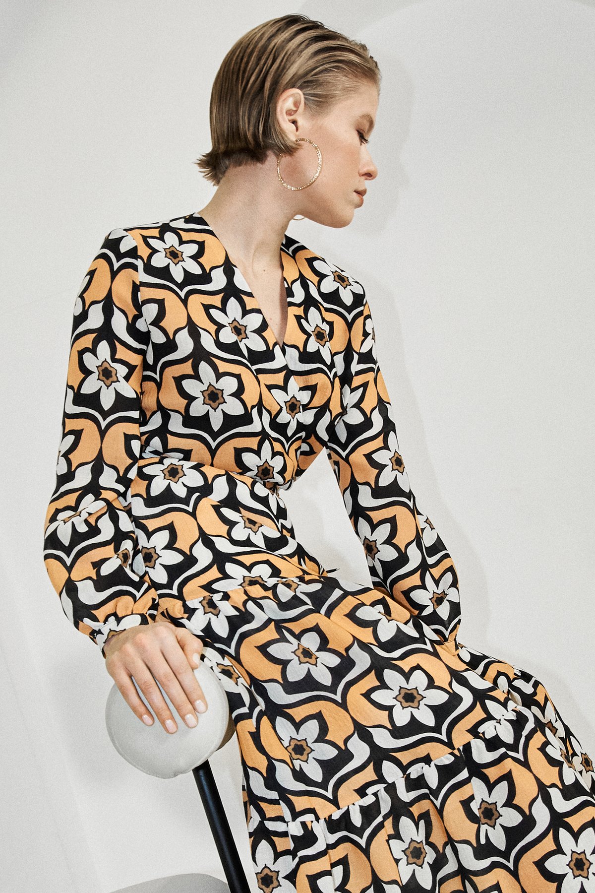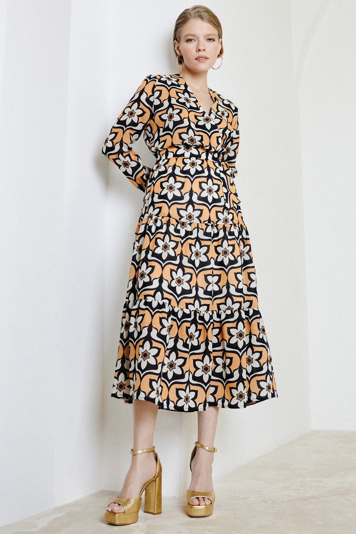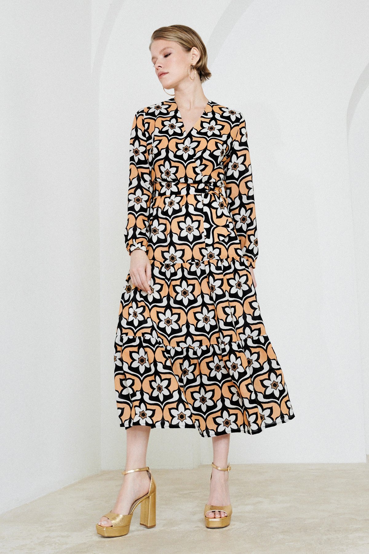 Платье- миди из тонкой шерстяной ткани. Крупный принт, длинный рукав, юбка с вискозным подкладом, дополнительный пояс, юбка с воланами