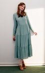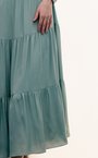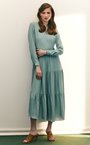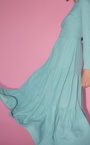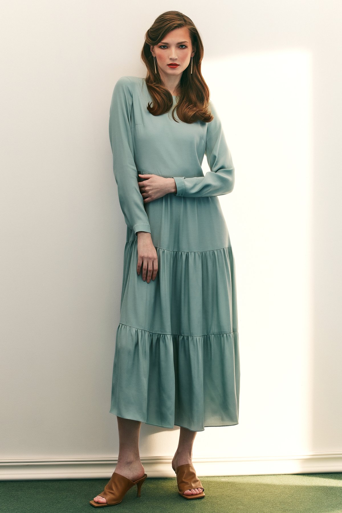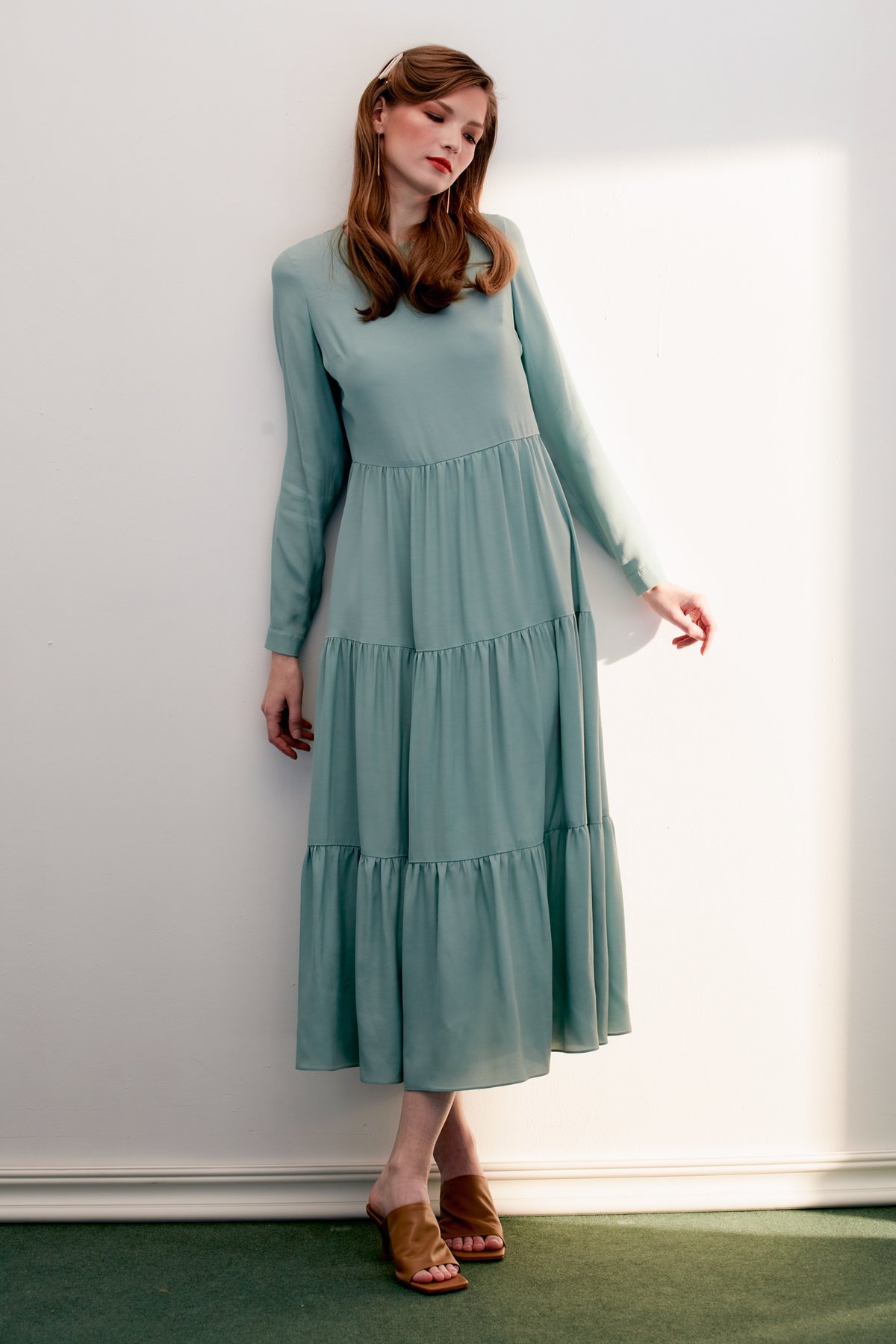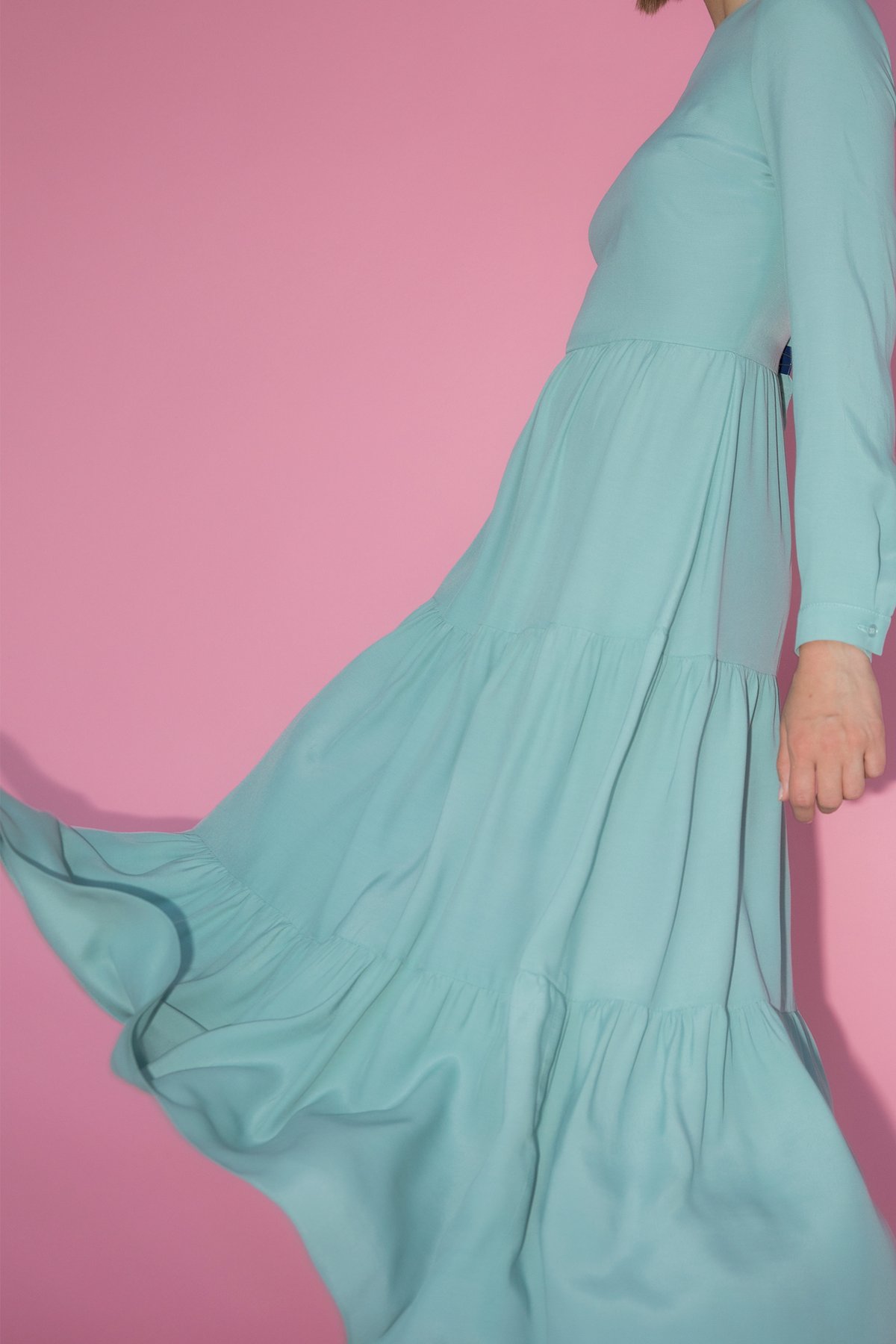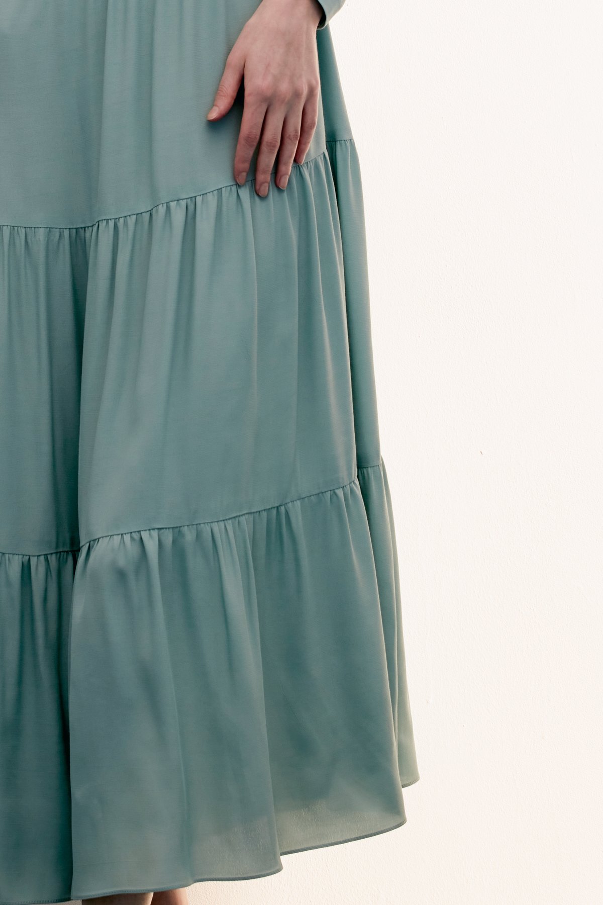 Платье из вискозной ткани нежного зелено-бирюзового оттенка. Модель ниже колена с длинным рукавом. Платье с воланом по низу.