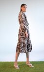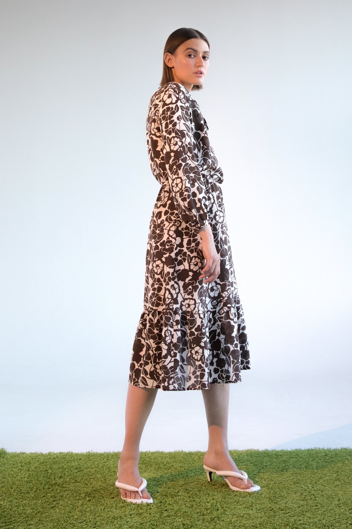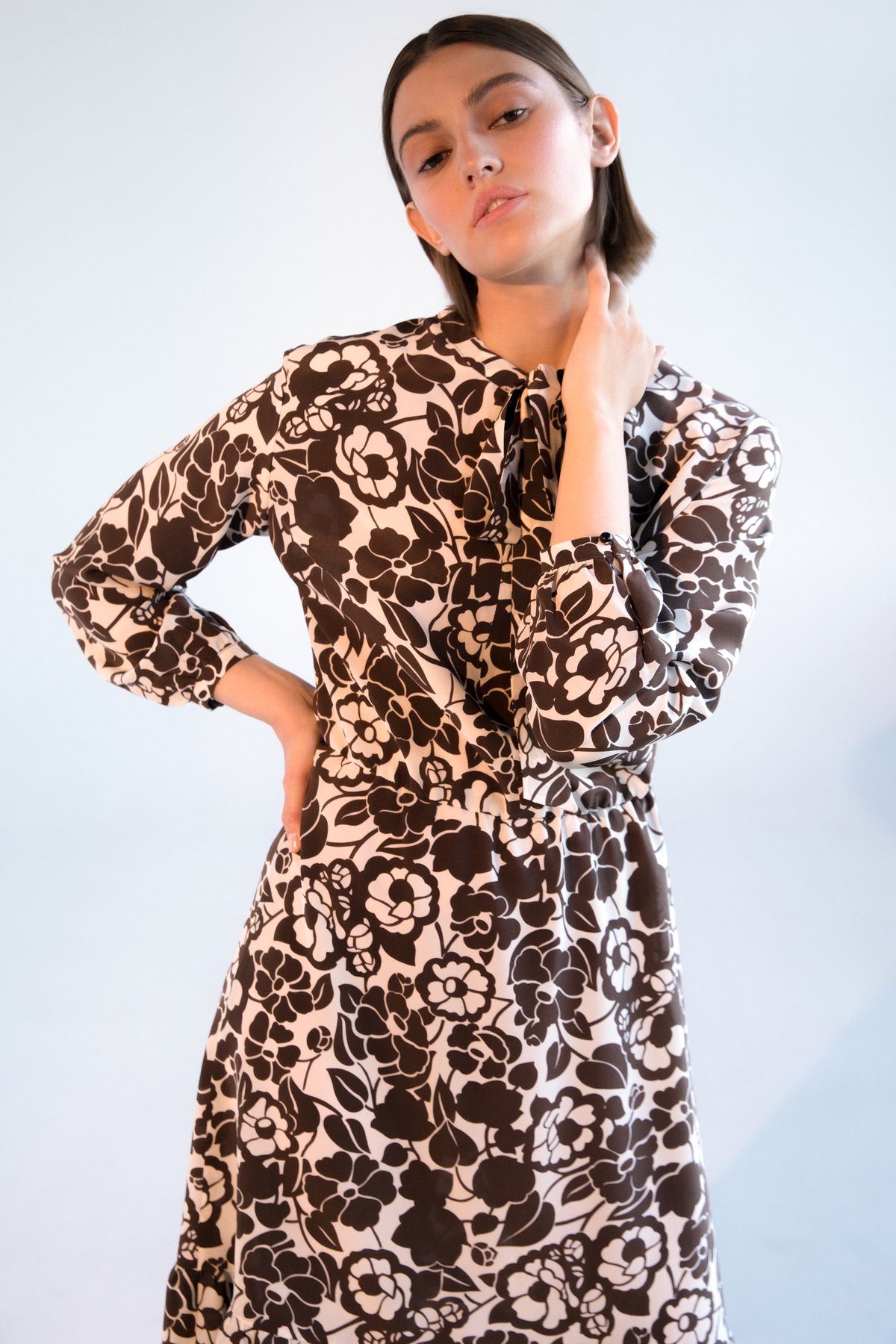 Платье из шелковой ткани в контрастный цветочный принт. Отрезное платье миди длины чуть ниже колена. Свободный рукав 3/4, бант на вороте.