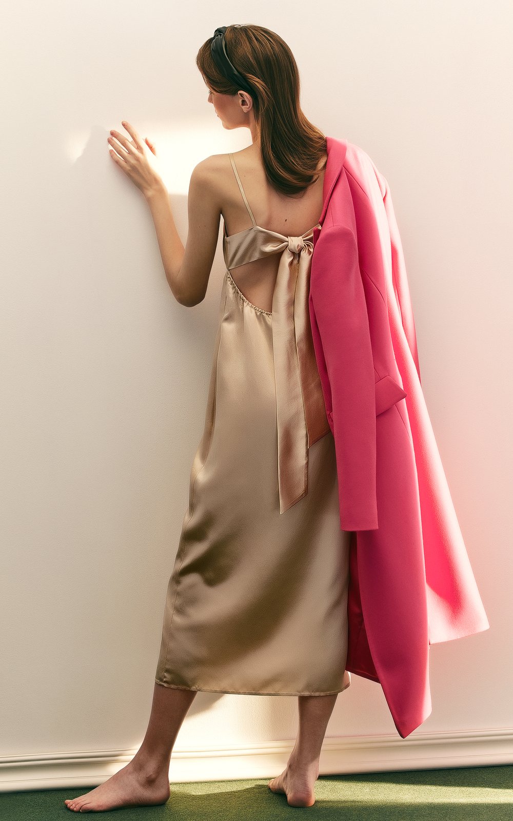 Платье макси длины из вискозной ткани с добавлением шелка. Модель воланом по низу и завязками на спине.