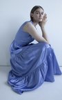 Платье из вискозной ткани добавлением шелка василькового оттенка. Модель ниже колена с резинкой на талии. Отрезное платье без рукавов