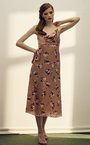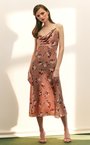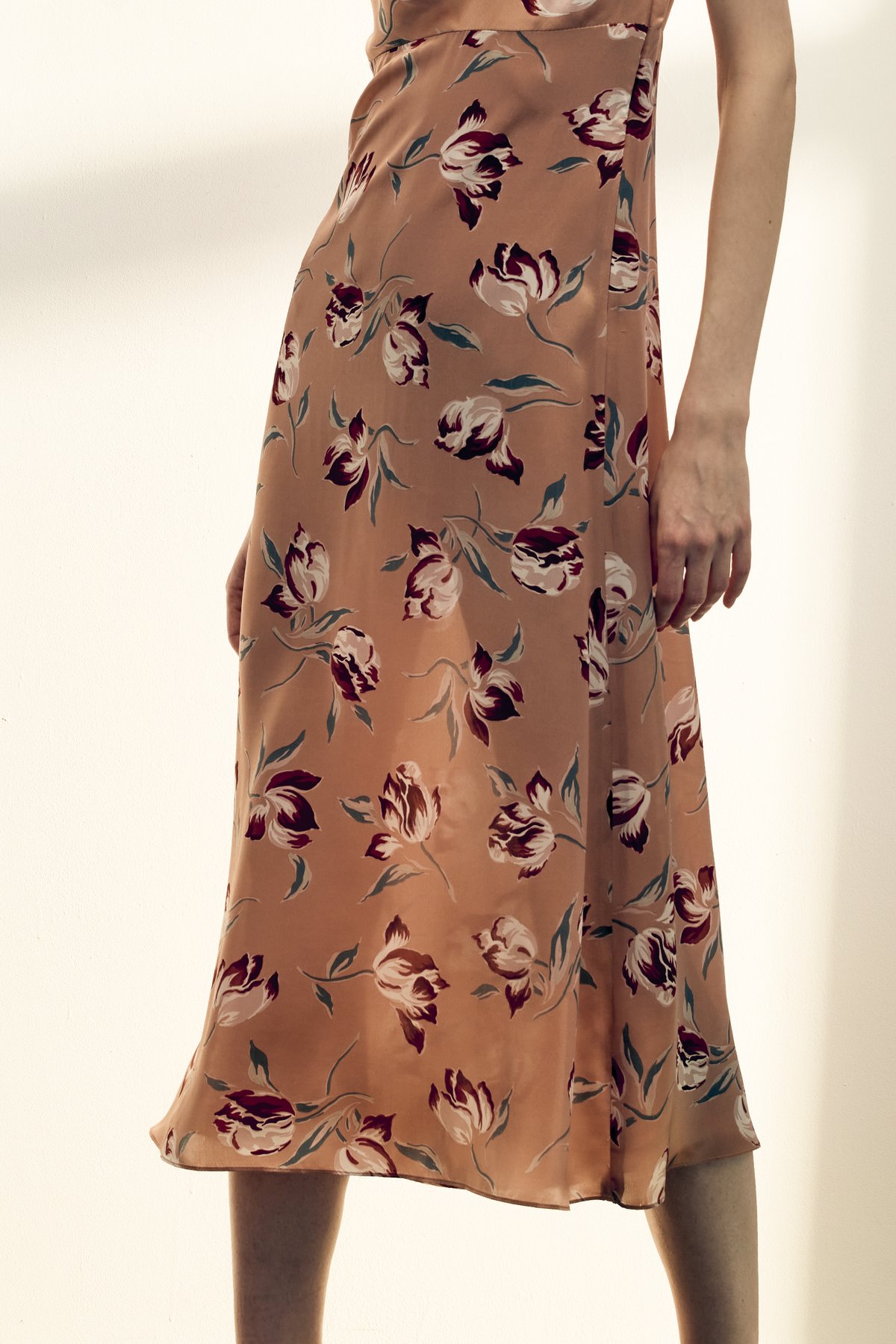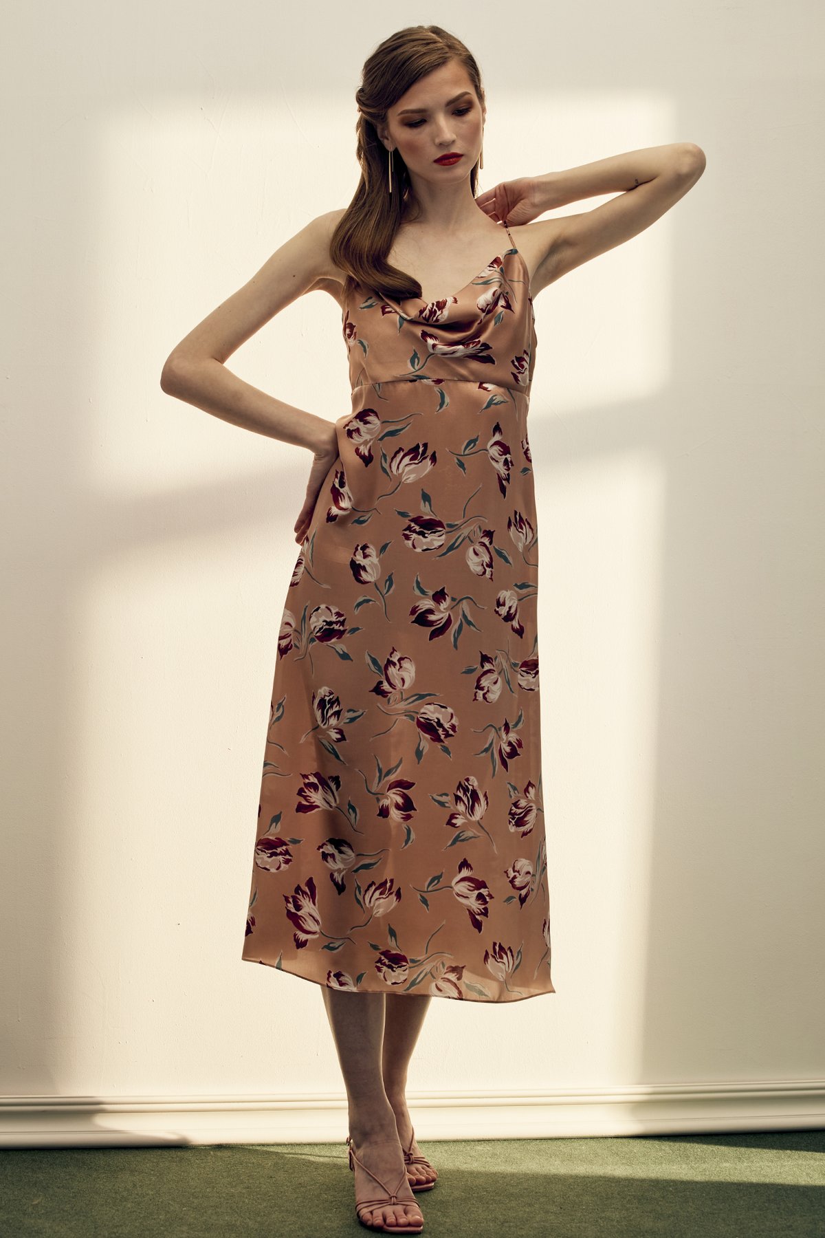 Прилегающее платье из шелка цветочным принятом на тонких брителях. Миди длинна, платье-качель.