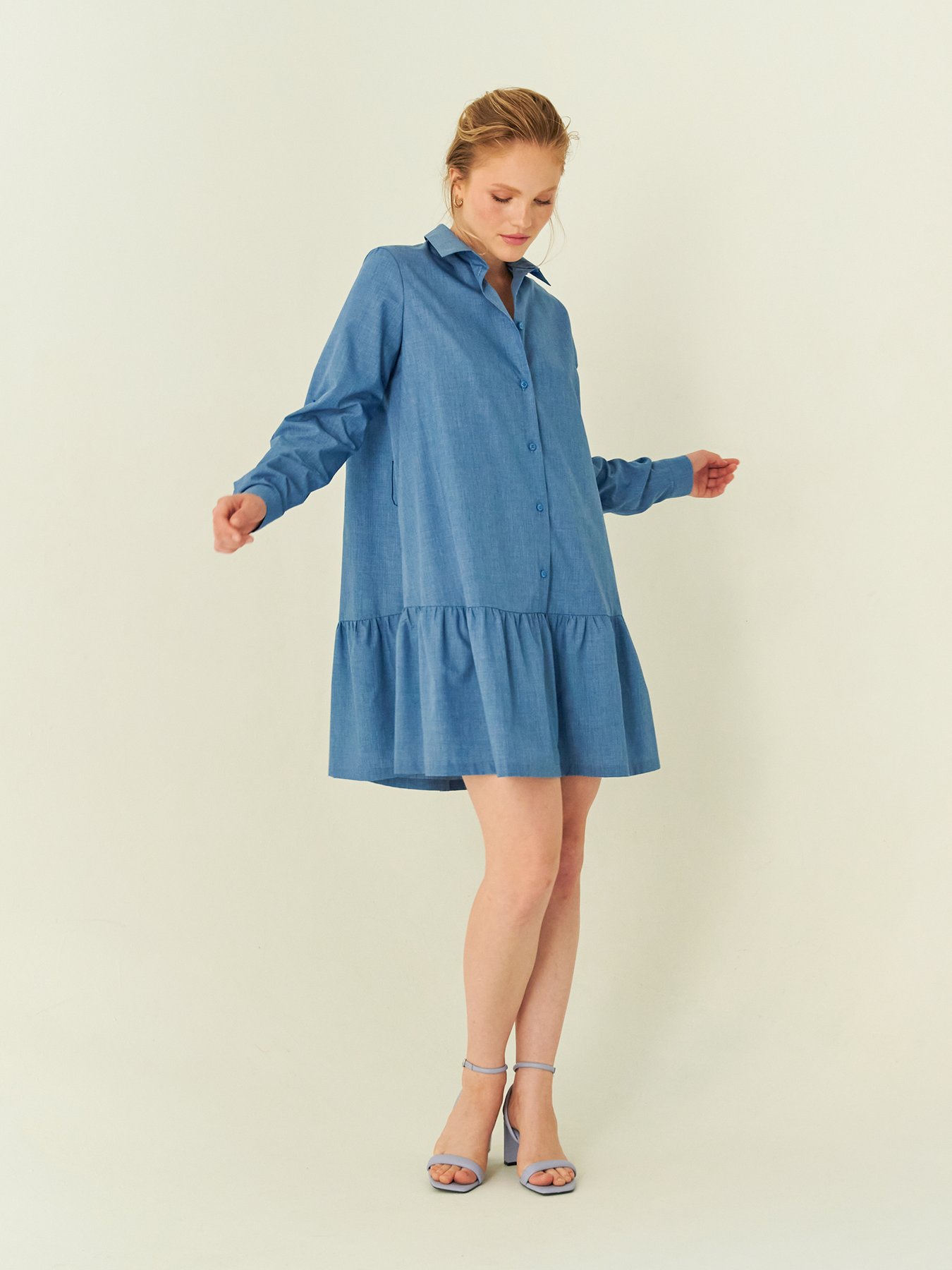 Платье-рубашка миди длины из тонкой хлопковой ткани светло-голубого оттенка деним. Укорочена модель на пуговицах, длинный рукав, модель с воланом.