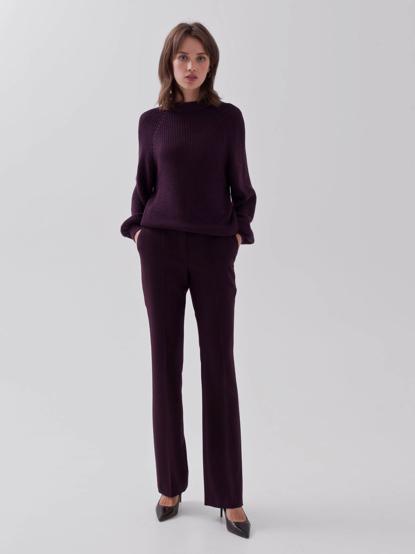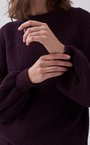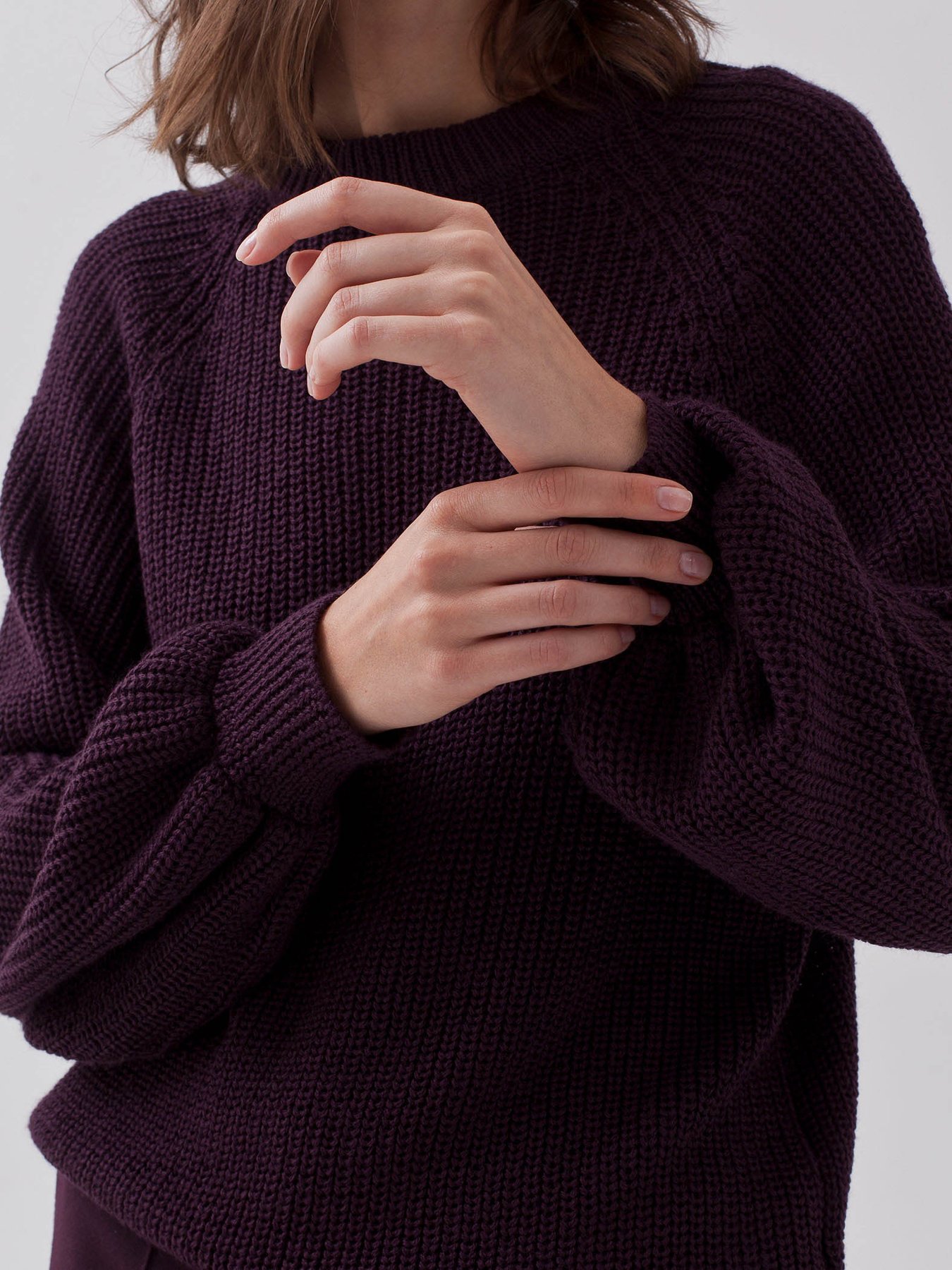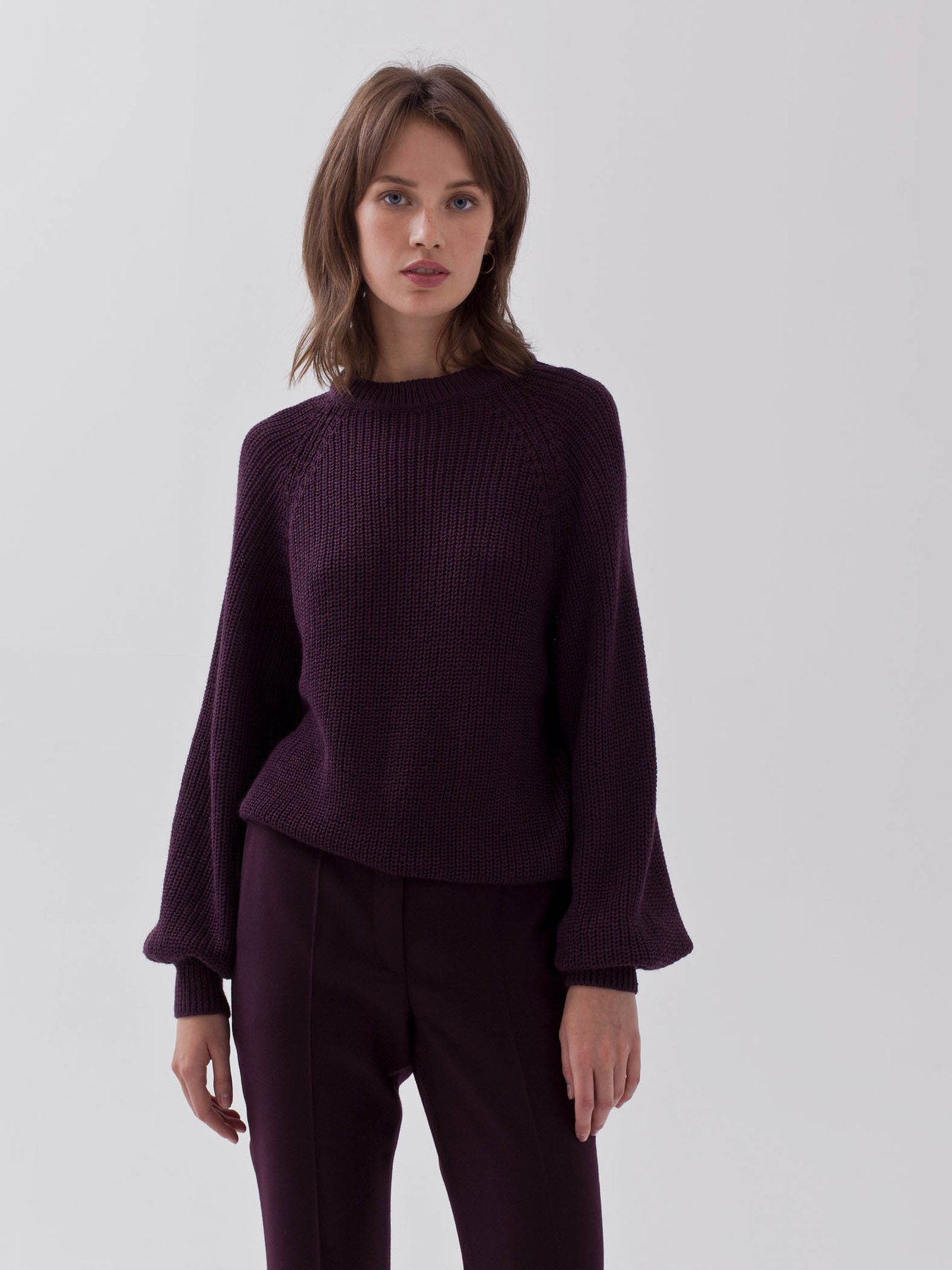 Джемпер с рукавом фонарик из смесовой шерстяной пряжи бордового оттенка.