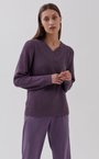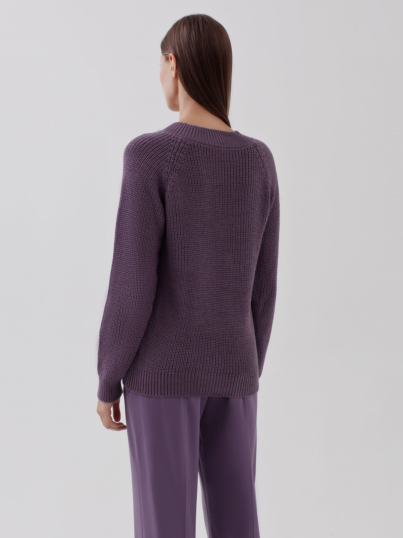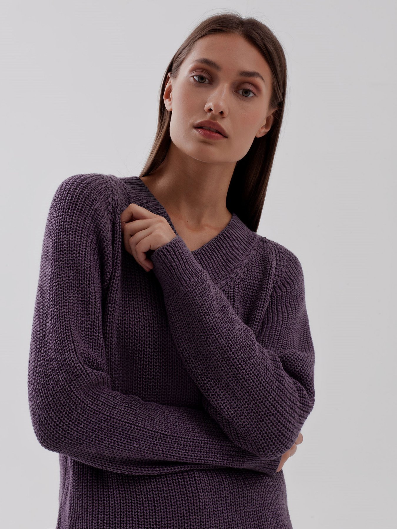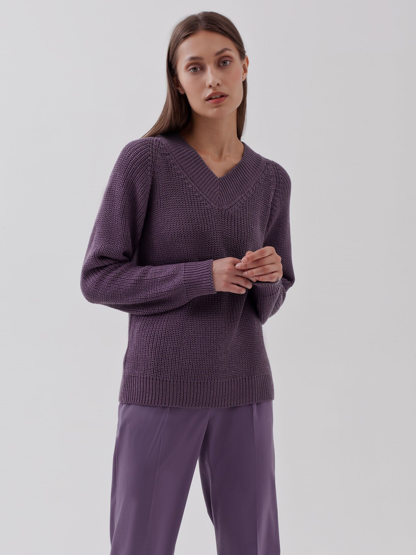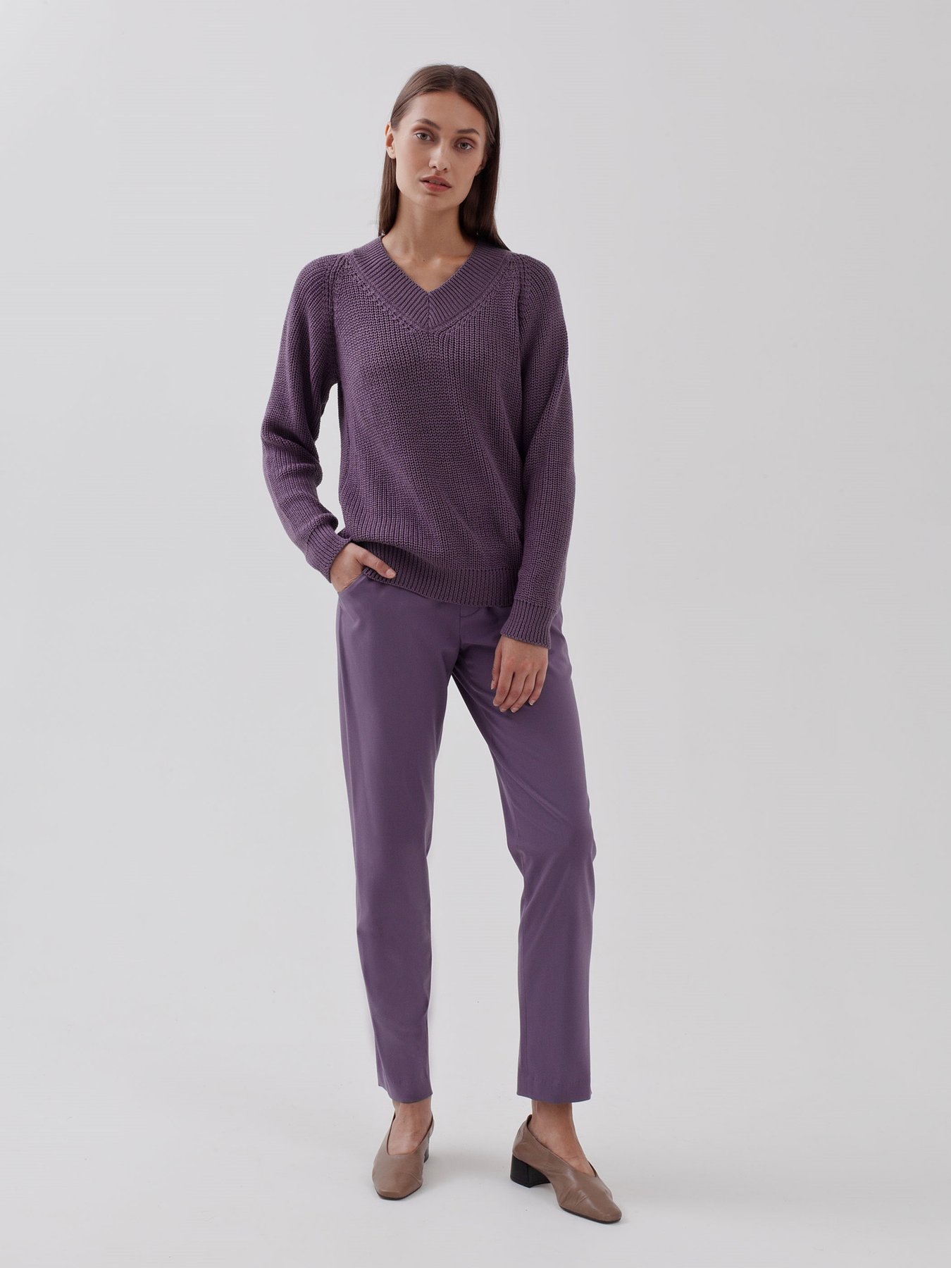 Свитер лилового оттенка с V-образным вырезом из смесовой шерсти с добавлением шерсти альпаки. Фотомодель: 80-58- 88, рост 174, надет размер XS