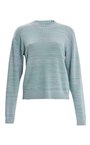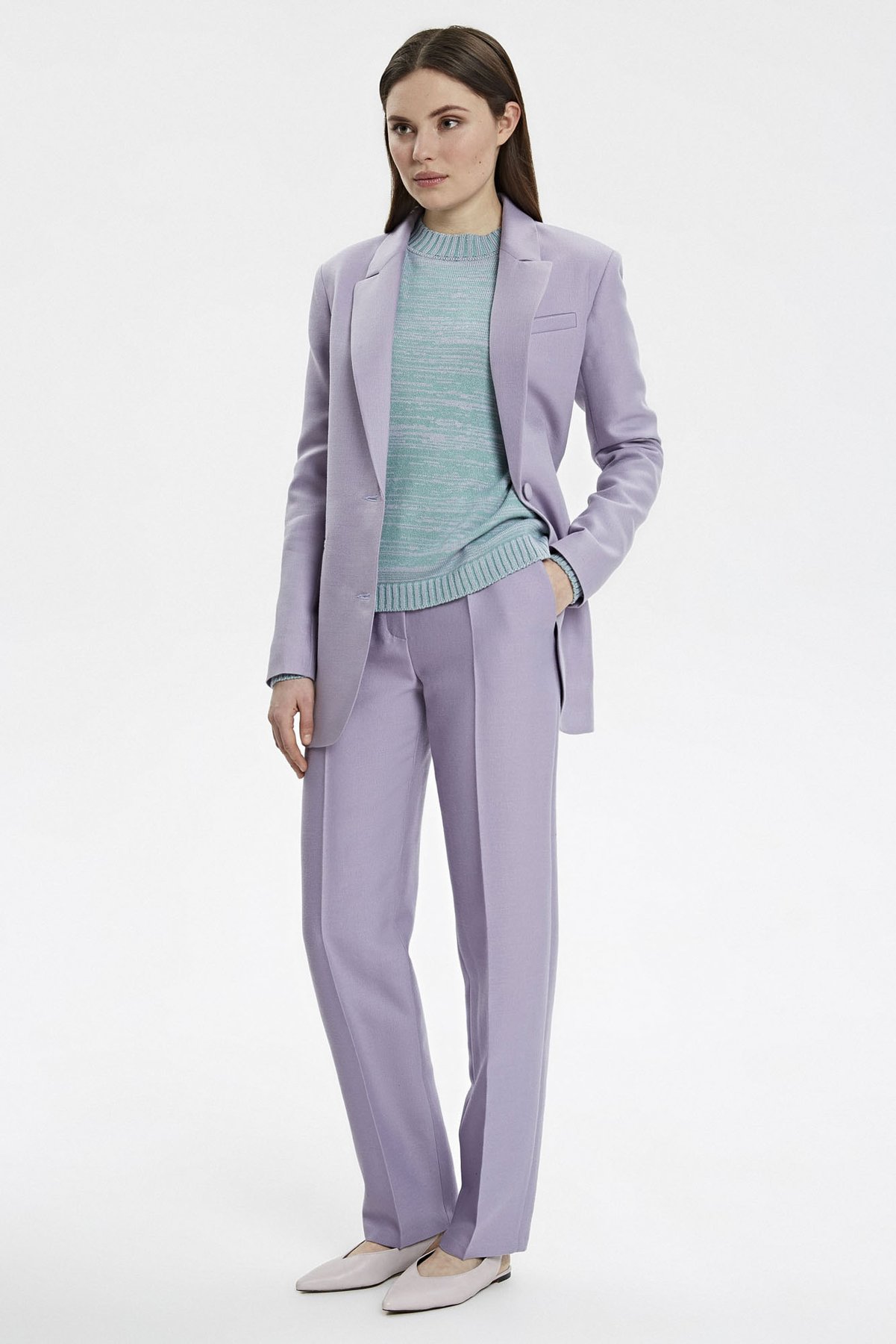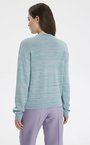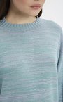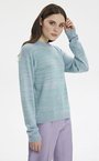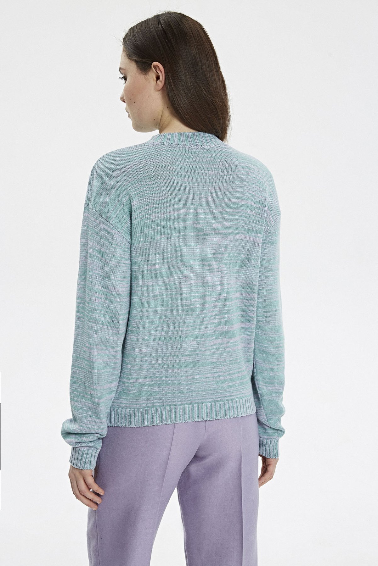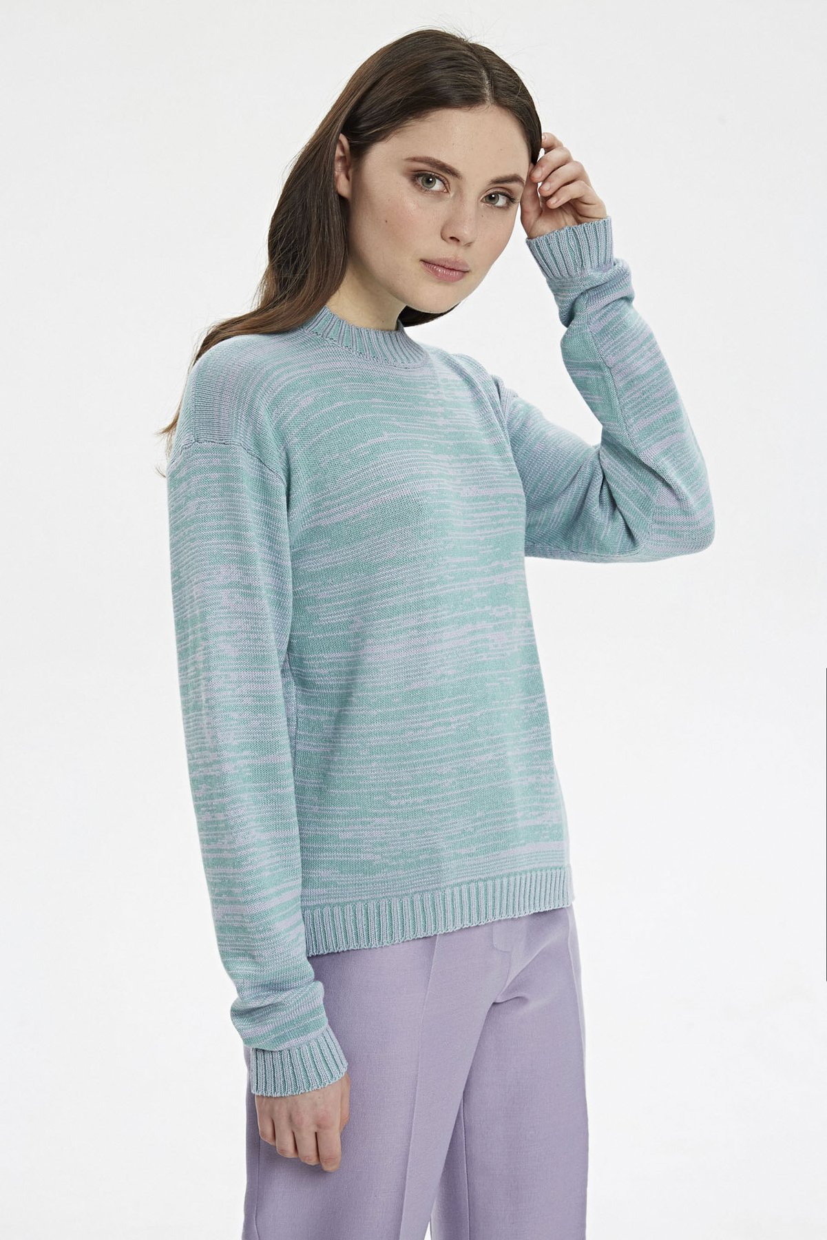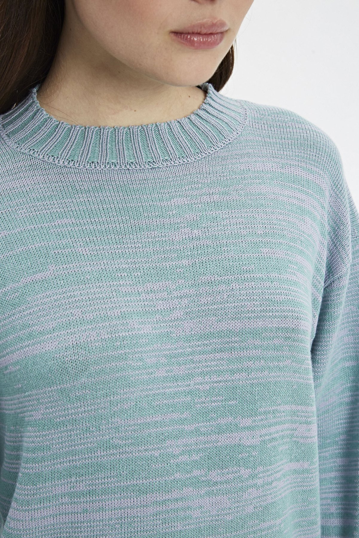 Мягкий джемпер из пряжи сиренево-бирюзового оттенка. Модель прилегающего свободного силуэта со спущенным рукавом.