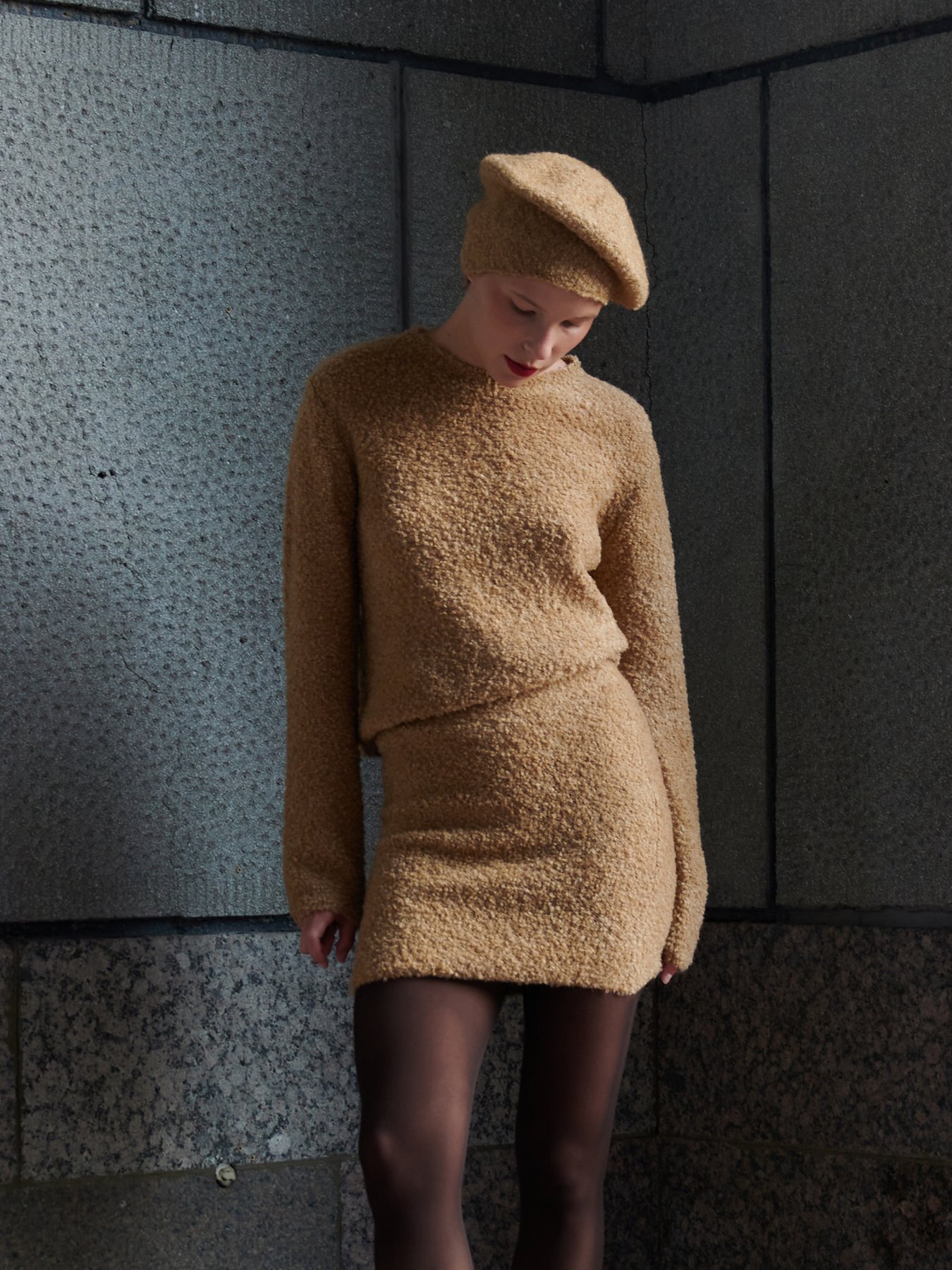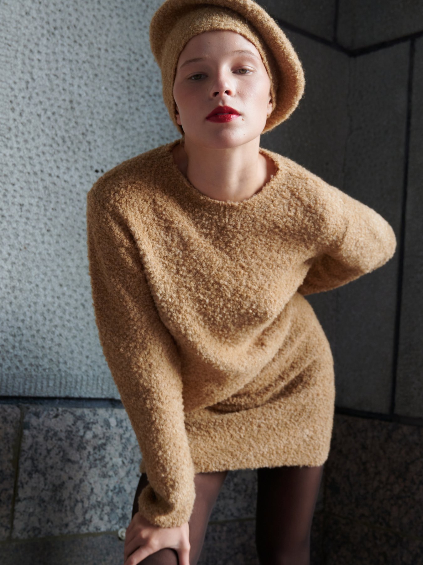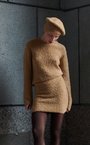 Чуть укорочённый джемпер оттенка «camel» фактурной вязки. Выполнен из смесовой шерсти с добавлением эластана.