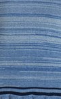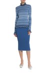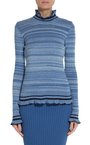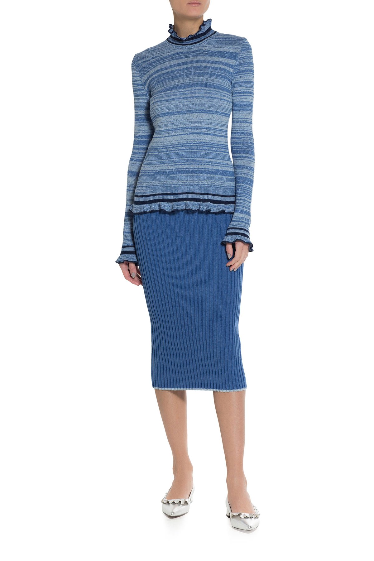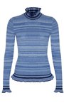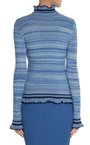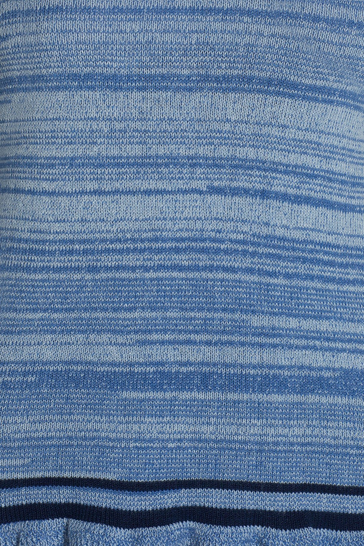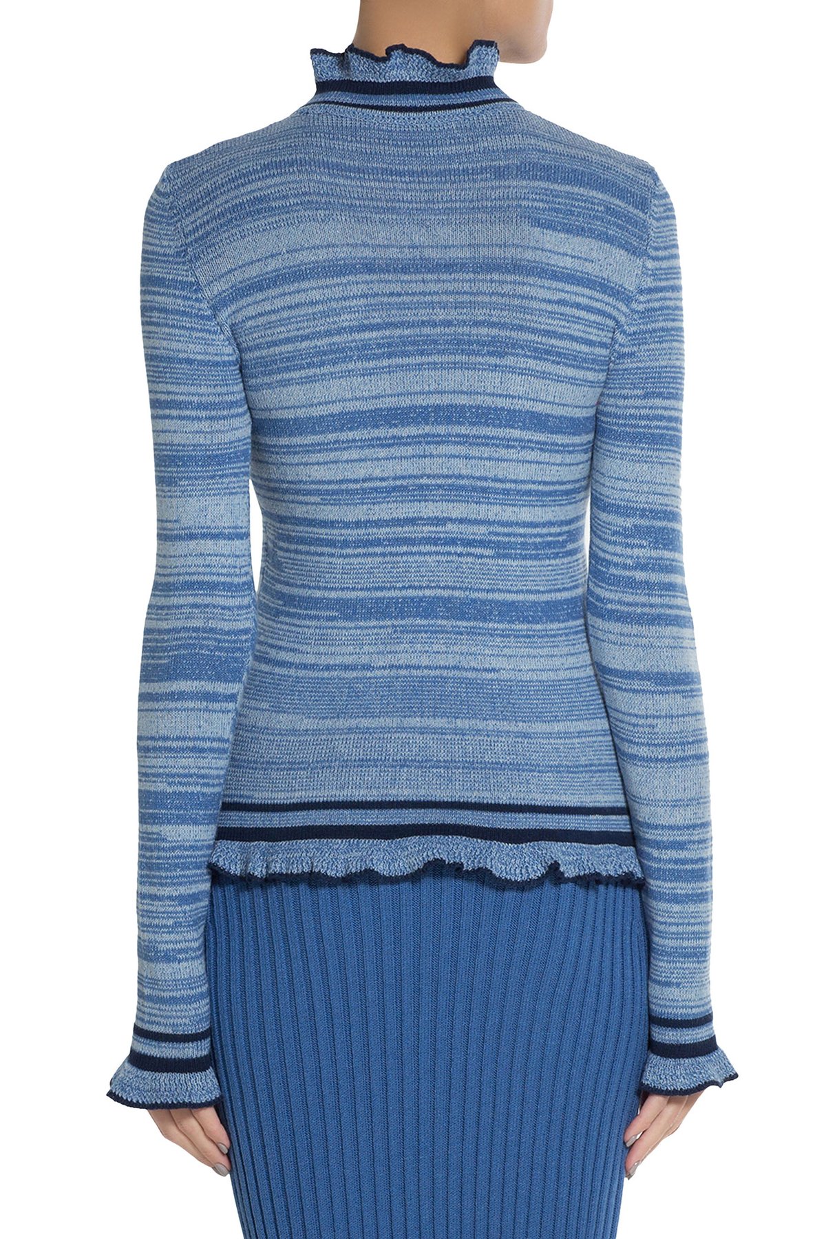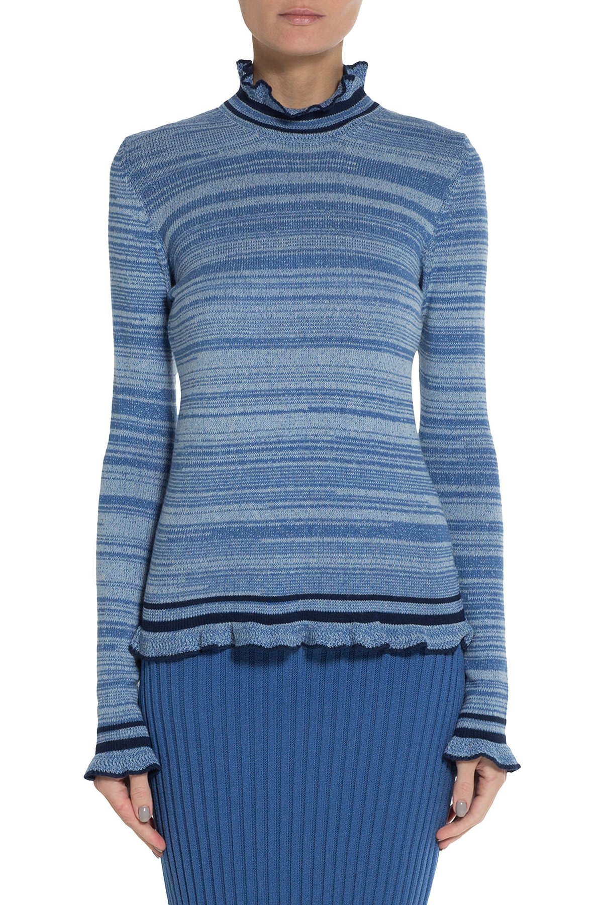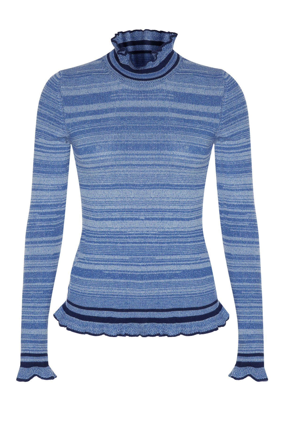 Джемпер с воротом из меланжевого трикотажа сине-голубого оттенка с контрастной отделкой. Изделие прилегающего силуэта с удлиненным рукавом, дополненное рюшами