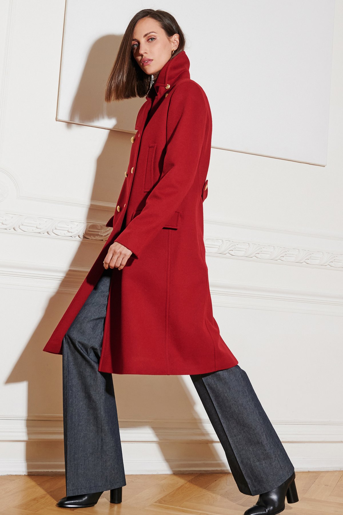 Удлиненное двубортное пальто из шерстяной ткани оттенка фалунский красный. Золотые пуговицы. Прорезные карманы. Карманы с клапанами.