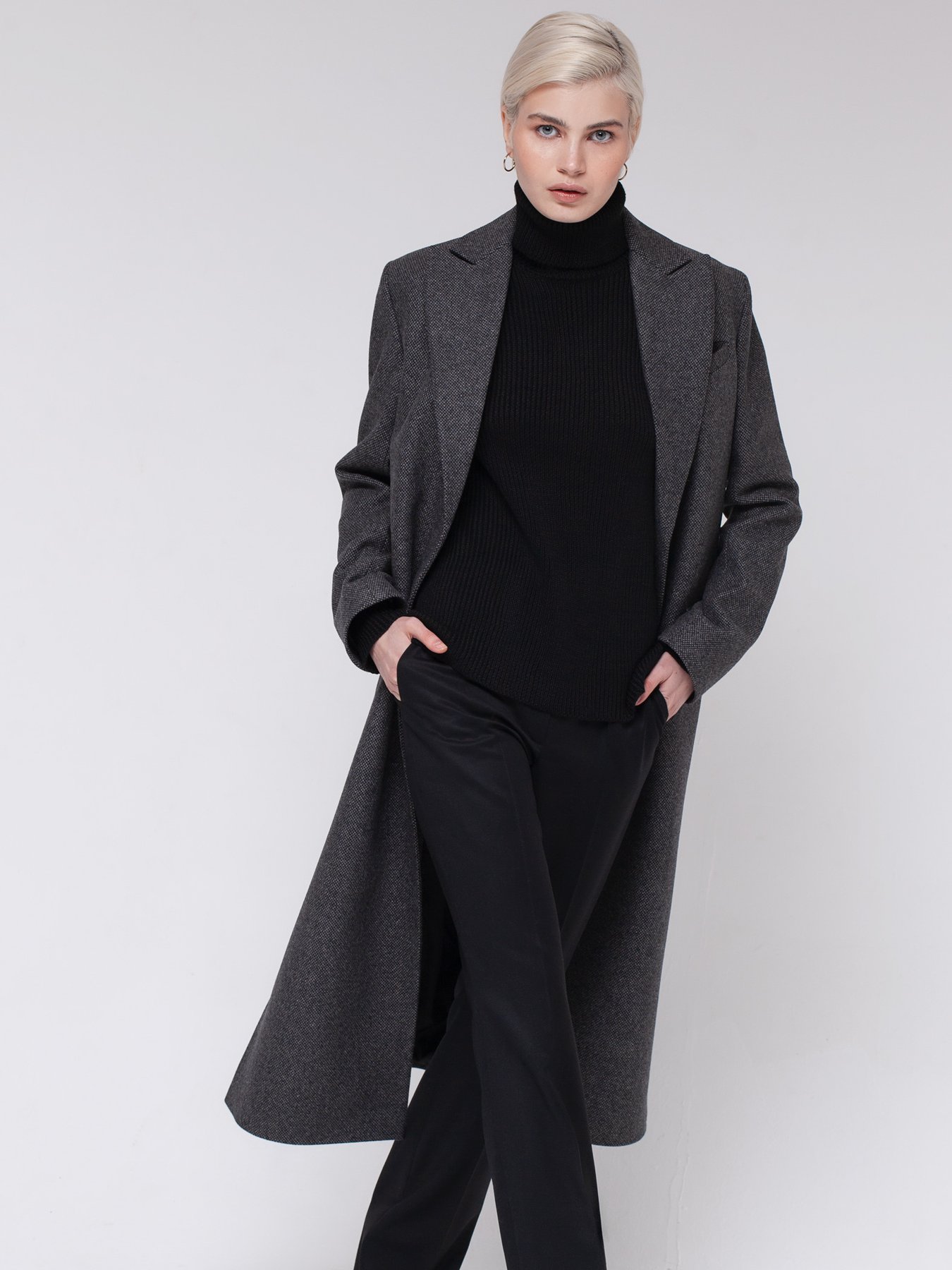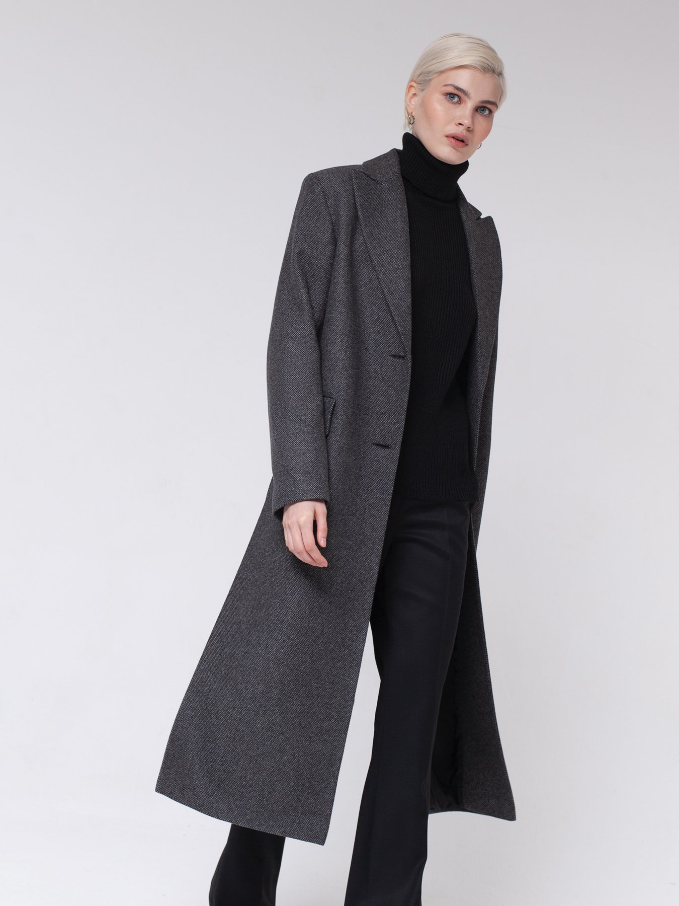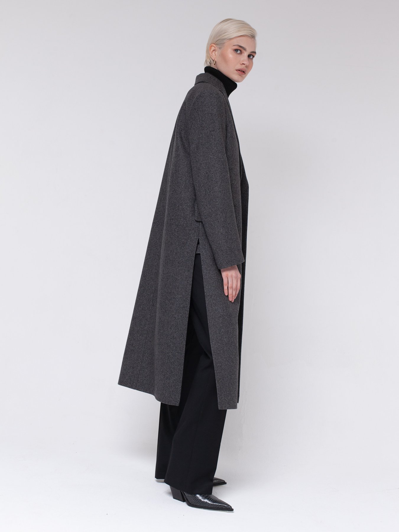 Однобортное темно-серое пальто с широкими лацканами. Модель с глубокими разрезами по бокам, английский воротник. Удлиненное изделие, дополнительные застежки на разрезах.