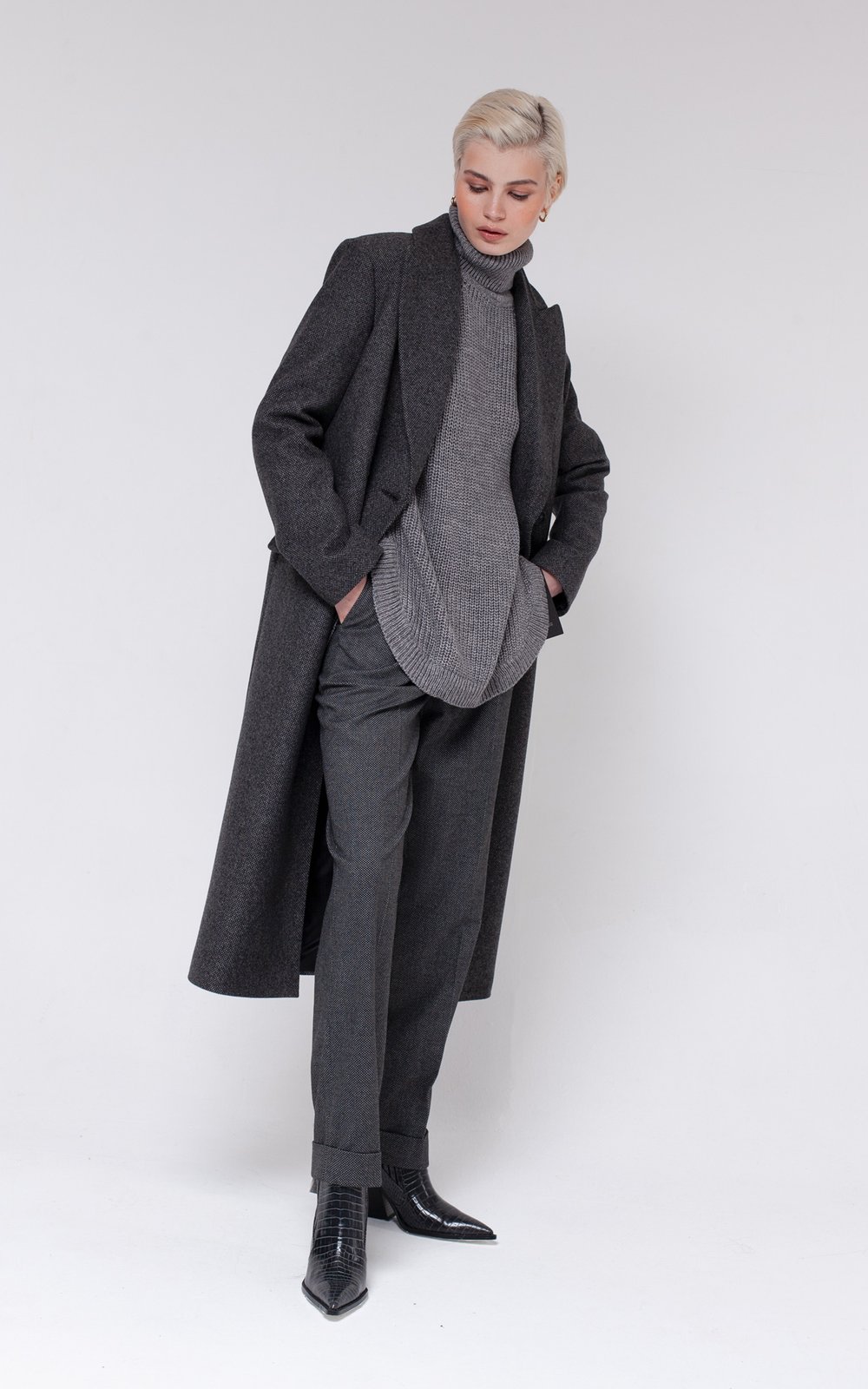 Двубортное пальто из итальянской шерстяной ткани «соль/перец» Изделие дополнено шерстяным утеплителем, стёганый подклад. Боковые карманы с клапанами.
