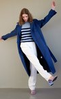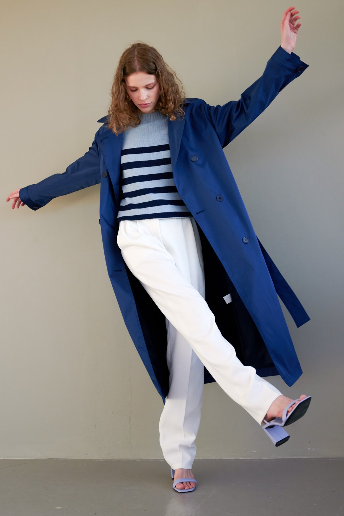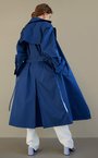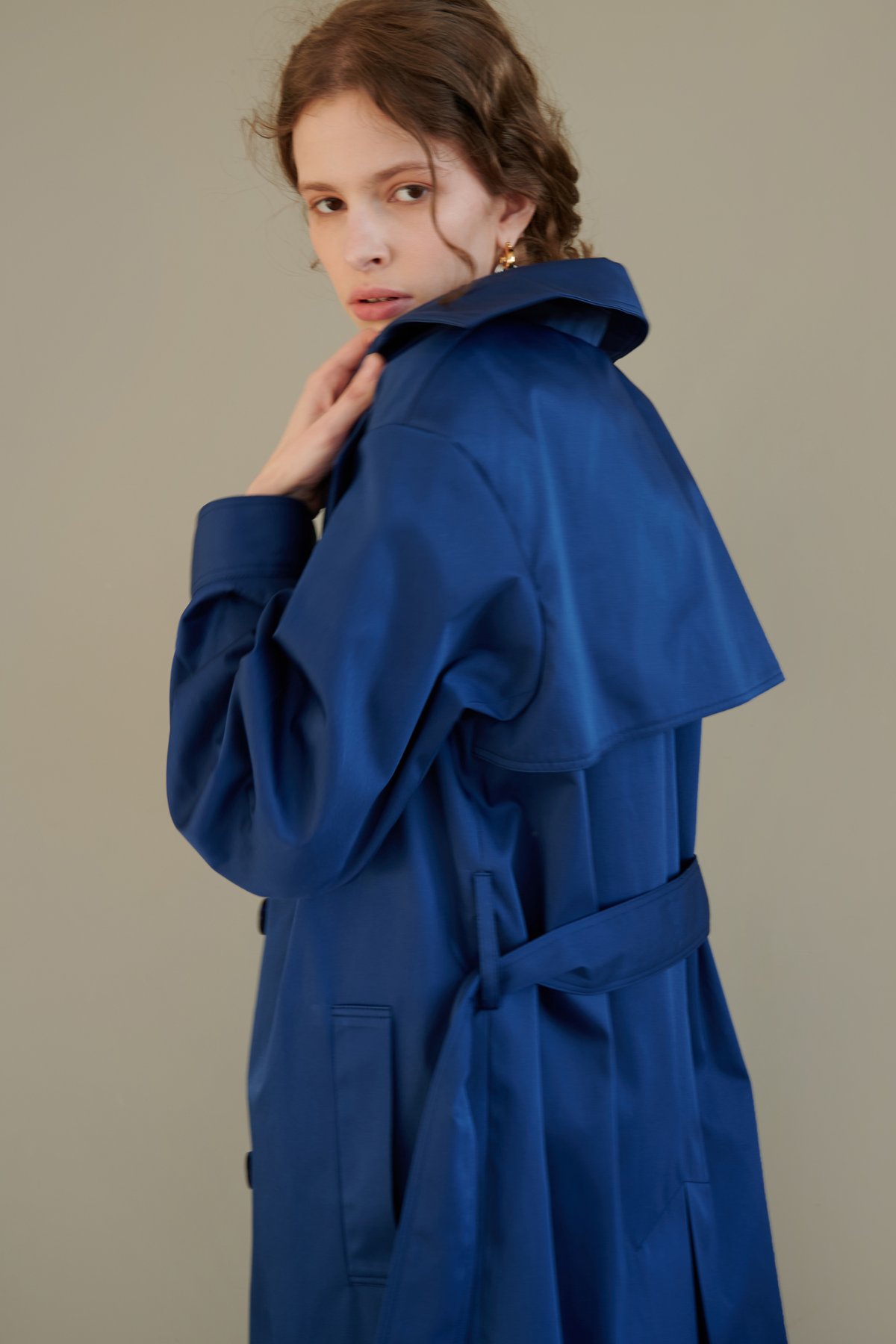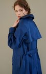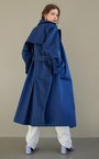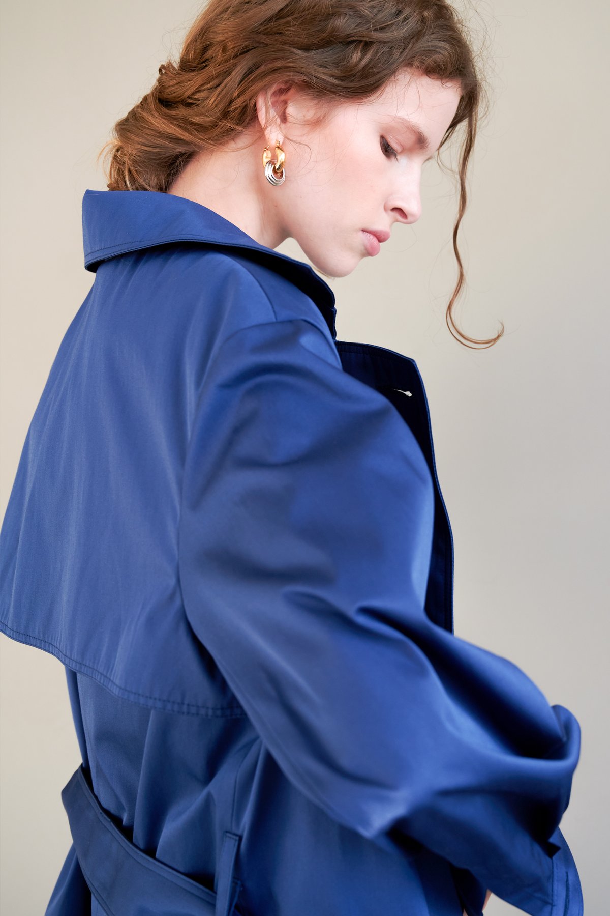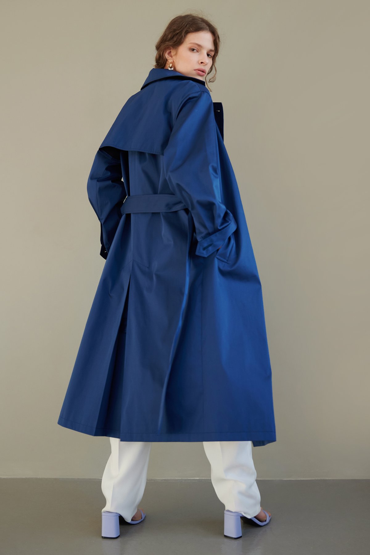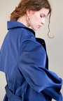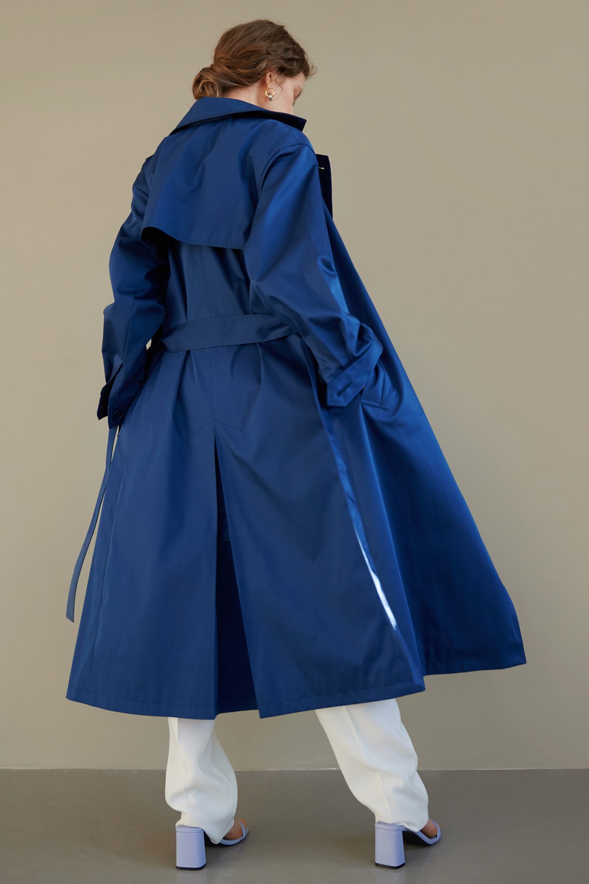 Плащ из влагоотталкивающей хлопковой ткани синего оттенка. Двубортная модель с поясом