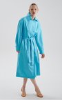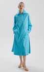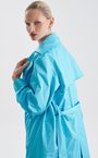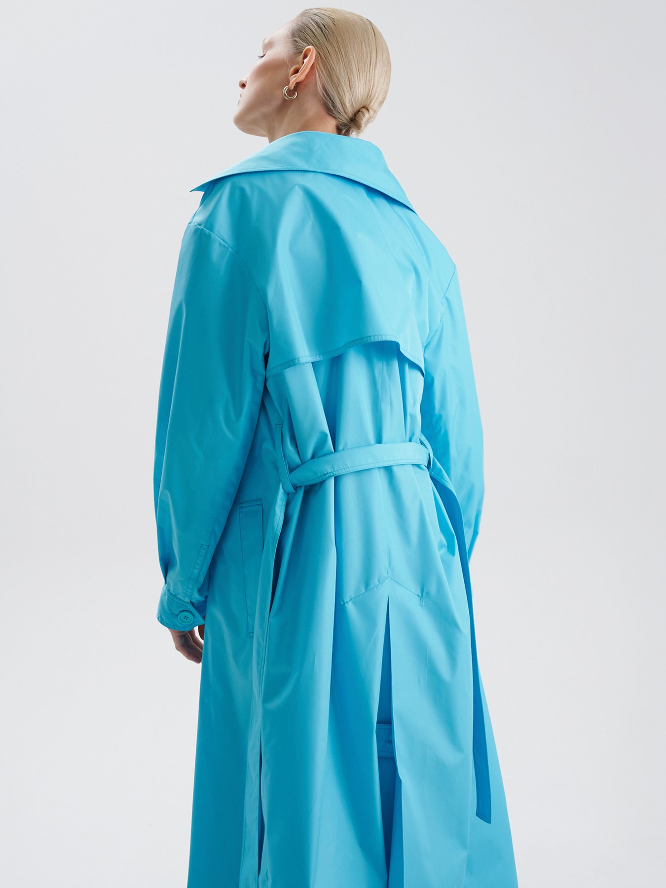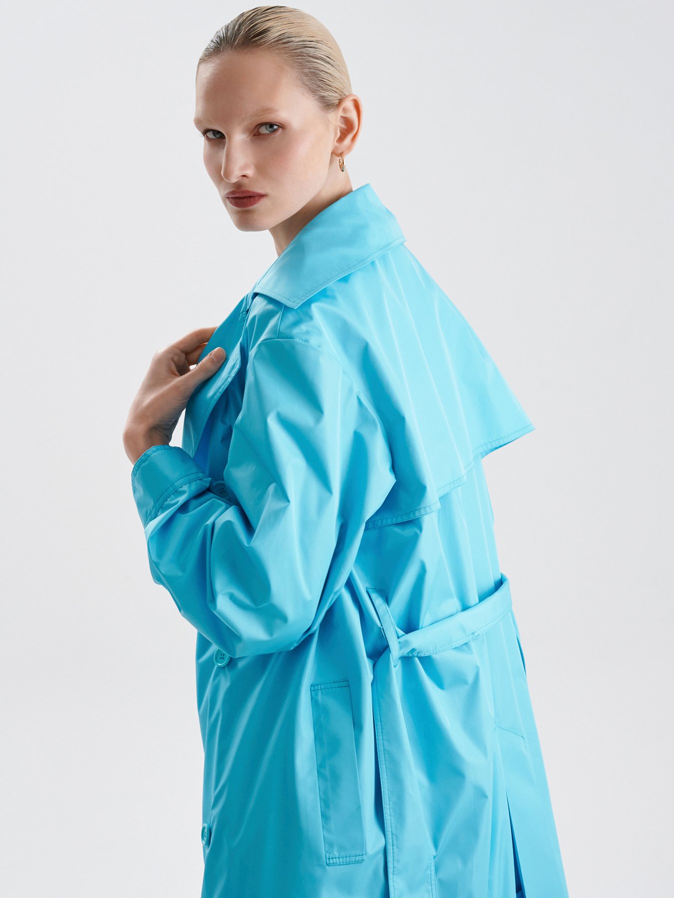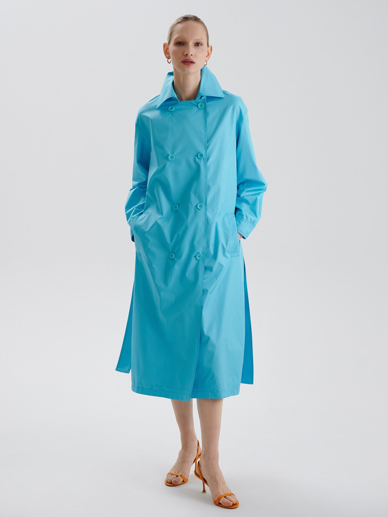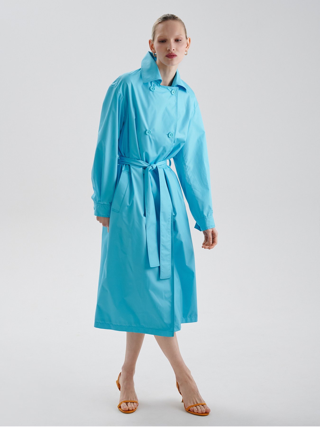 Двубортная модель плаща c поясом, боковые карманы, пояс, пуговицы в тон.