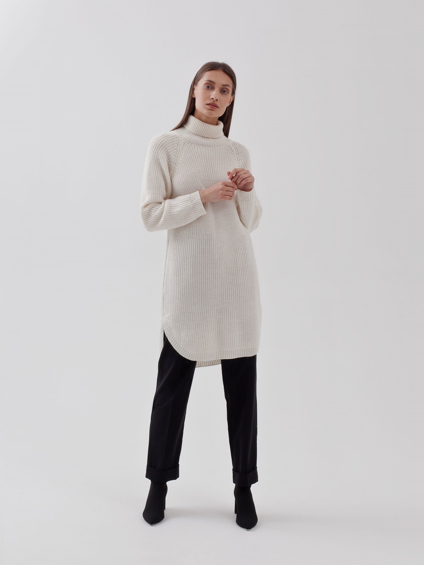 Удлиненный свитер из шерсти молочного оттенка. Модель с высоким воротом и чуть удлиненной спинкой.