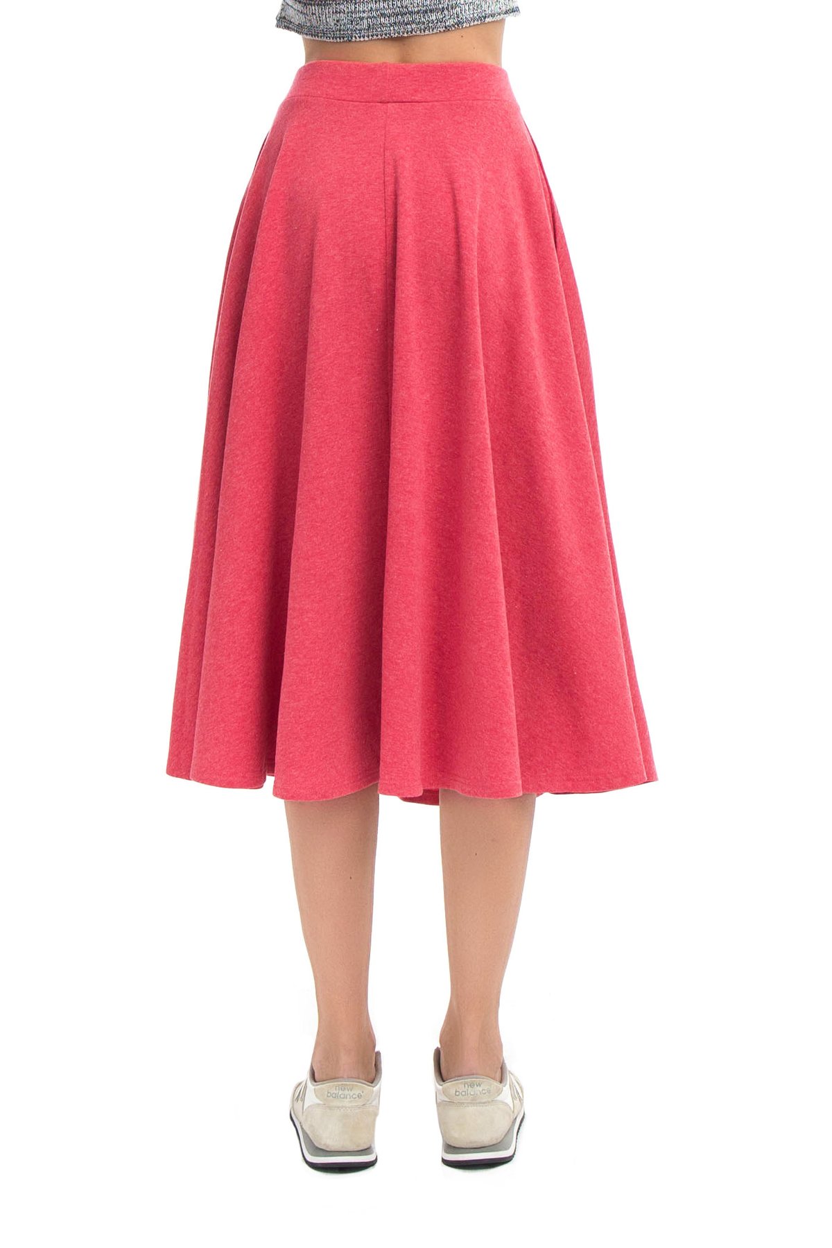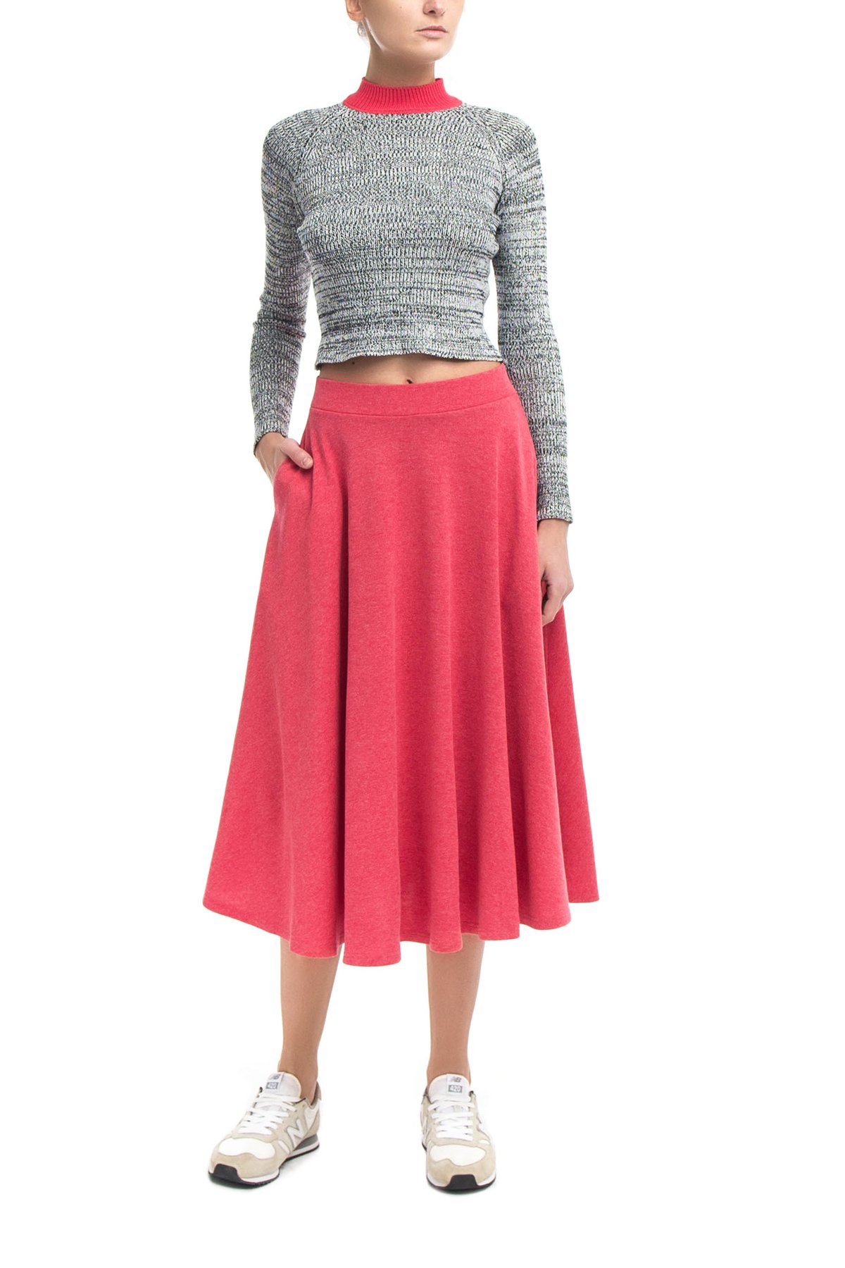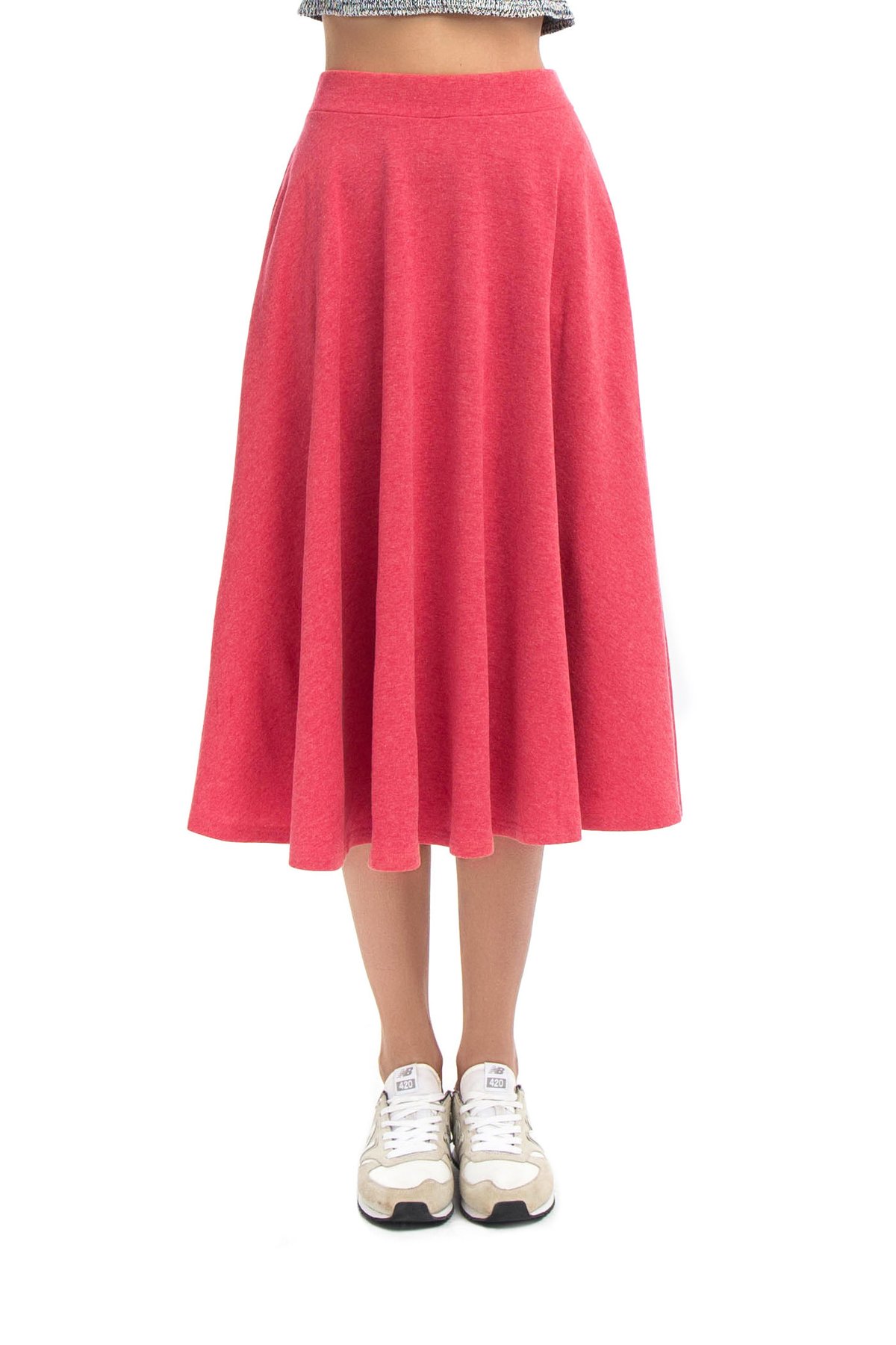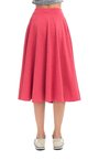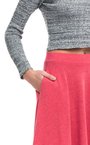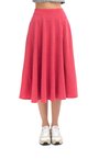 Юбка из мягкого материала кораллового оттенка. Расклешенное изделие с посадкой на талии на резинке. Модель дополнена боковыми карманами.