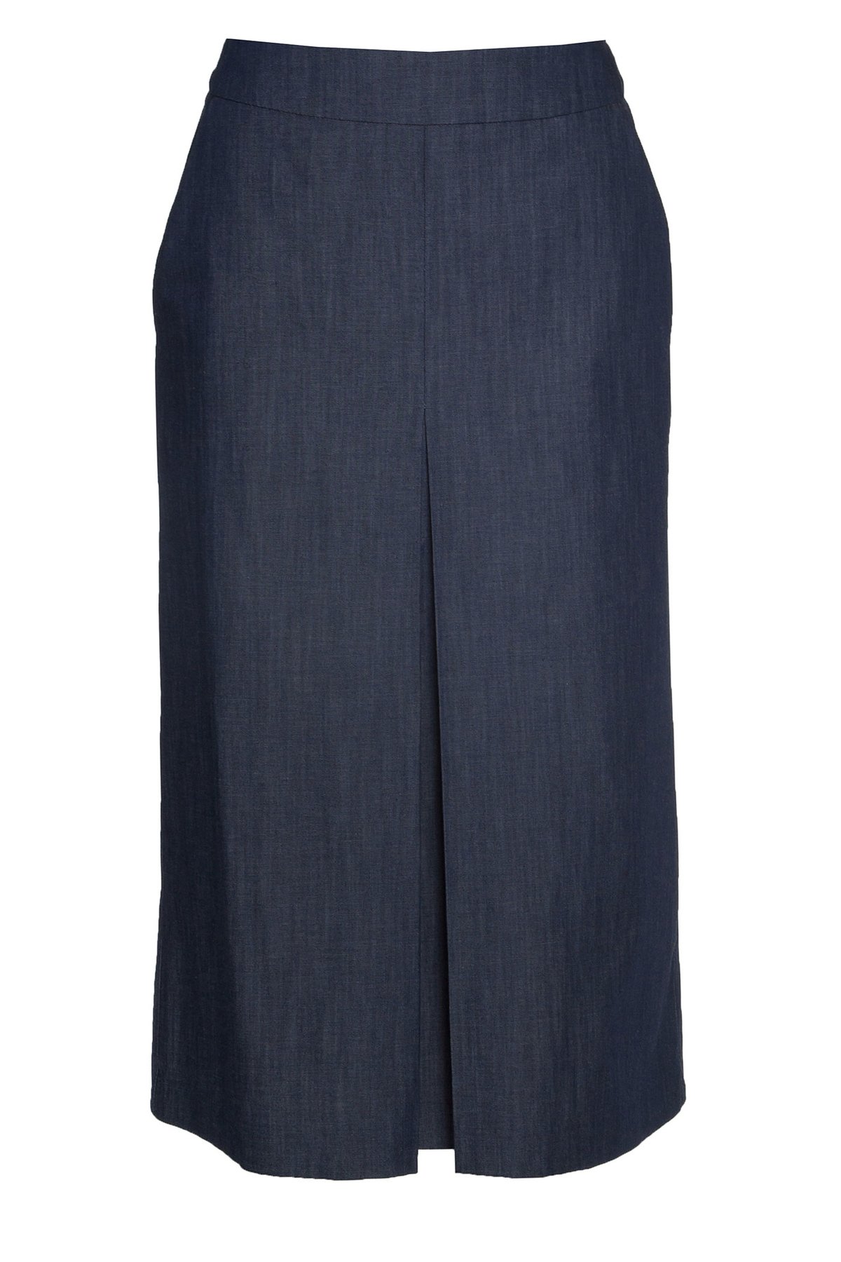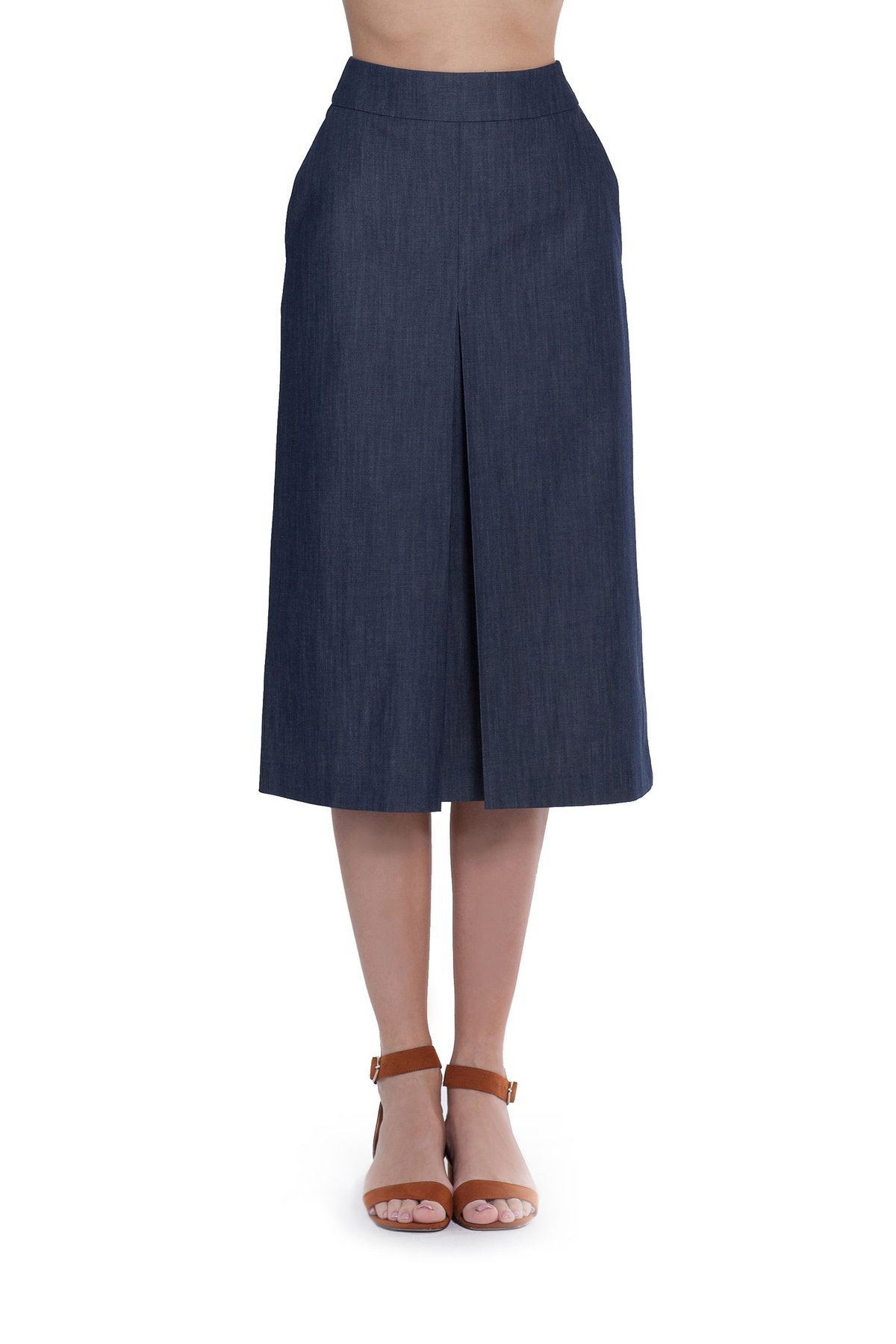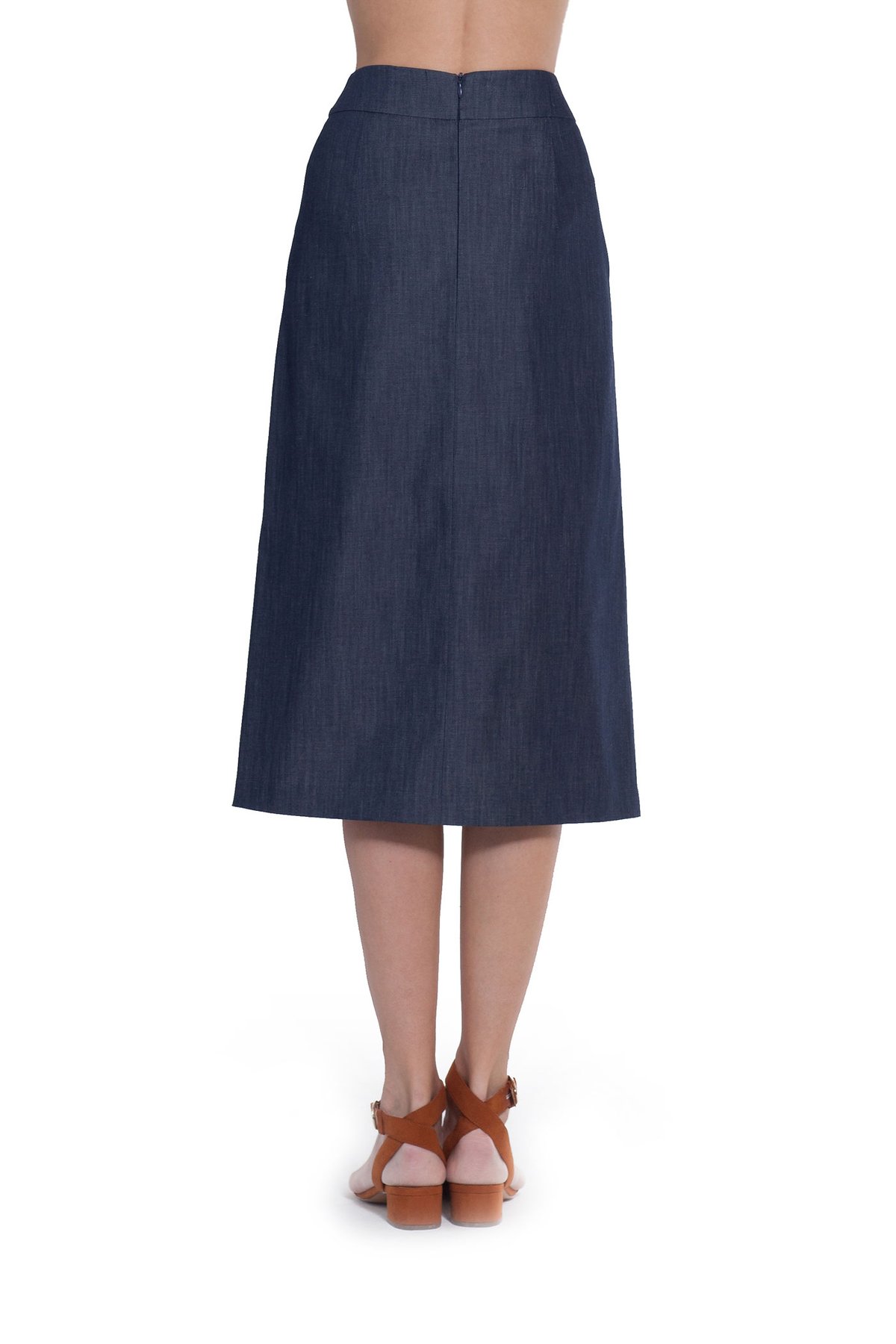 Юбка-миди из денима темно-синего оттенка. Модель прямого силуэта выполнена с высокой посадкой на талии и дополнена двумя карманами. Изделие с встречной складкой с лицевой стороны и застежкой на спине на потайную молнию.