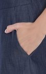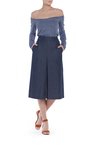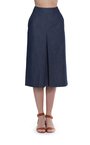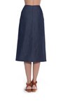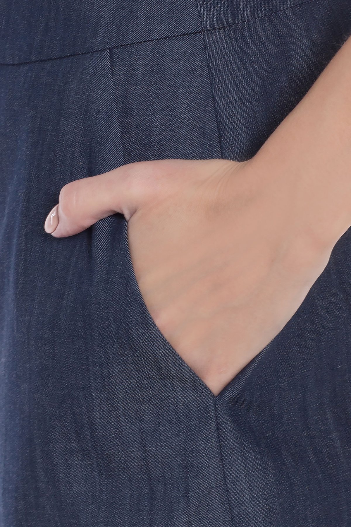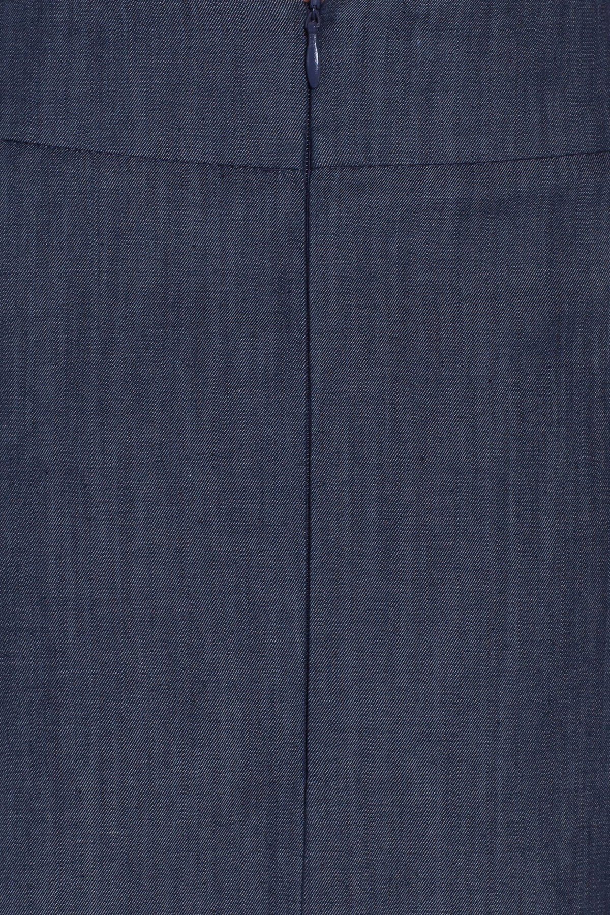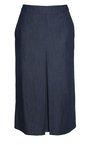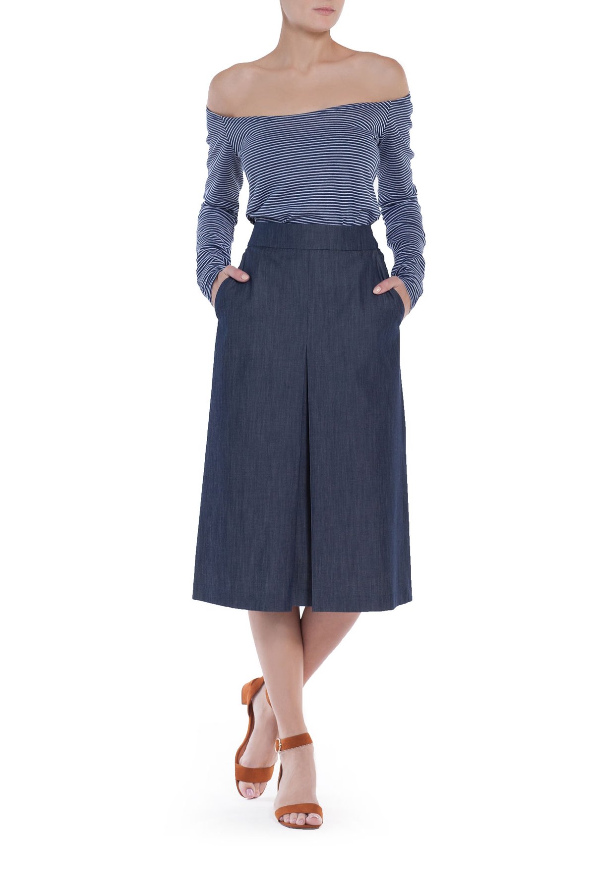 Юбка-миди из денима темно-синего оттенка. Модель прямого силуэта выполнена с высокой посадкой на талии и дополнена двумя карманами. Изделие с встречной складкой с лицевой стороны и застежкой на спине на потайную молнию.