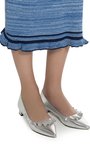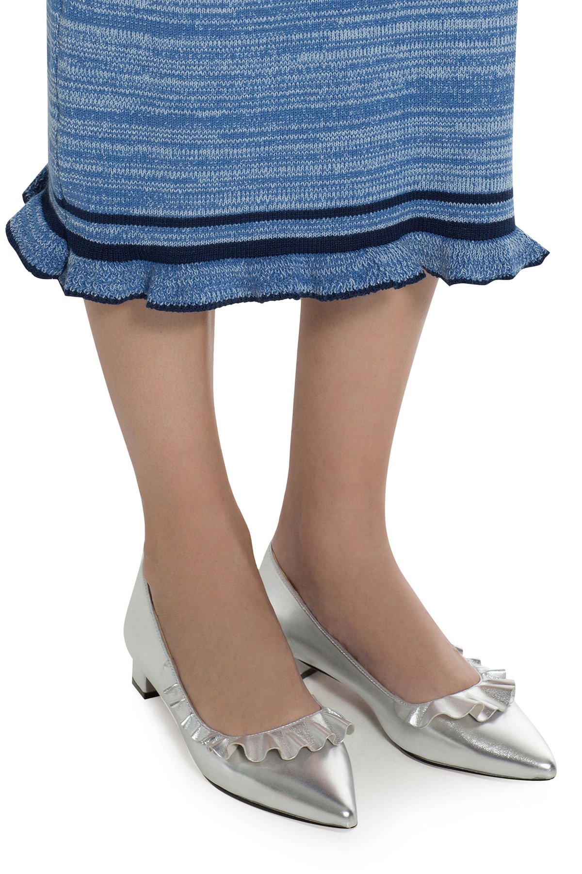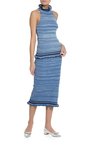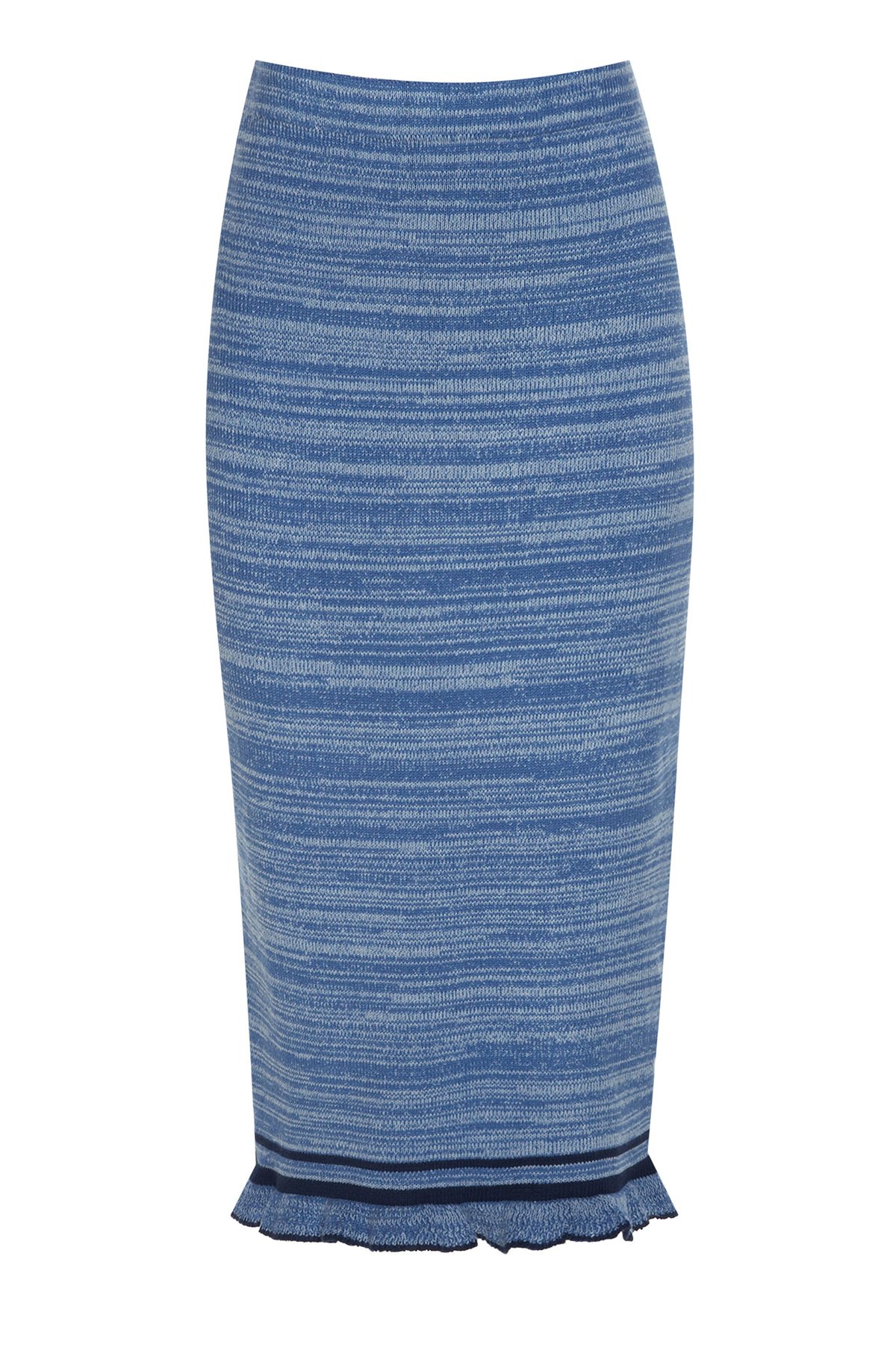 Юбка миди длины из вискозного трикотажа меланжевого плетения синевато-голубого оттенка. Изделие с воротом-стойкой, дополненное воланом и контрастной отделкой. Модель прилегающего силуэта.