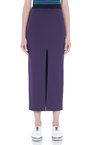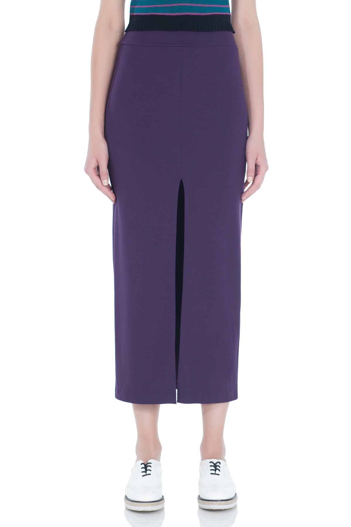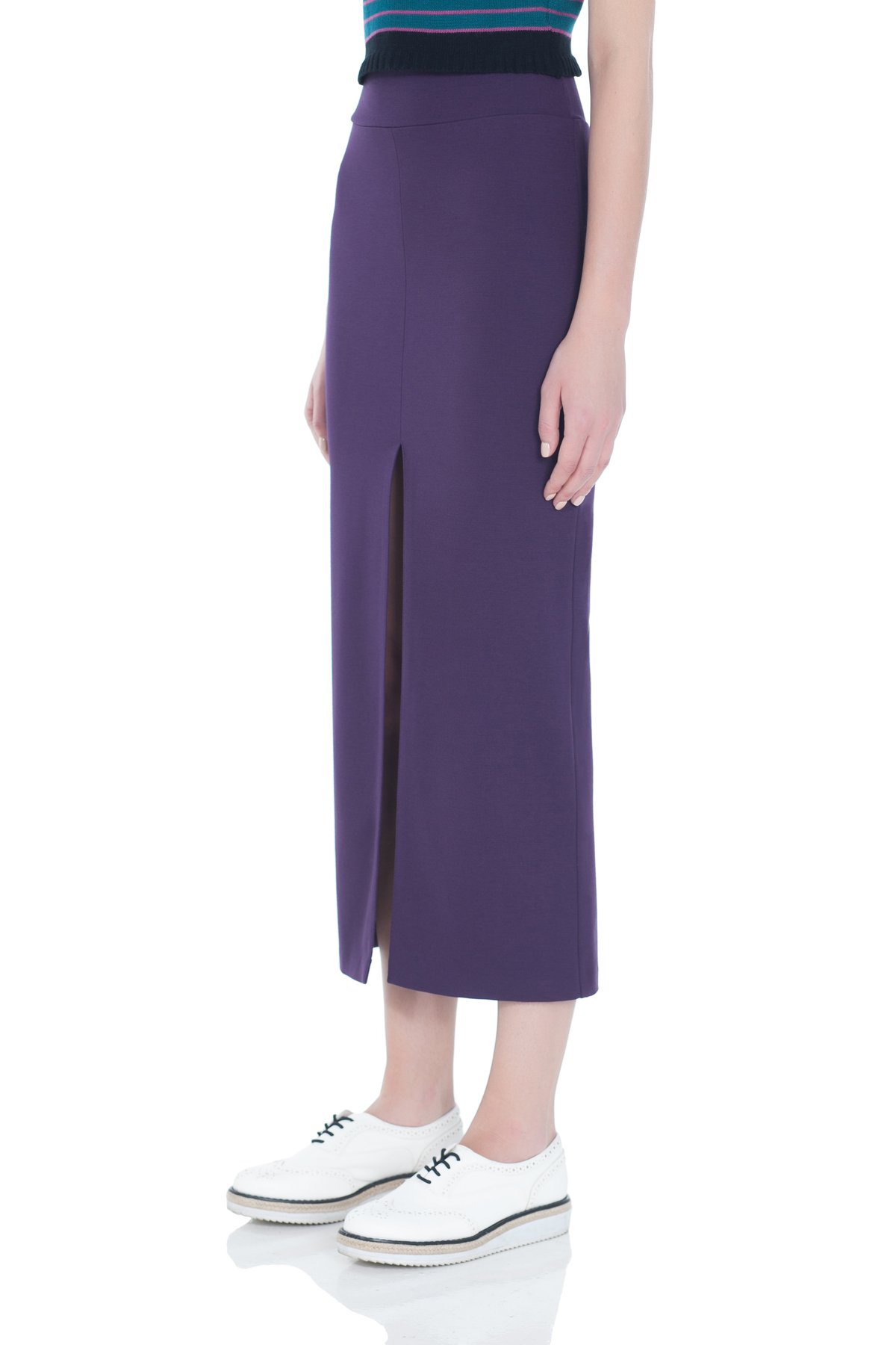 Юбка фиолетового цвета из плотной трикотажной ткани джерси. Модель выполнена с высоким разрезом спереди и с широким поясом