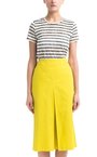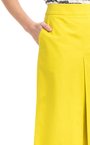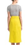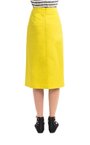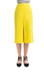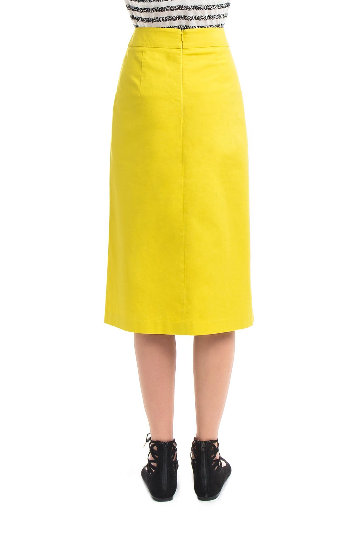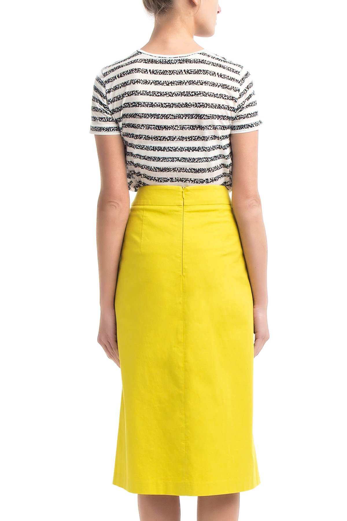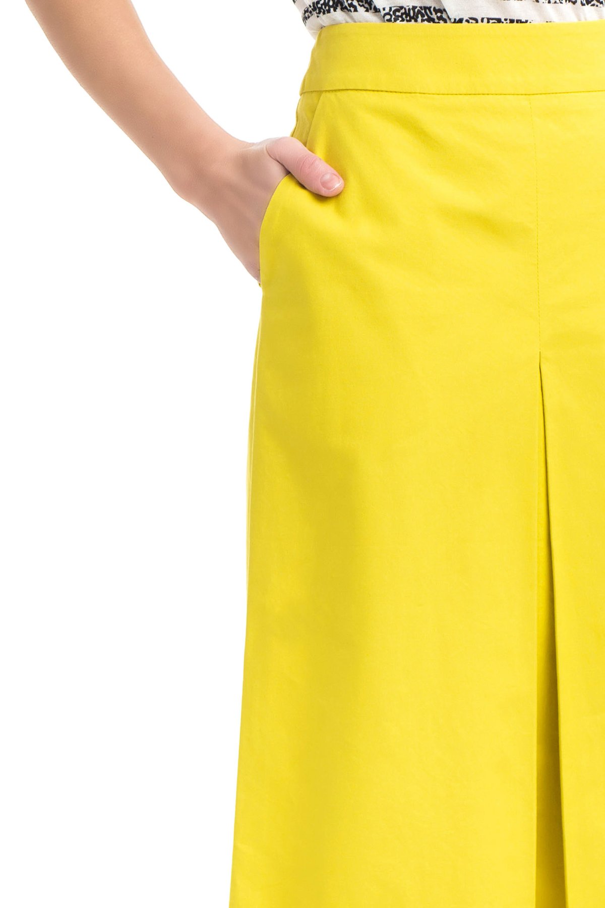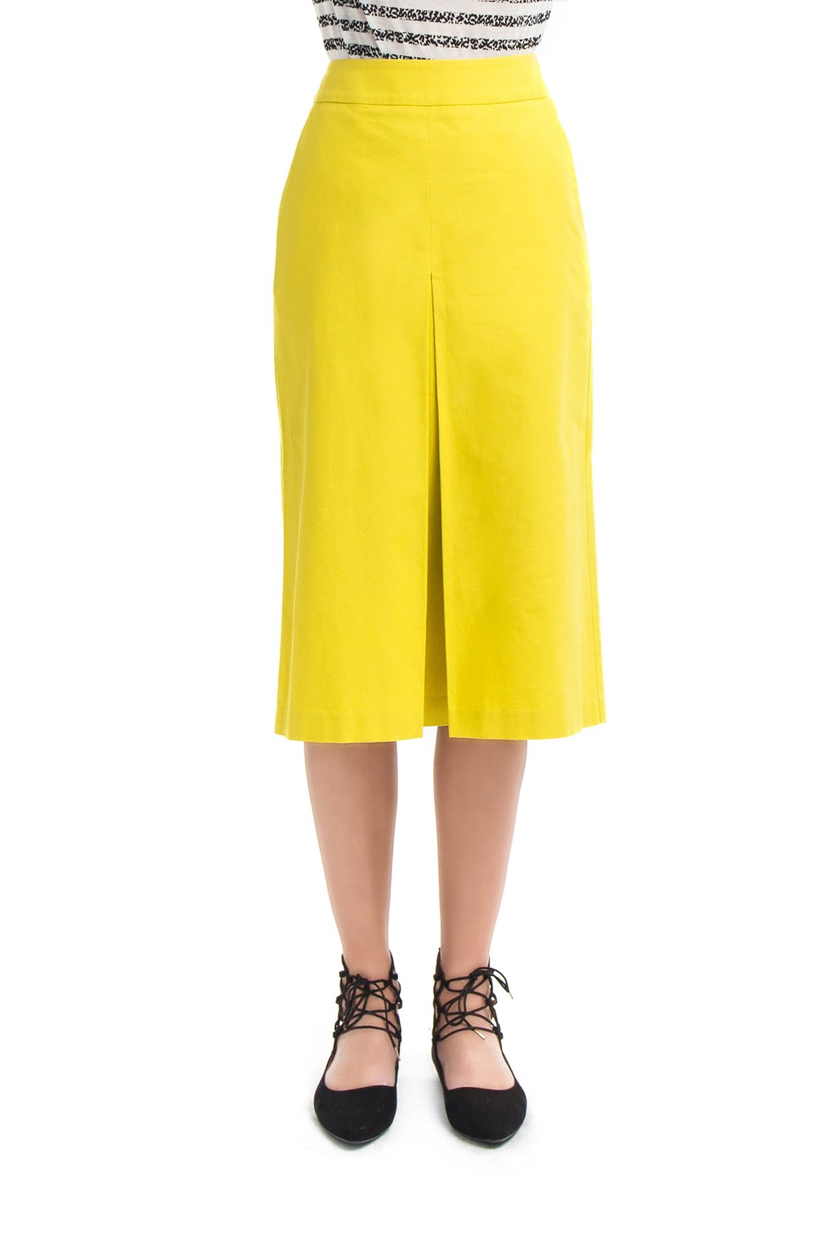 Хлопковая юбка желтого оттенка с разрезом спереди. Модель с высокой посадкой на поясе. Изделие слегка расклешенного силуэта с боковыми карманами.