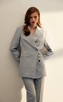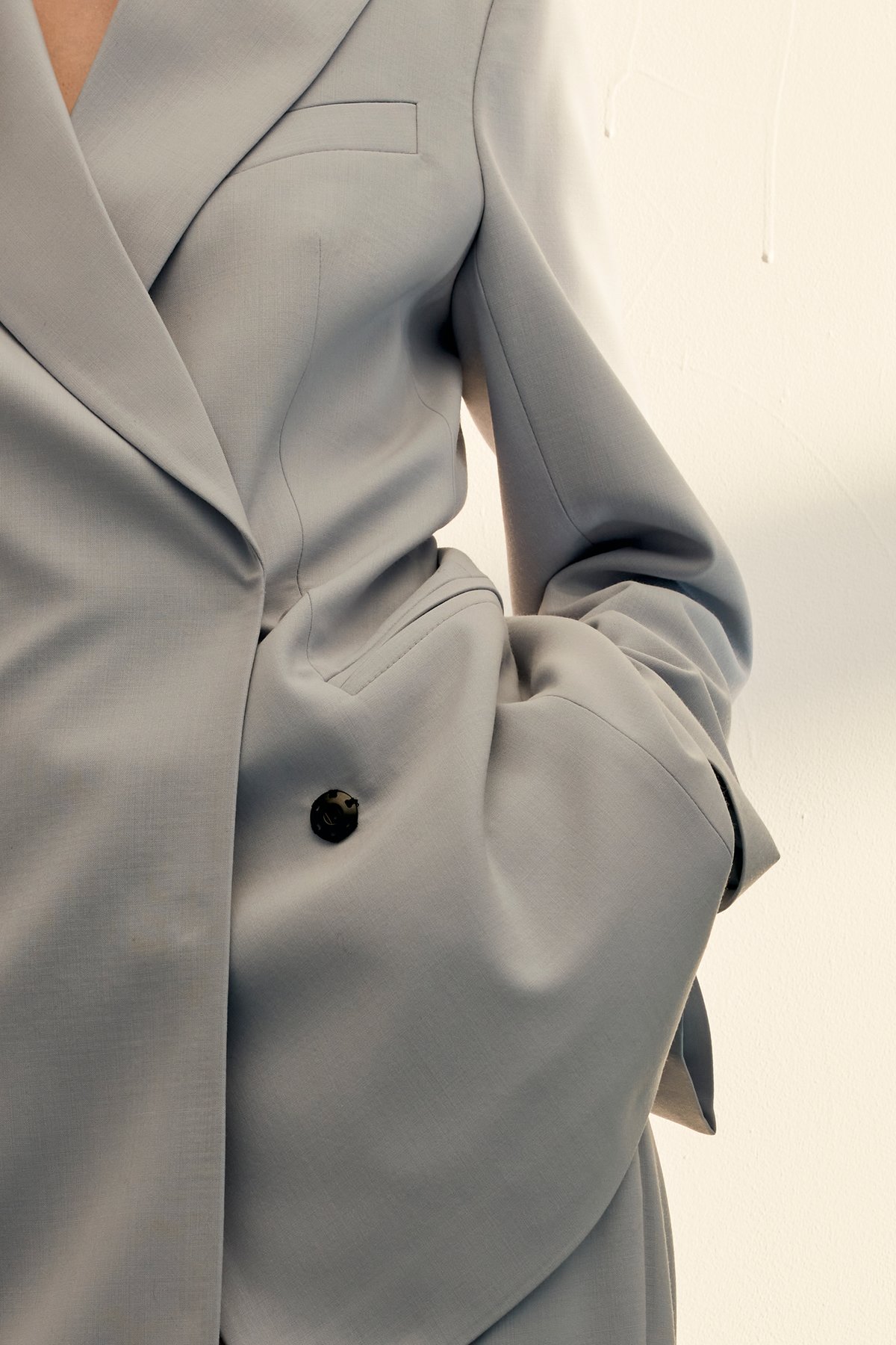 Жакет из тонкой костюмной шерсти нежного серо-голубого оттенками. Изделие с застежкой на потайные кнопки. Фотомодель: 82-58- 88, рост 175, надет размер XS