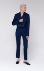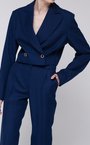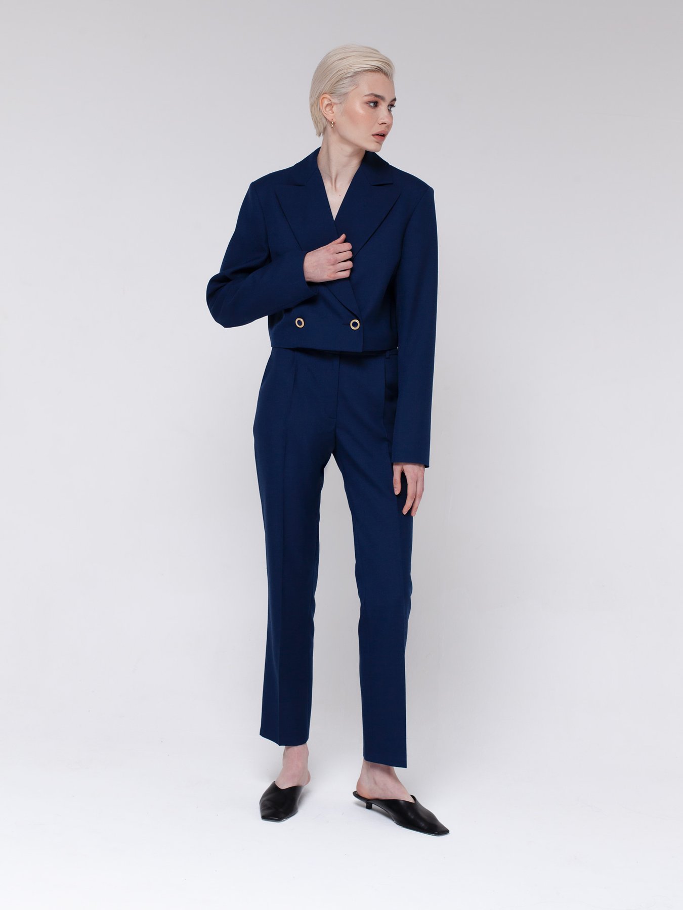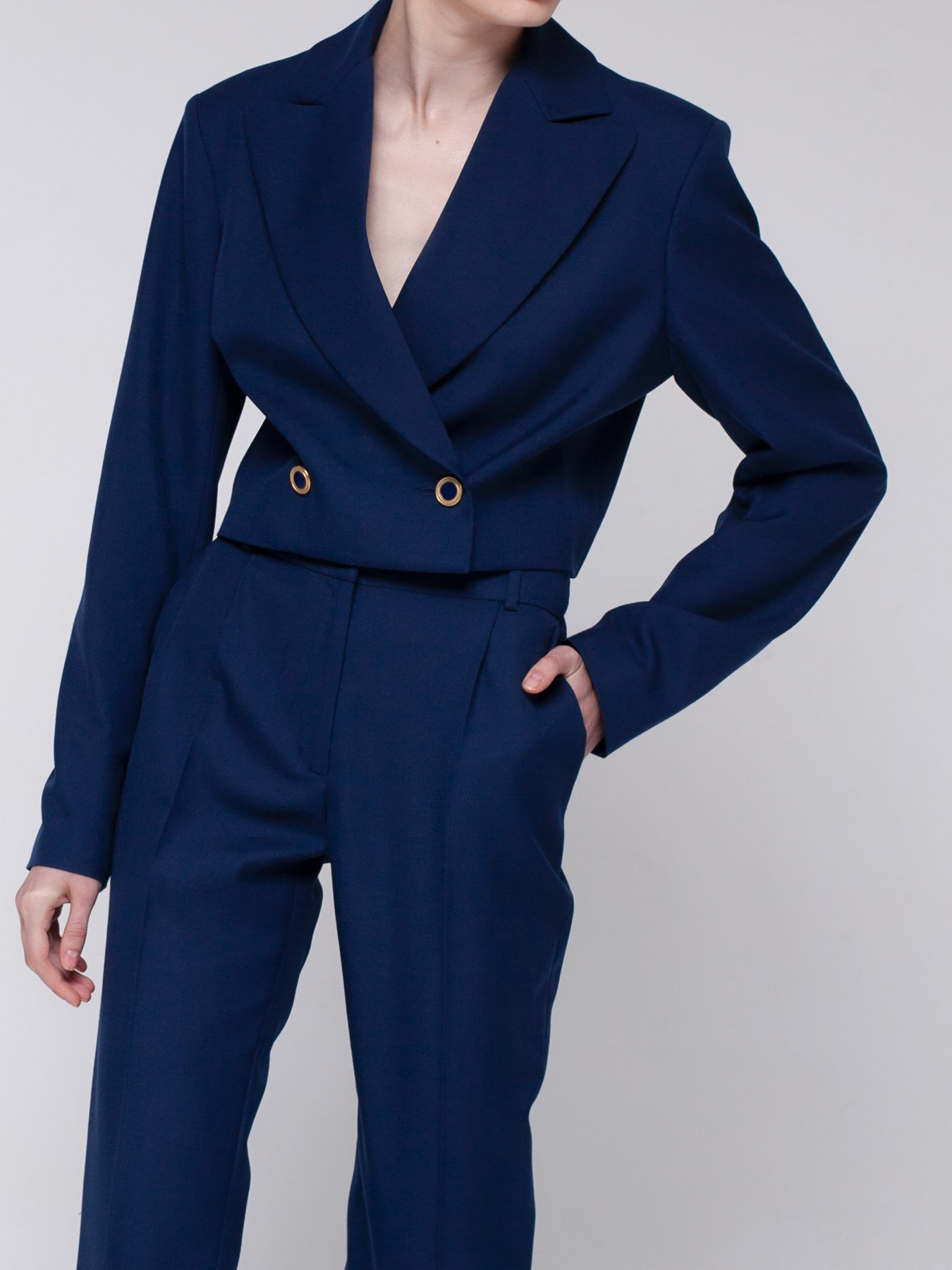 Укороченный жакет из итальянской костюмной ткани глубокого синего оттенка. Двубортная модель, широкие лацканы, металлические пуговицы золотого оттенка.