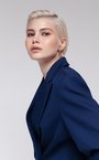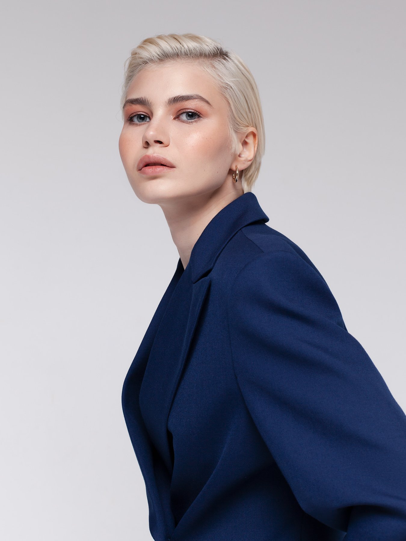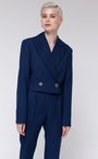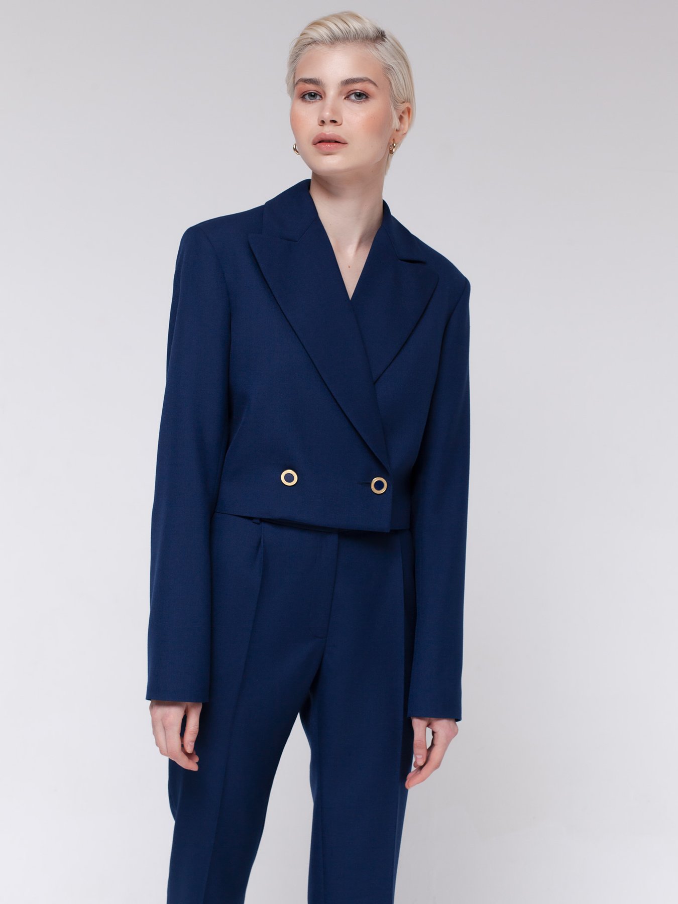 Кроп-жакет синего оттенка с металлическими пуговицами.