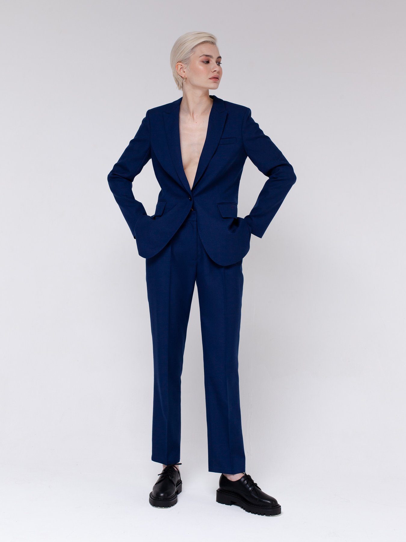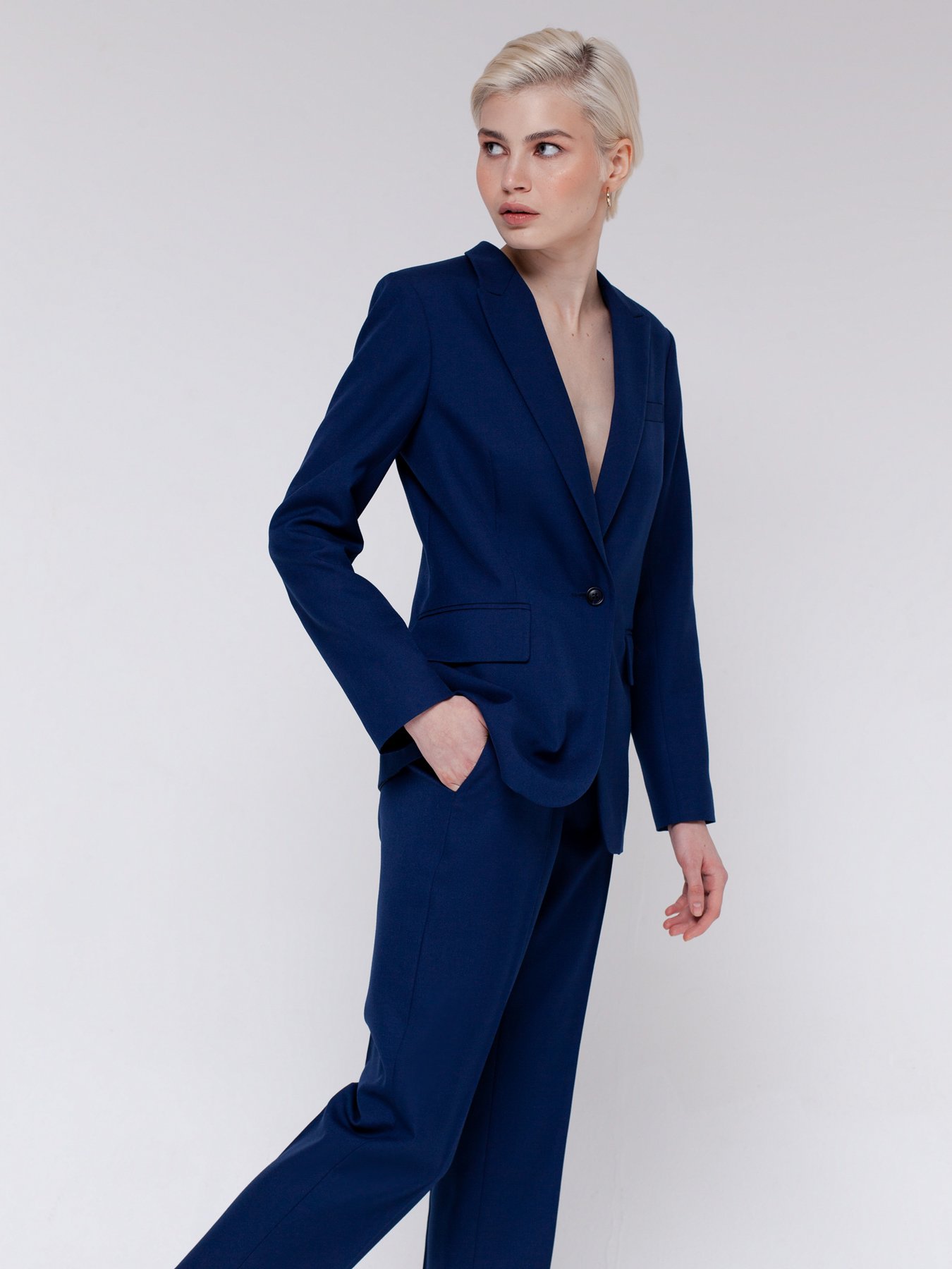 Однобортный жакет из итальянкой костюмной шерстяной ткани глубокого синего оттенка. Боковые клапаны.