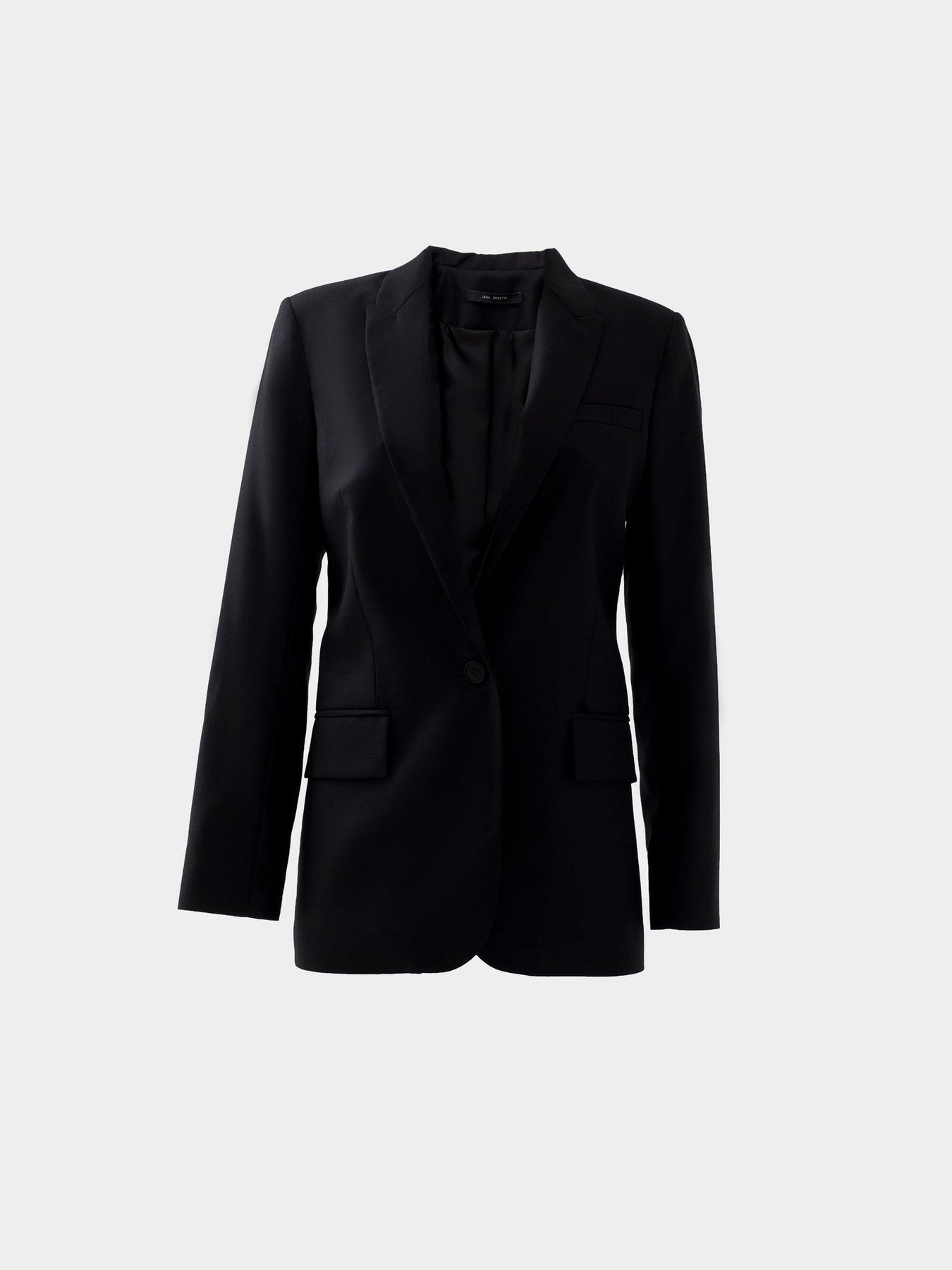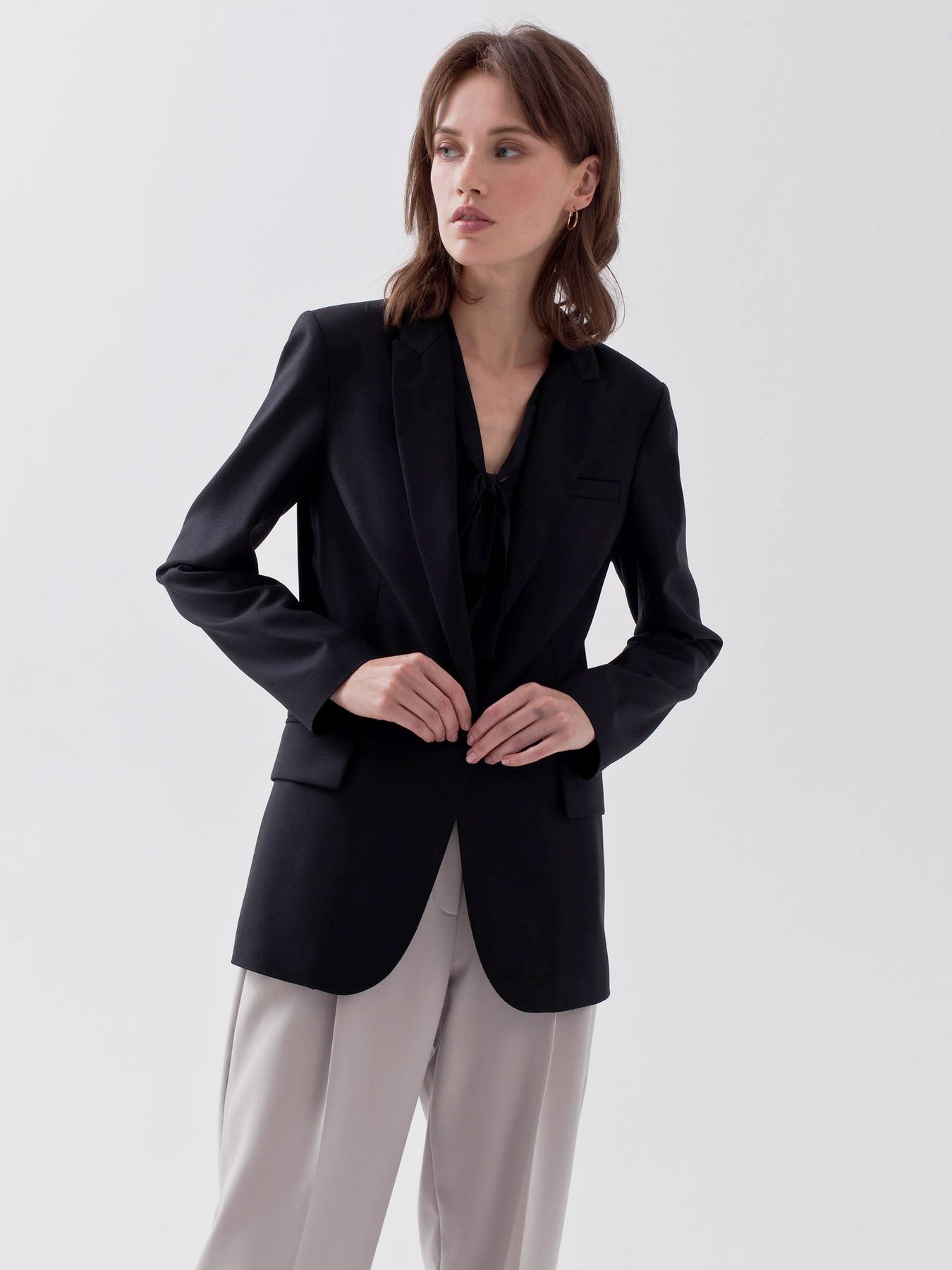 Однобортный жакет из черной костюмной шерстяной ткани. Чуть приталенная модель с застежкой на одну пуговицу, дополненная прорезными карманами с клапанами.