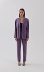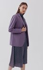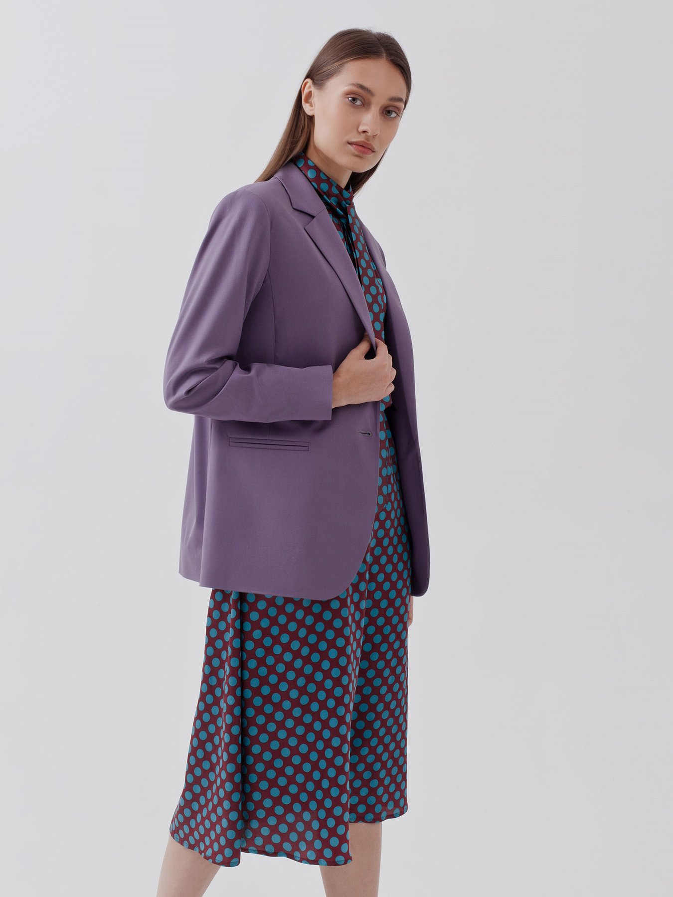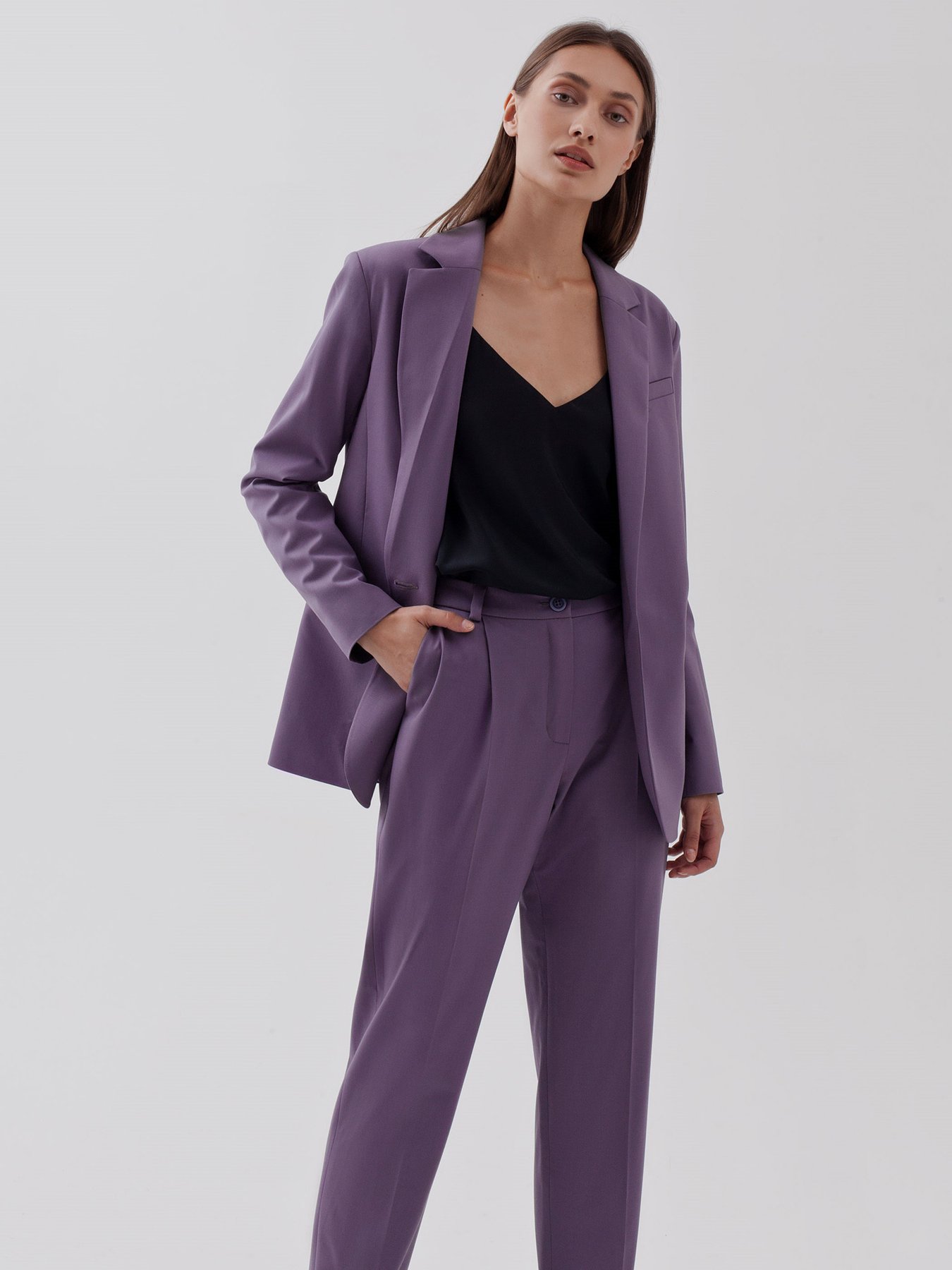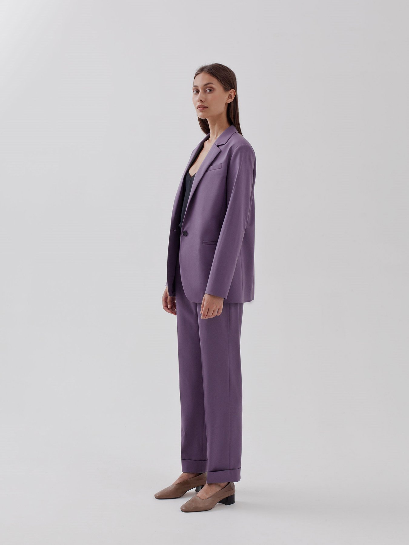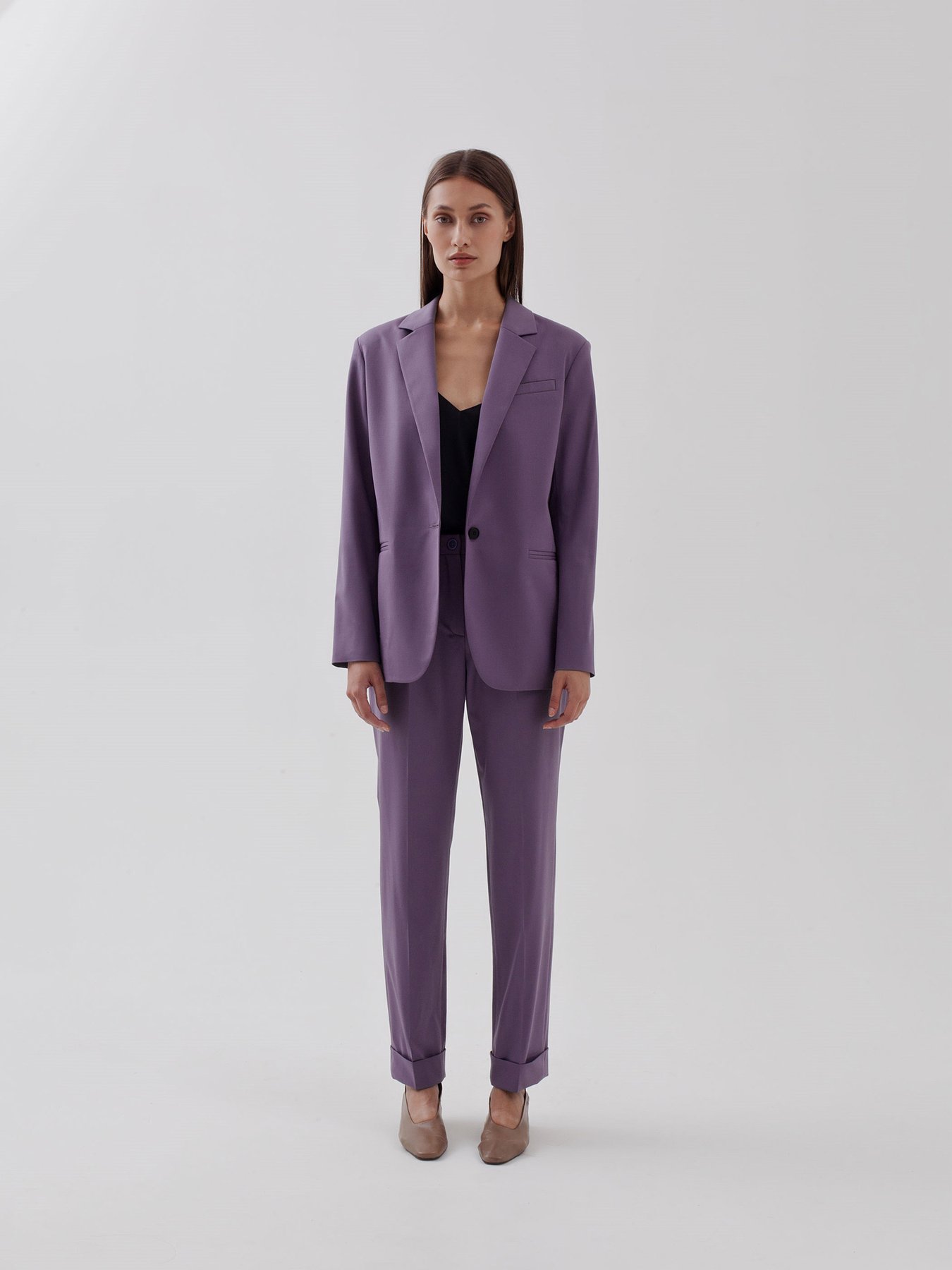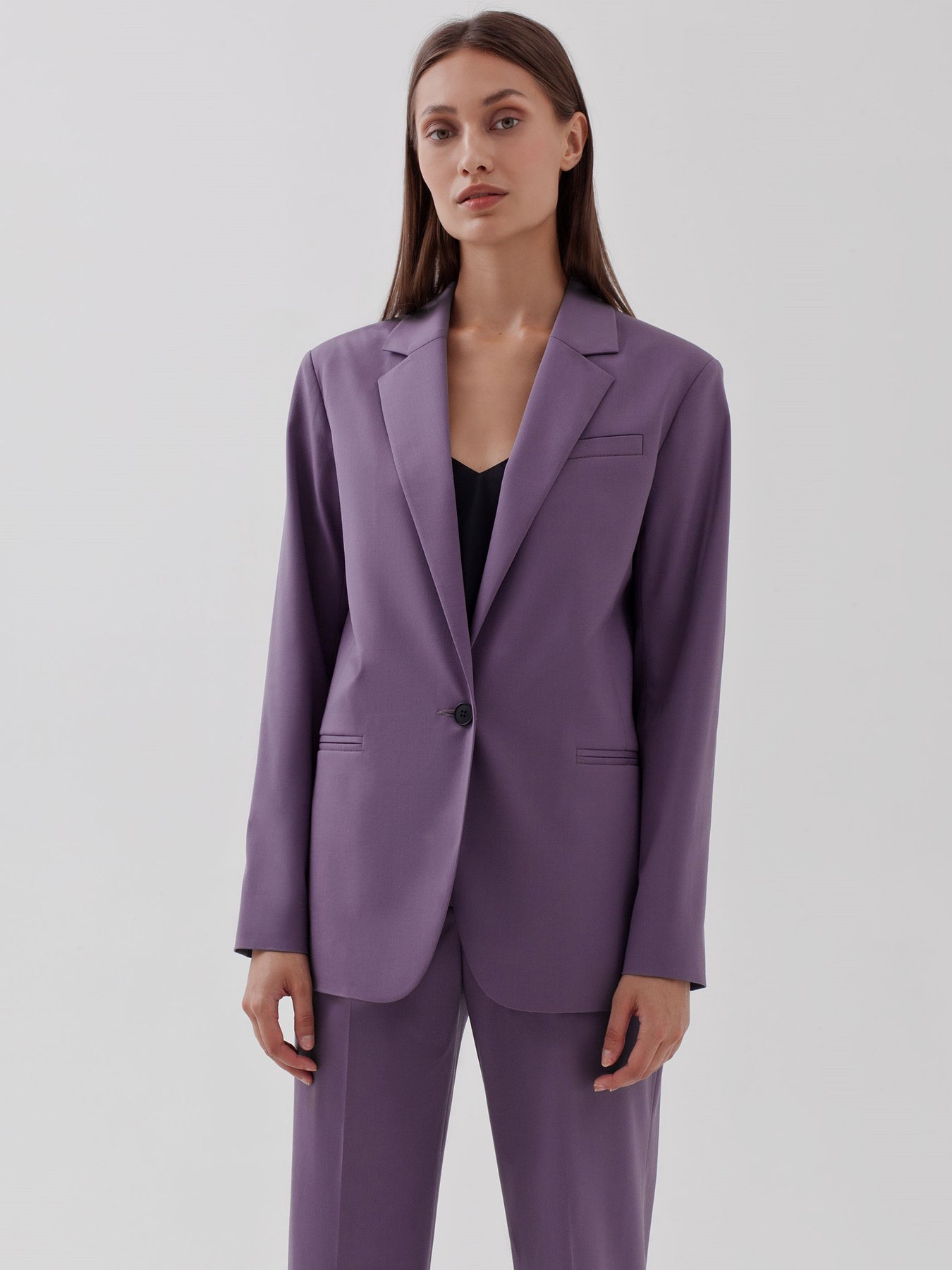 Однобортный жакет с застежкой на одну пуговицу, выполнен из итальянской костюмной шерсти сиреневого цвета. Подклад основного оттенка.